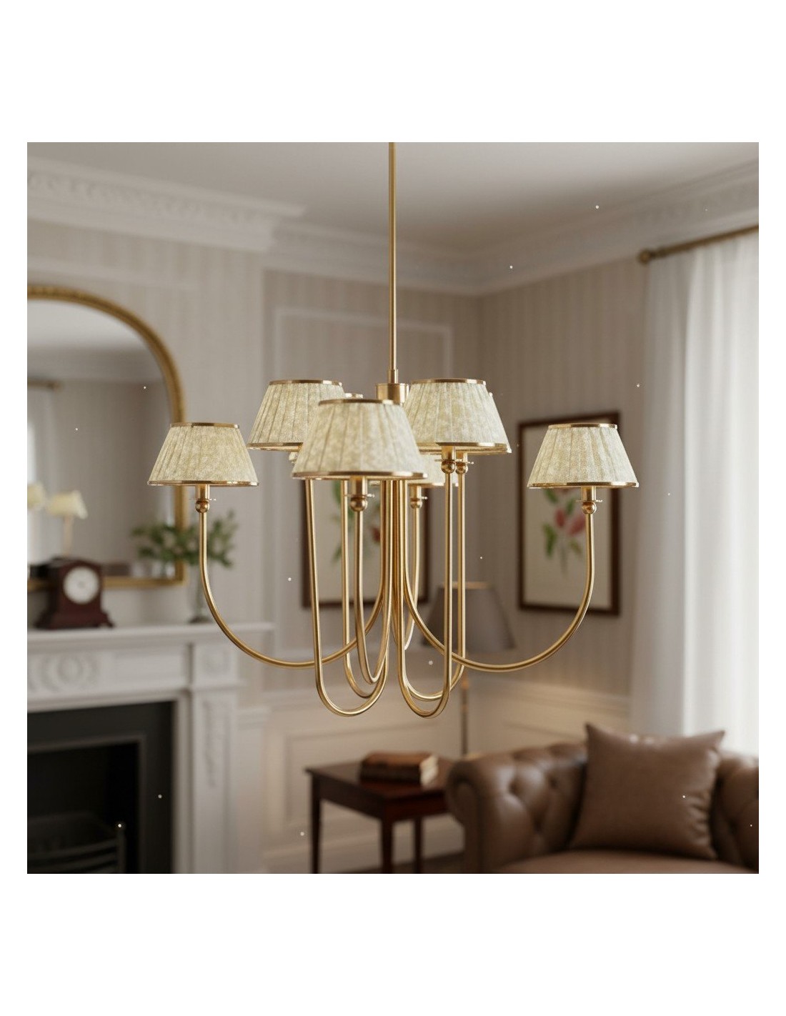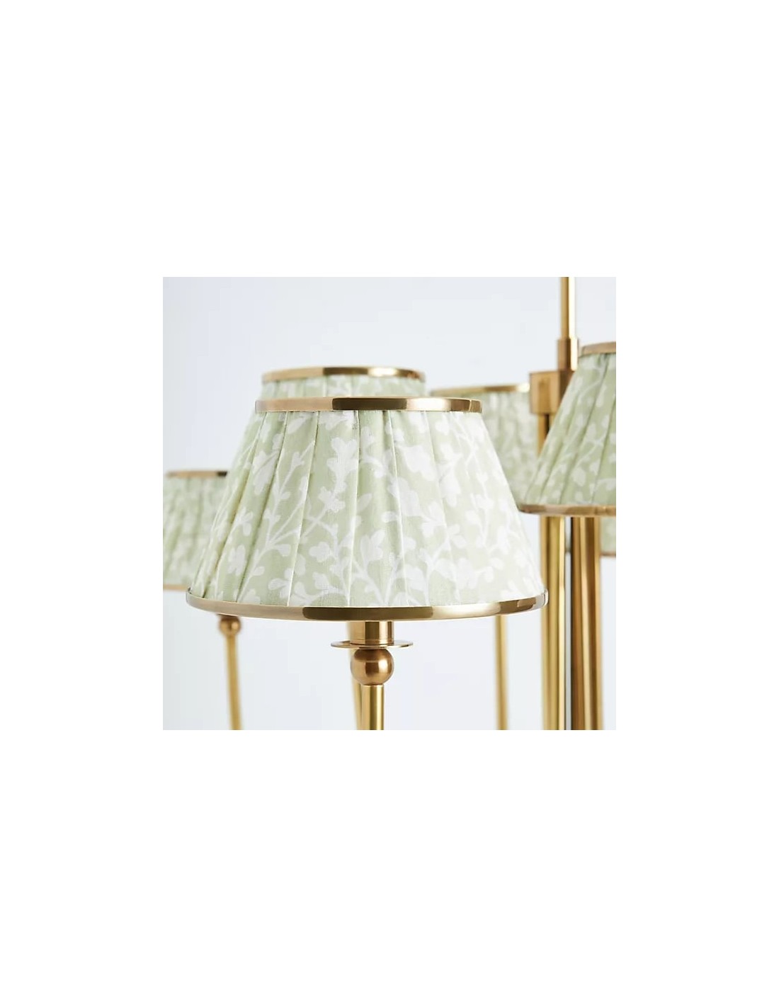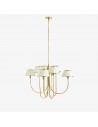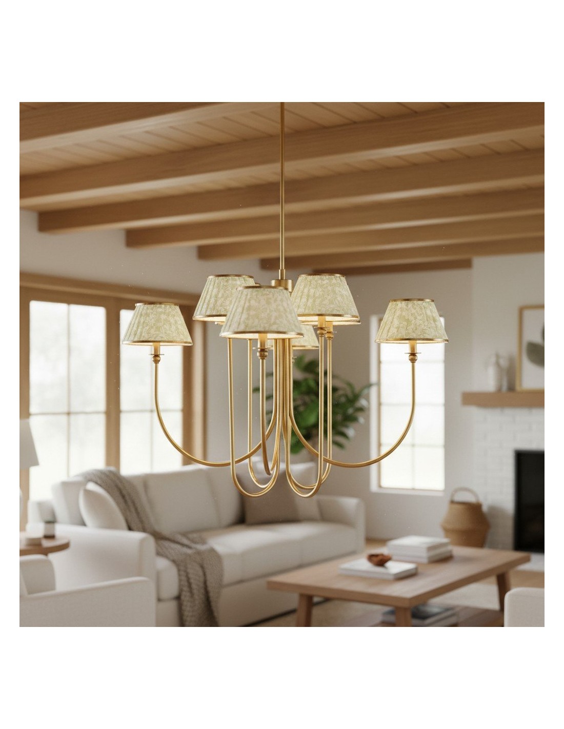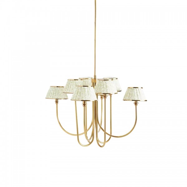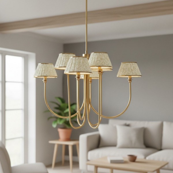 Esta lámpara de araña Ruchee combina una cálida estructura de latón con pantallas de tela estampada con suaves frunces, dispuestas como pétalos en cascada, creando una luz suave y difusa con una silueta elegante. Su generosa envergadura y su presencia escultural la convierten en una pieza central impactante, perfecta para comedores, salas de estar o recibidores.