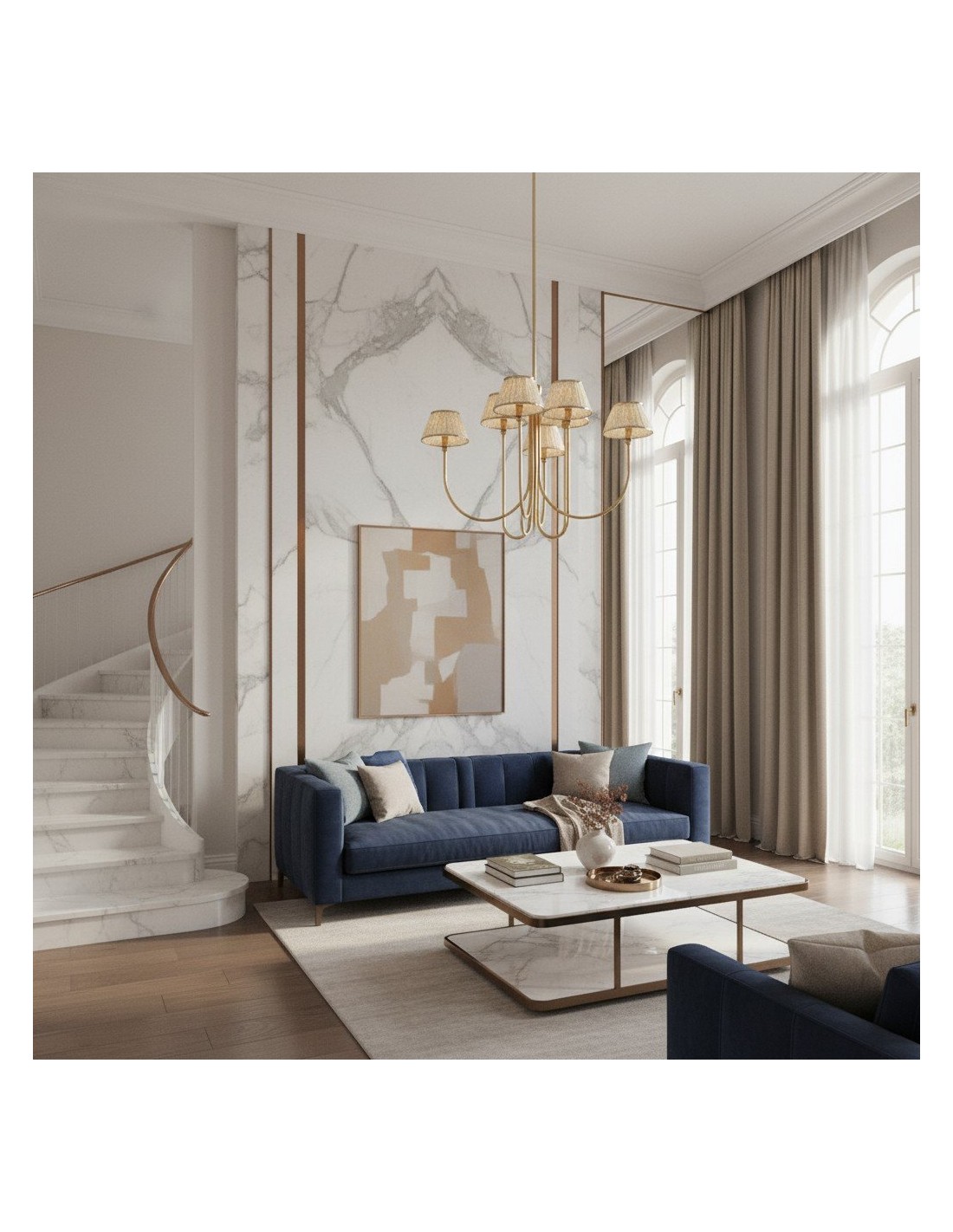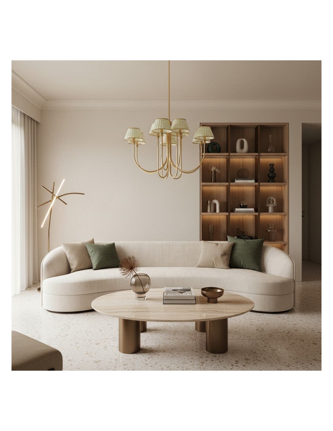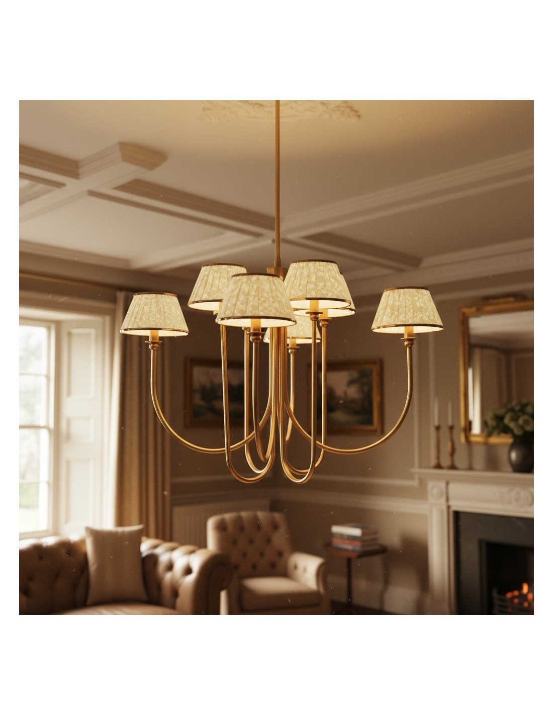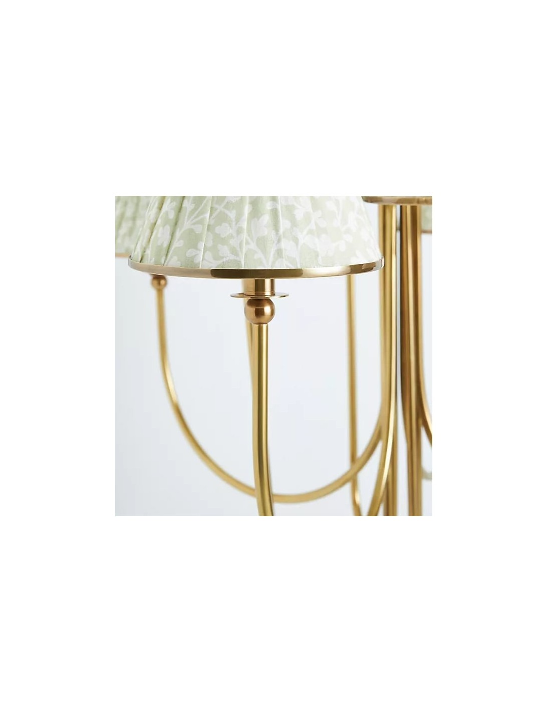 Esta lámpara de araña Ruchee combina una cálida estructura de latón con pantallas de tela estampada con suaves frunces, dispuestas como pétalos en cascada, creando una luz suave y difusa con una silueta elegante. Su generosa envergadura y su presencia escultural la convierten en una pieza central impactante, perfecta para comedores, salas de estar o recibidores.