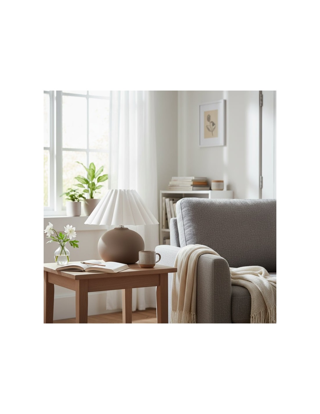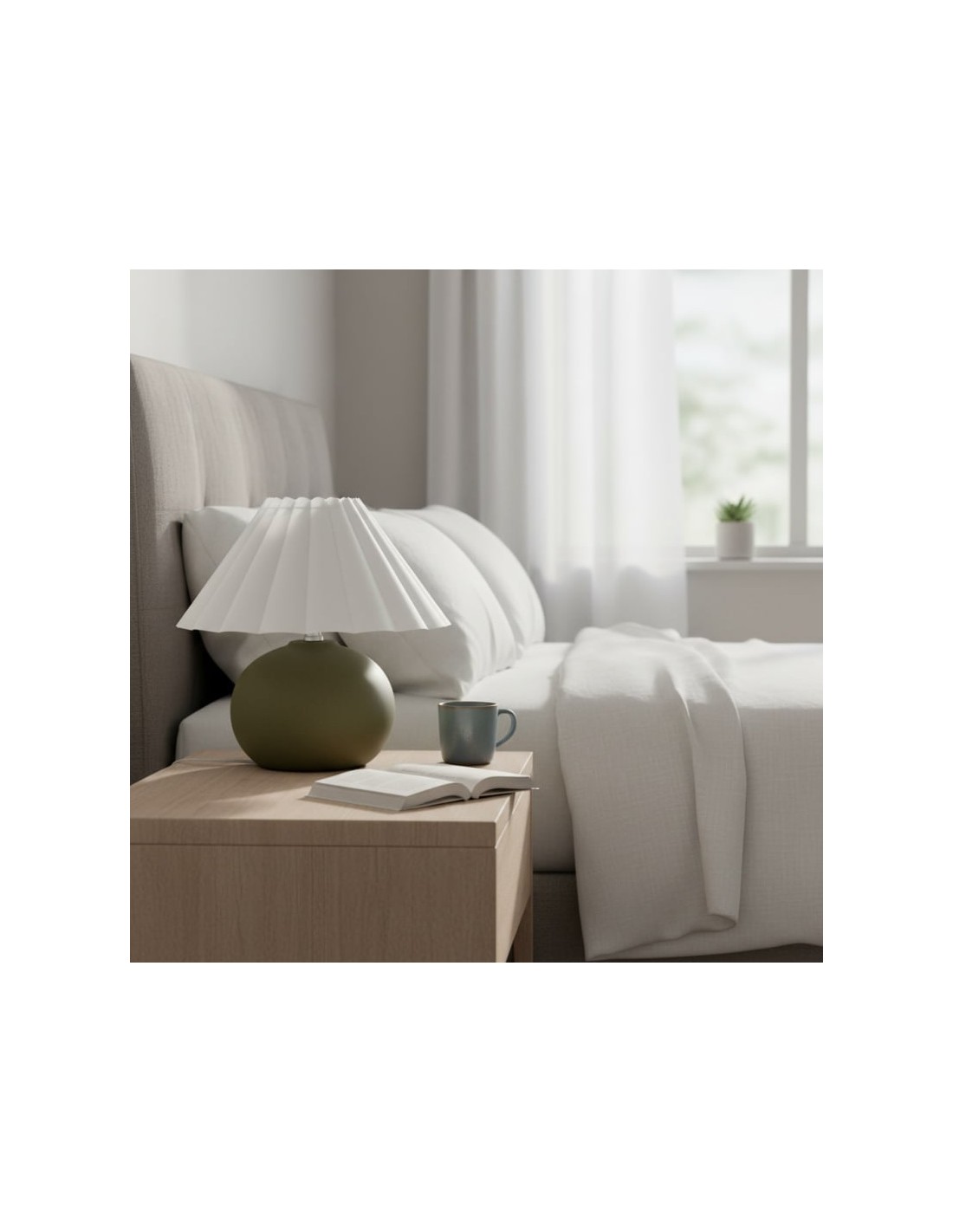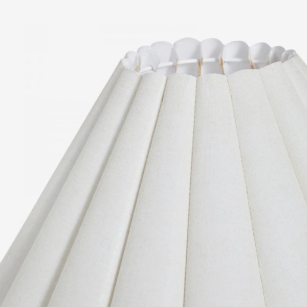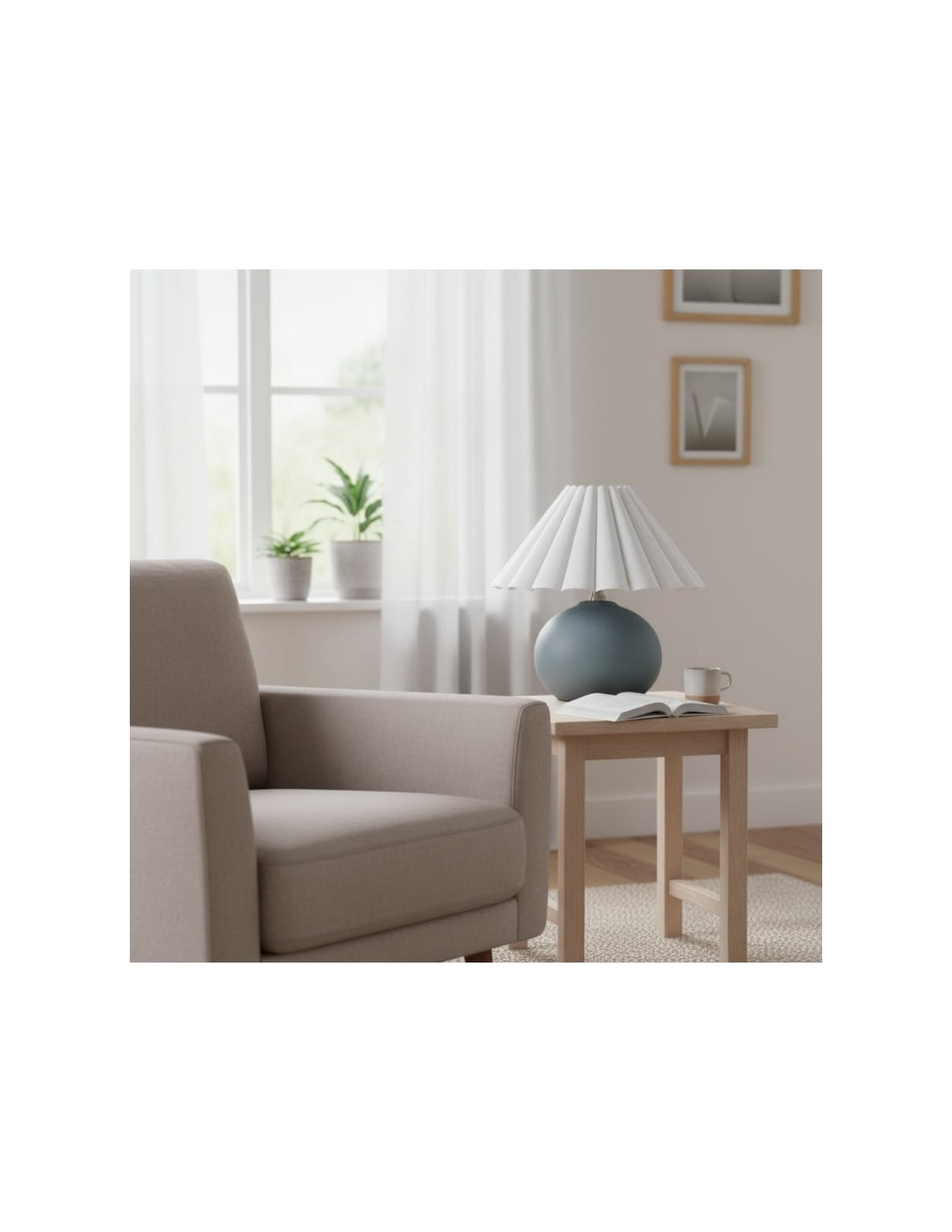 La lámpara de mesa cuenta con una base redondeada de cerámica y una pantalla de tela plisada, que le otorga un aspecto escultural y atemporal. Su diseño transicional se adapta a dormitorios, oficinas en casa o salones, proporcionando una iluminación cálida y ambiental. Compacta y versátil, realza mesas auxiliares, escritorios o mesitas de noche con su elegante simplicidad.