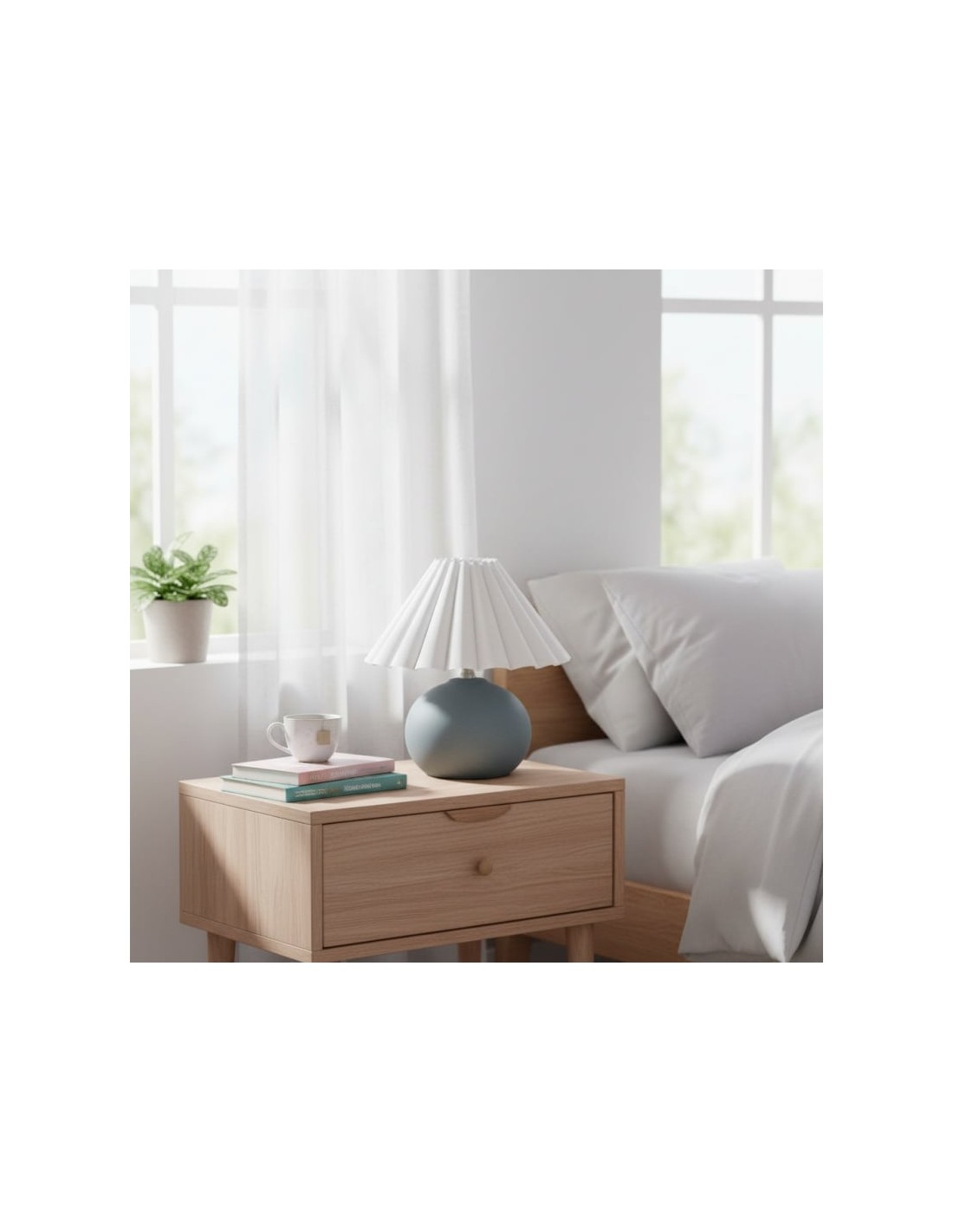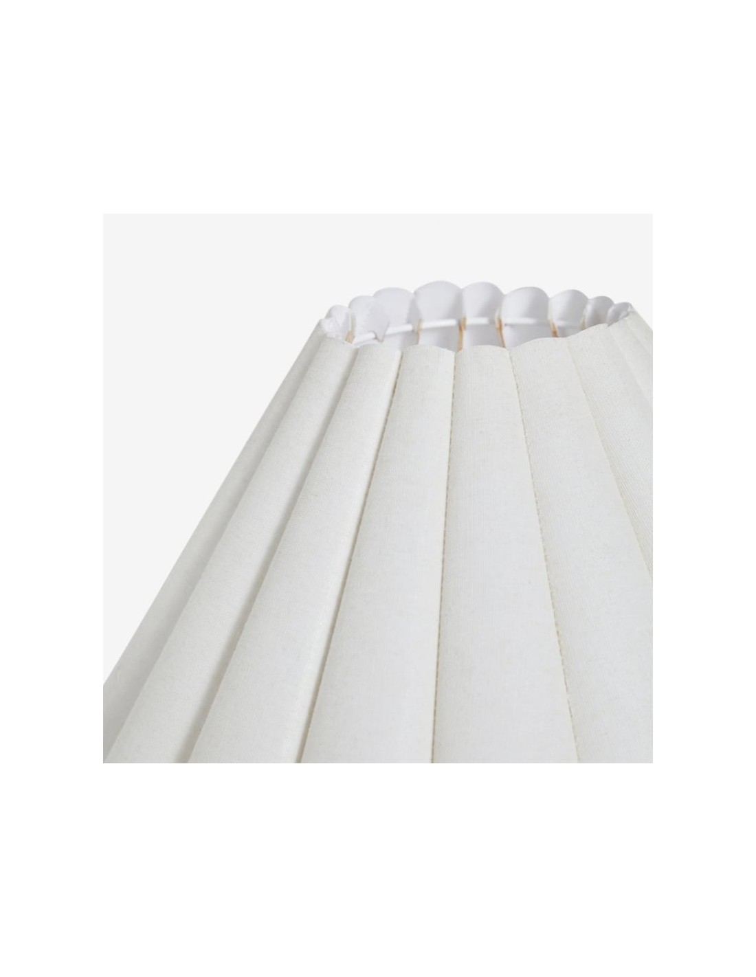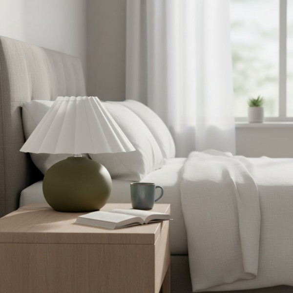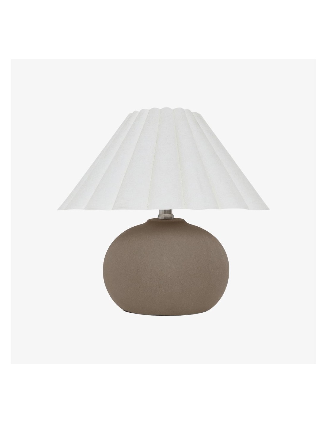 La lámpara de mesa cuenta con una base redondeada de cerámica y una pantalla de tela plisada, que le otorga un aspecto escultural y atemporal. Su diseño transicional se adapta a dormitorios, oficinas en casa o salones, proporcionando una iluminación cálida y ambiental. Compacta y versátil, realza mesas auxiliares, escritorios o mesitas de noche con su elegante simplicidad.