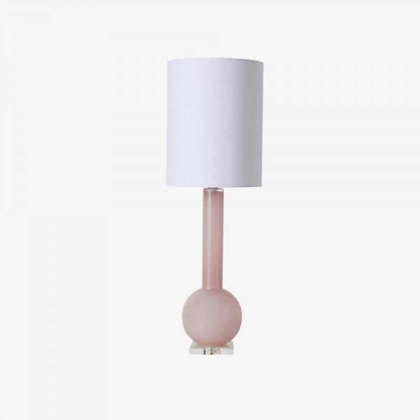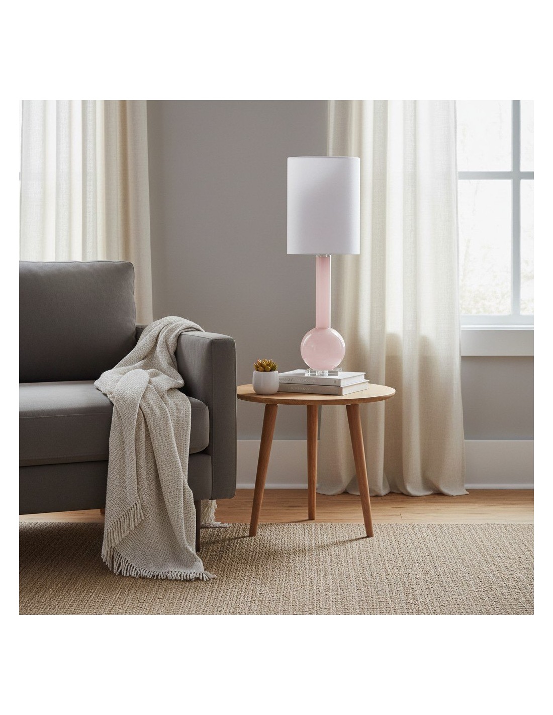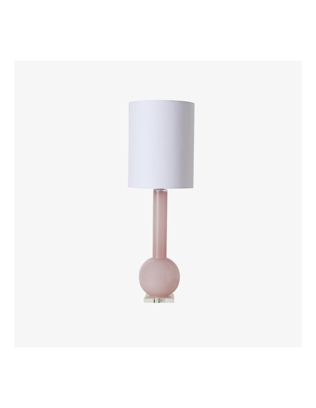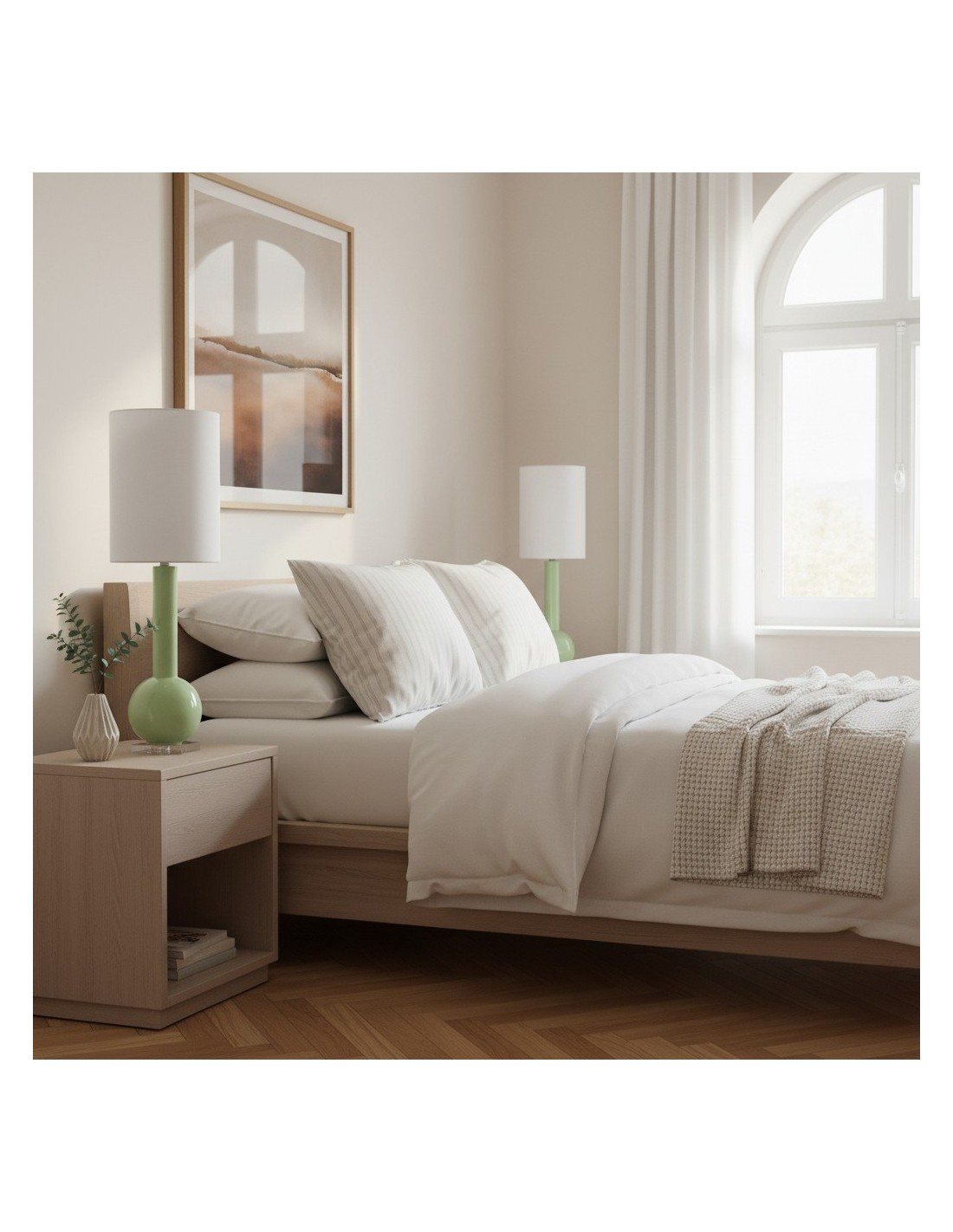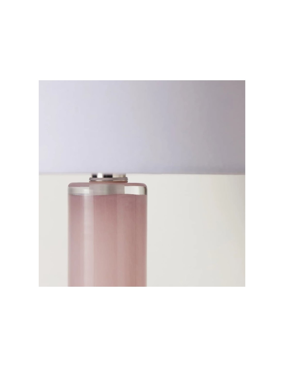 Esta lámpara de mesa combina una base de vidrio esculpido con una pantalla de tela suave que proyecta una luz cálida y delicada. Su forma limpia y moderna aporta sutil altura y elegancia a mesas auxiliares, consolas y mesitas de noche, ofreciendo un toque refinado para interiores contemporáneos.