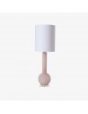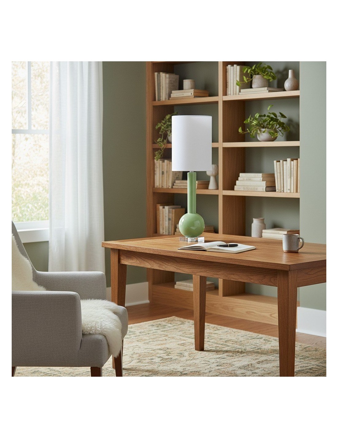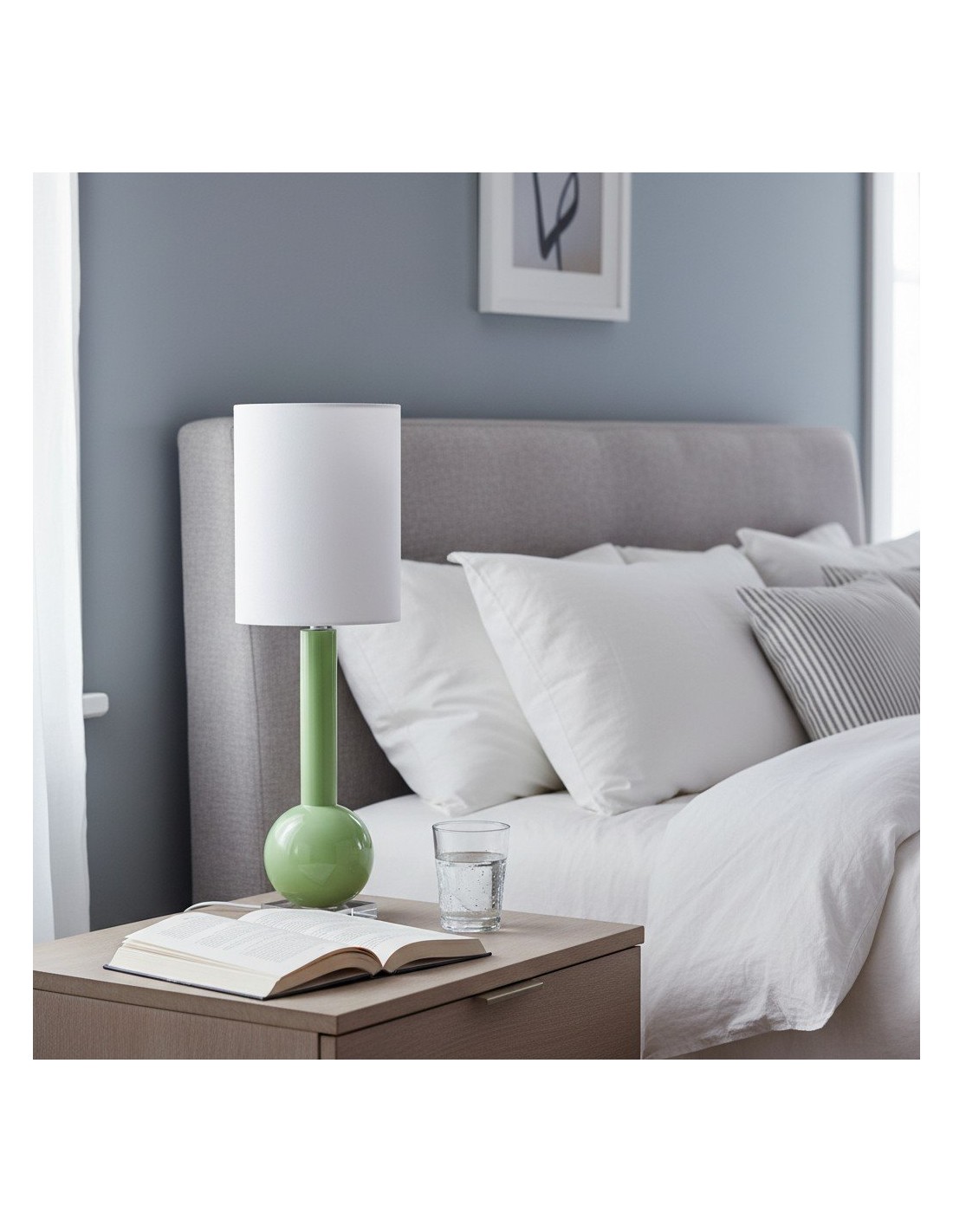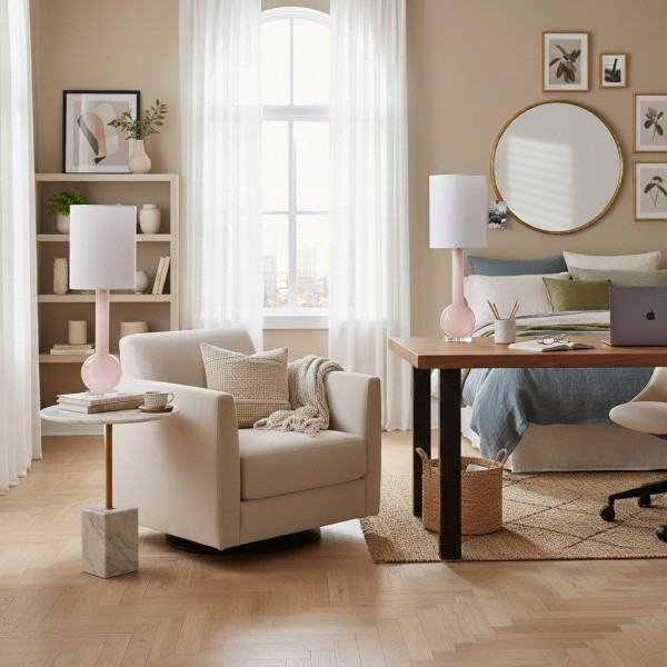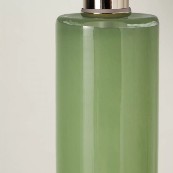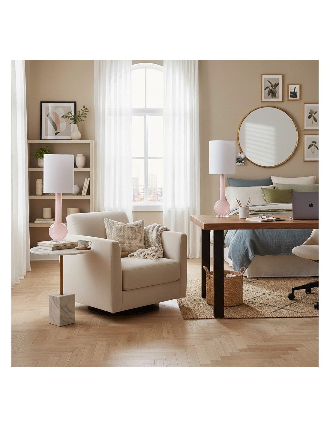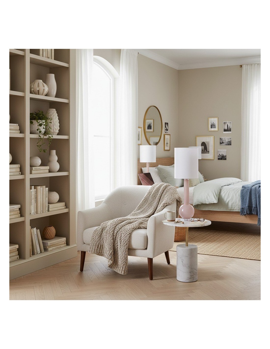 Esta lámpara de mesa combina una base de vidrio esculpido con una pantalla de tela suave que proyecta una luz cálida y delicada. Su forma limpia y moderna aporta sutil altura y elegancia a mesas auxiliares, consolas y mesitas de noche, ofreciendo un toque refinado para interiores contemporáneos.