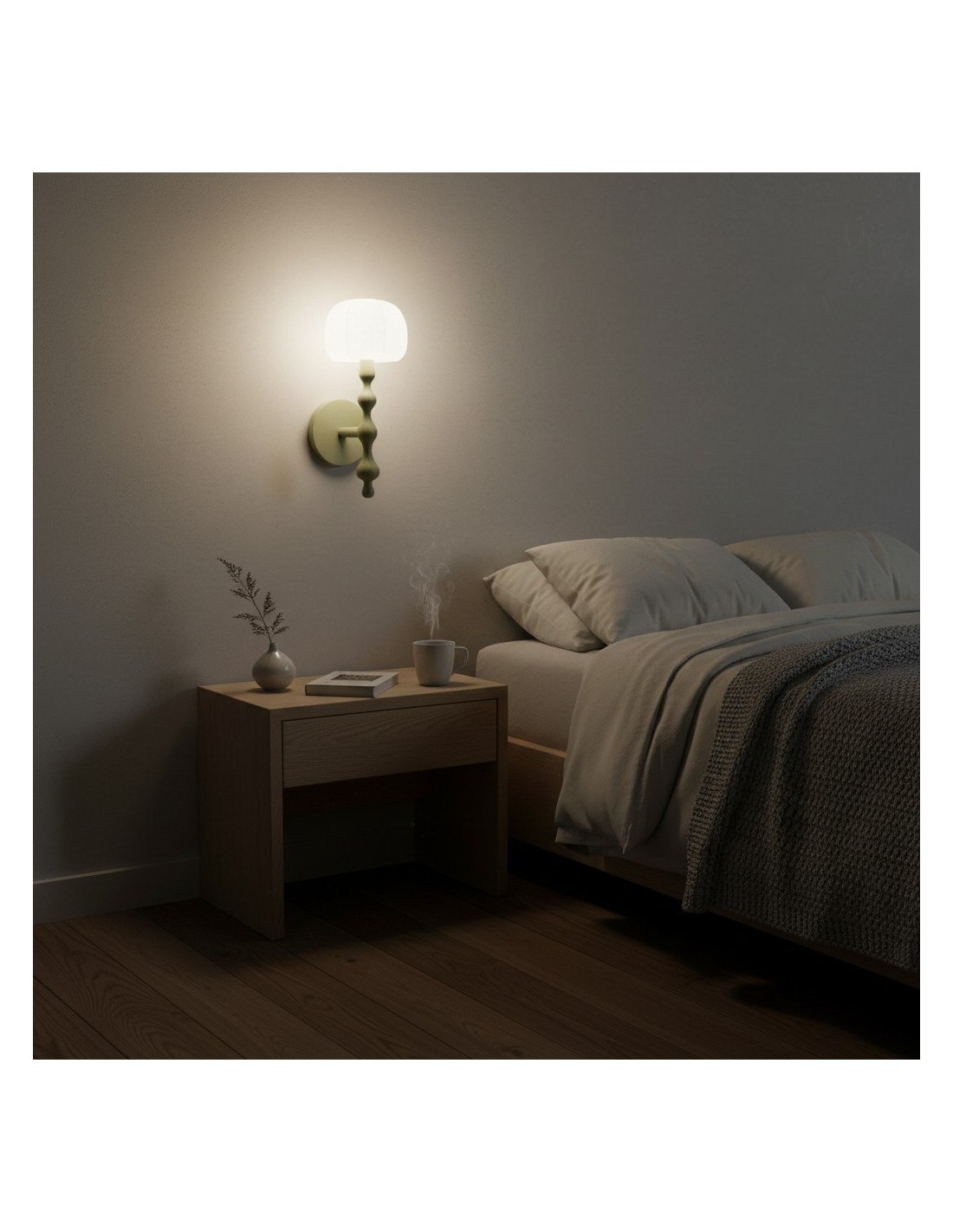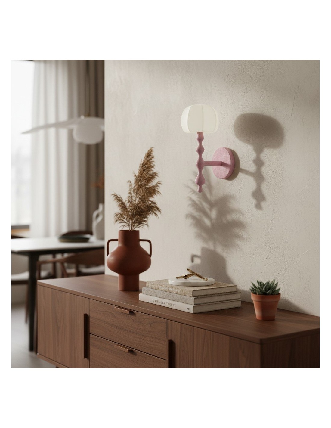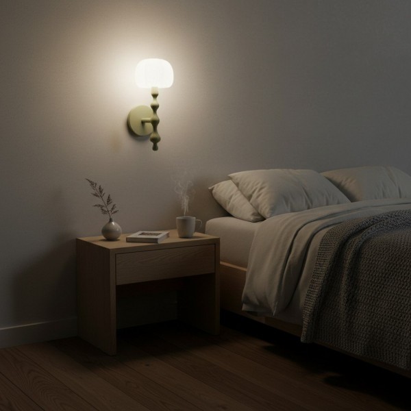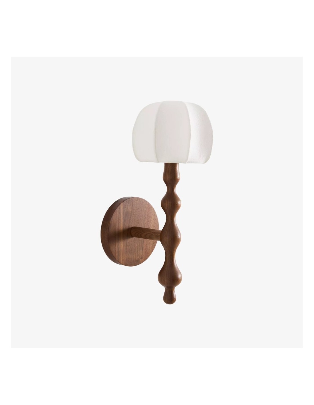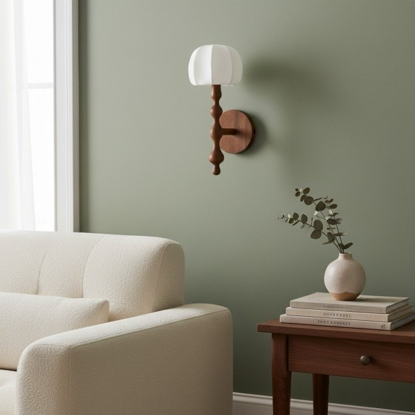 Este aplique de pared presenta una base delicadamente esculpida y una pantalla de tela con forma de capuchón que difunde la luz creando una luz cálida y acogedora. Su forma orgánica aporta una sutil profundidad visual, convirtiéndolo en una opción elegante para pasillos, dormitorios y salas de estar.
