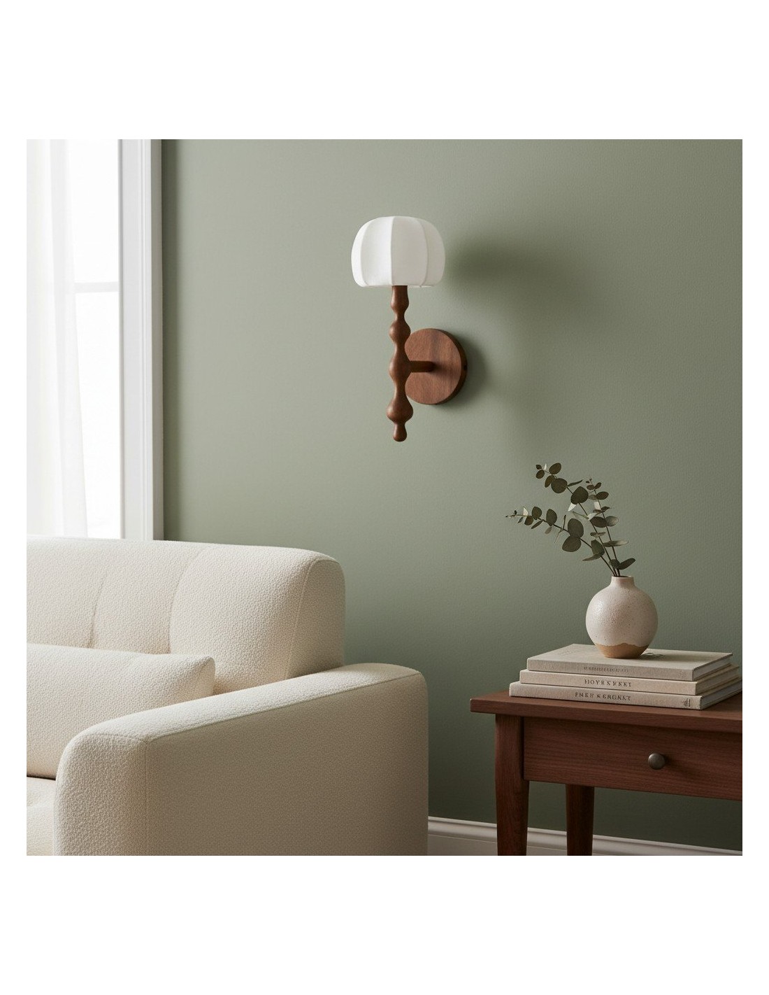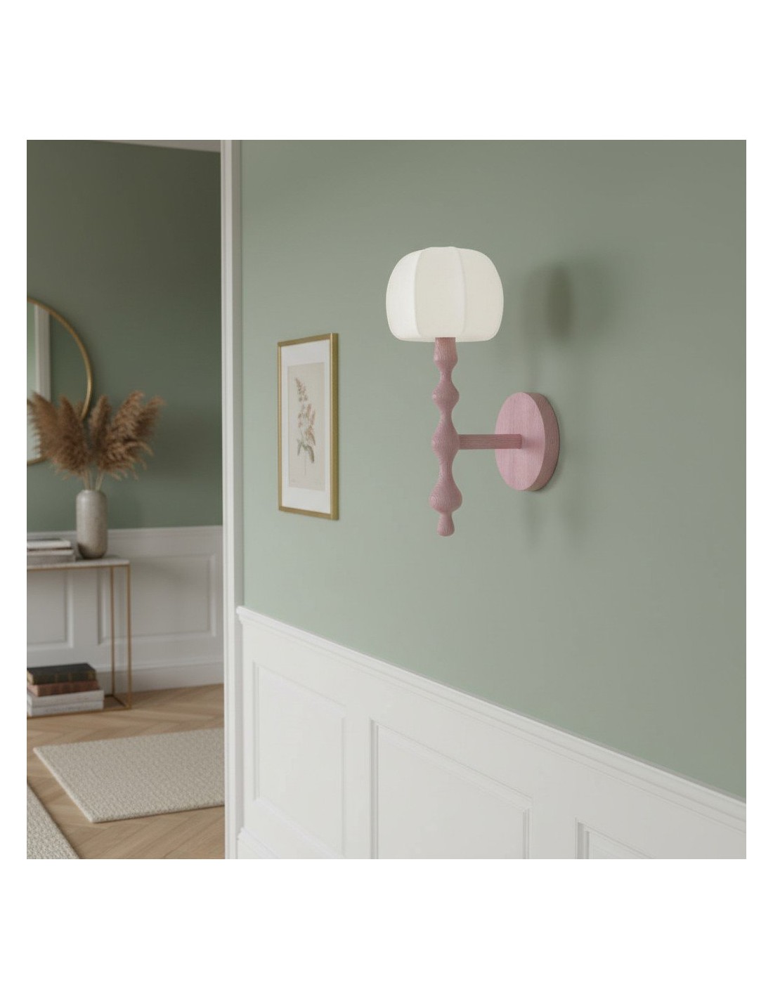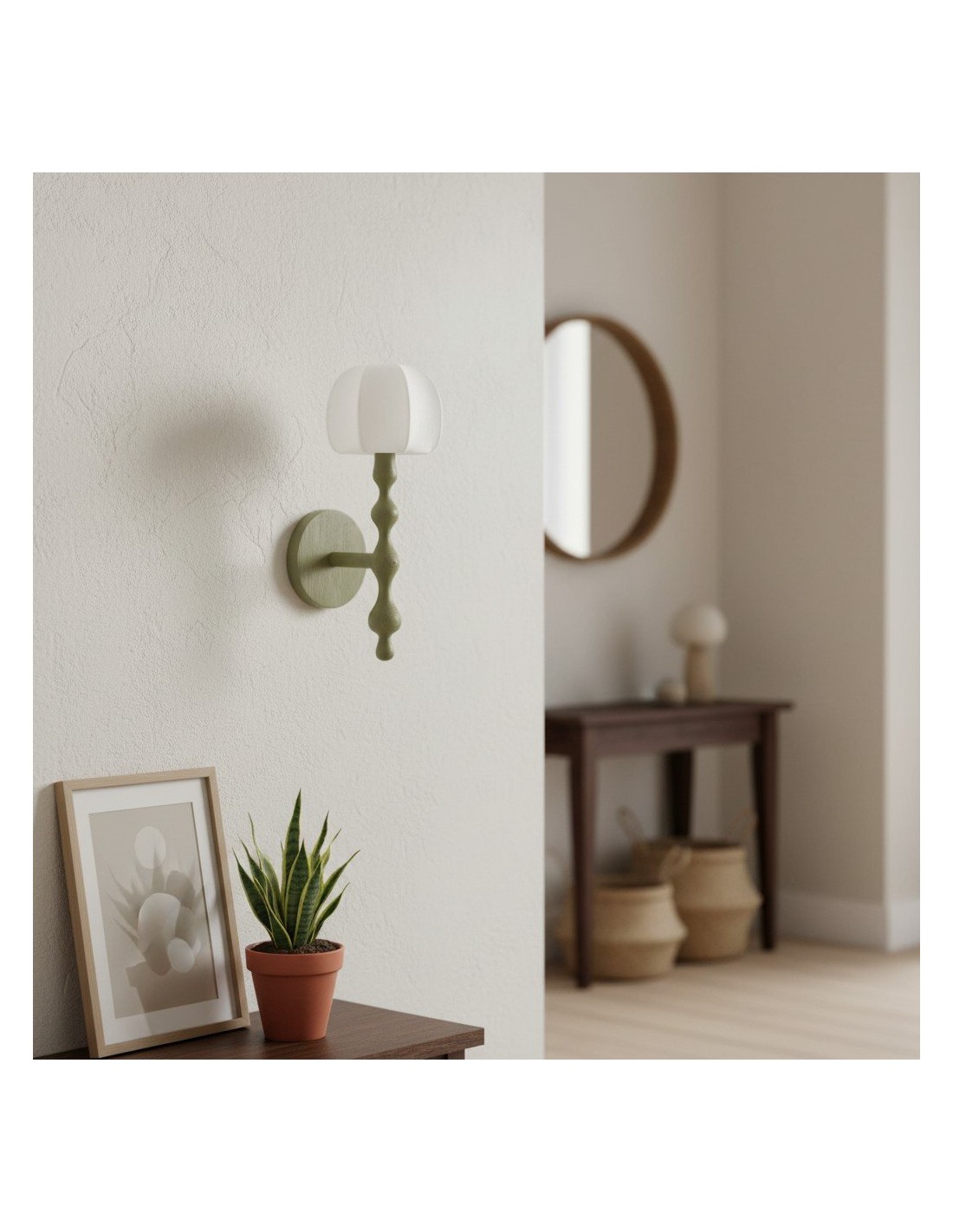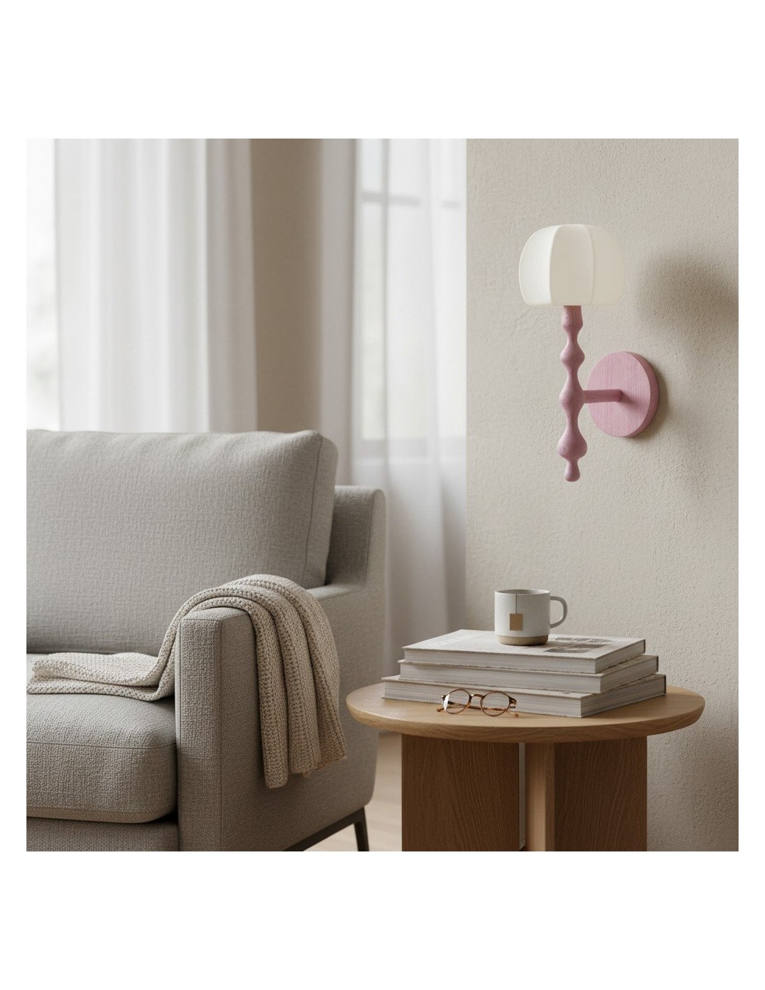 Este aplique de pared presenta una base delicadamente esculpida y una pantalla de tela con forma de capuchón que difunde la luz creando una luz cálida y acogedora. Su forma orgánica aporta una sutil profundidad visual, convirtiéndolo en una opción elegante para pasillos, dormitorios y salas de estar.