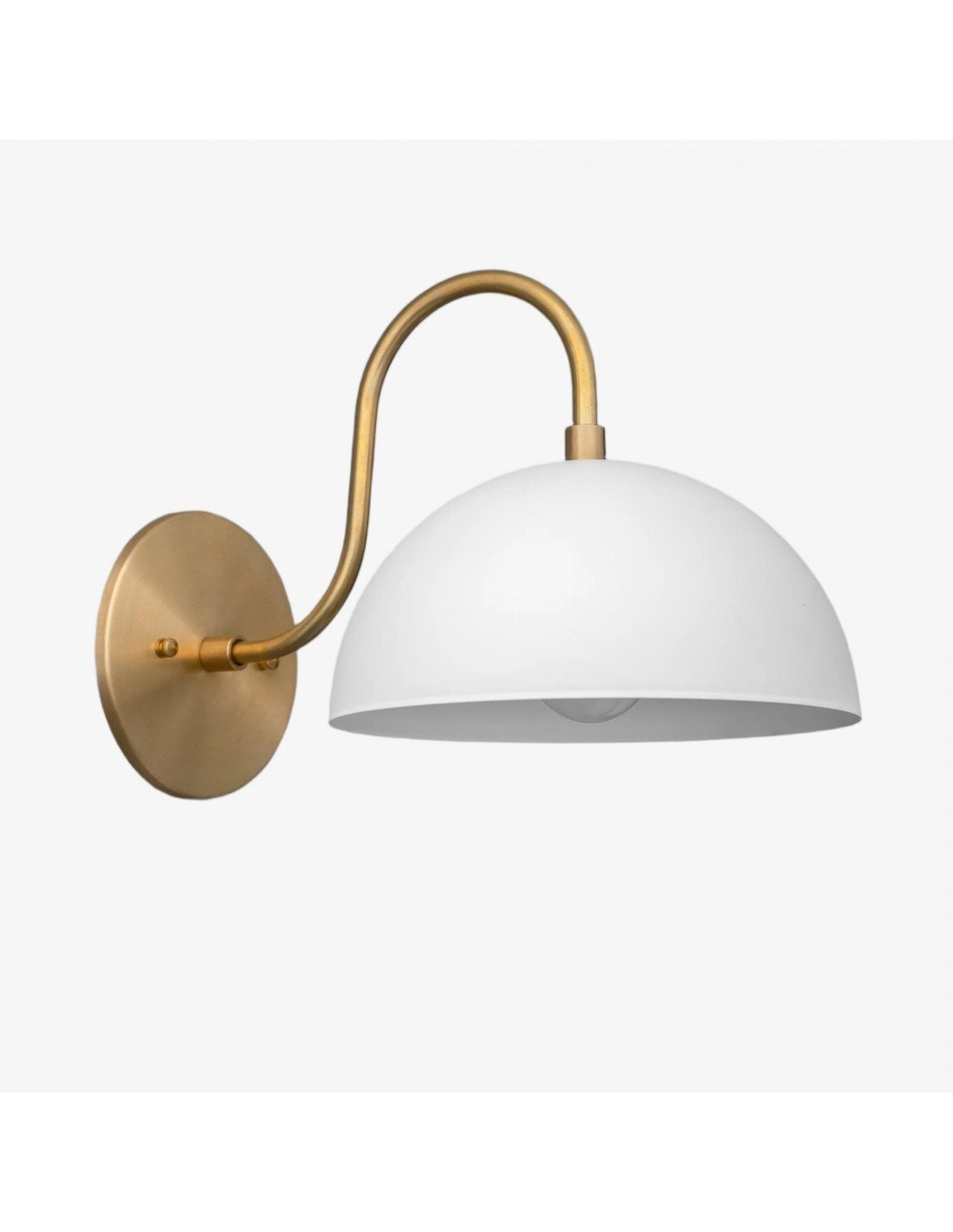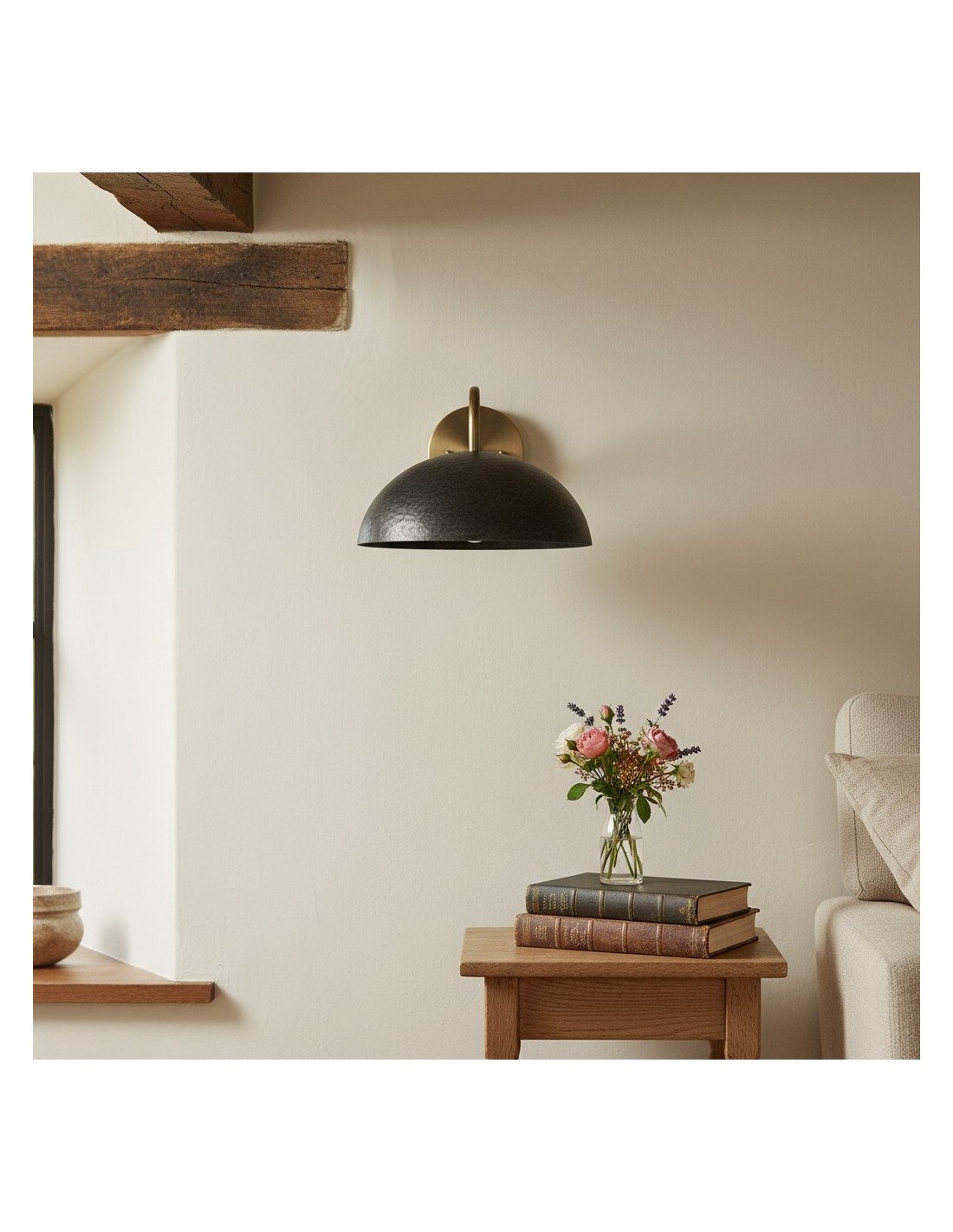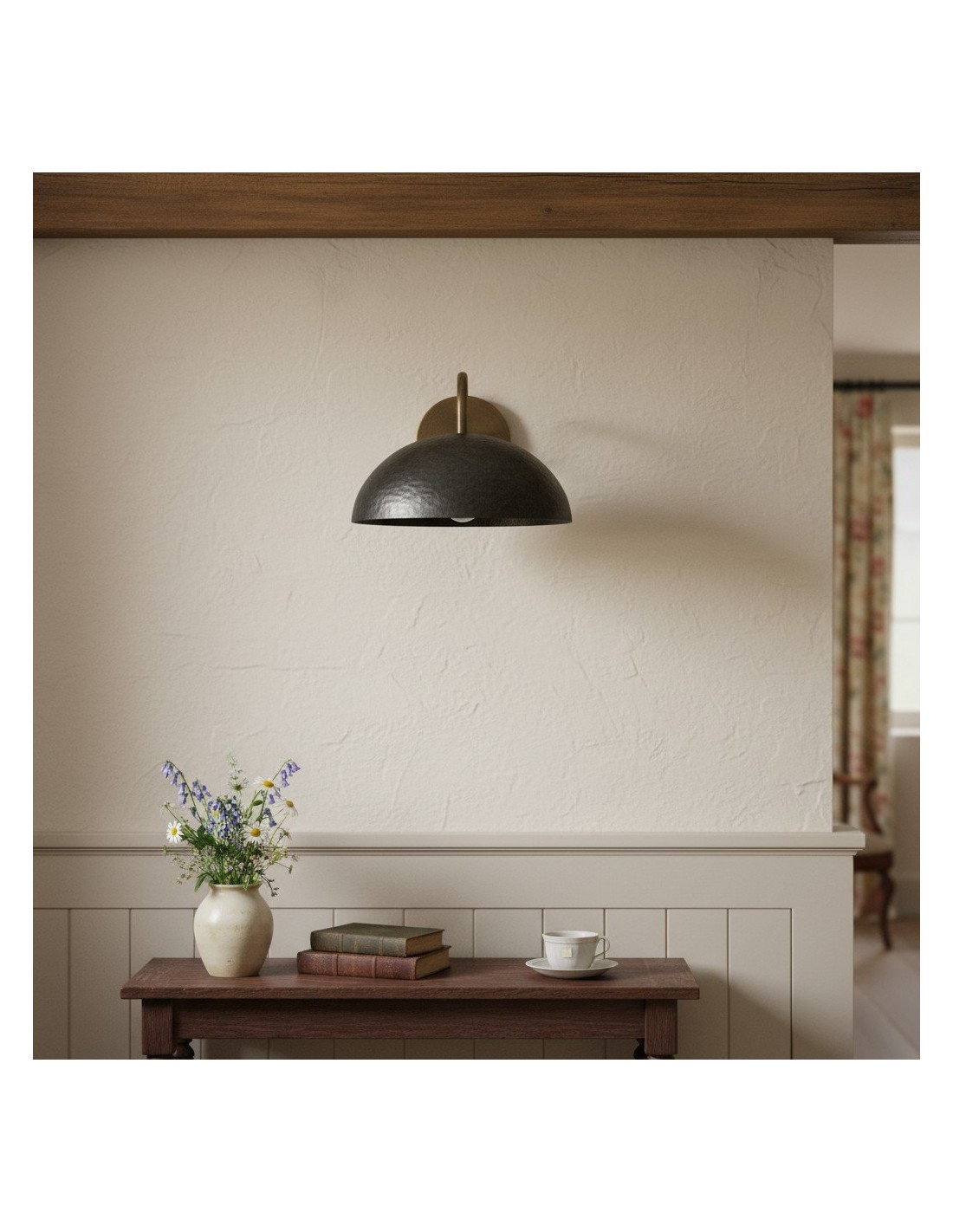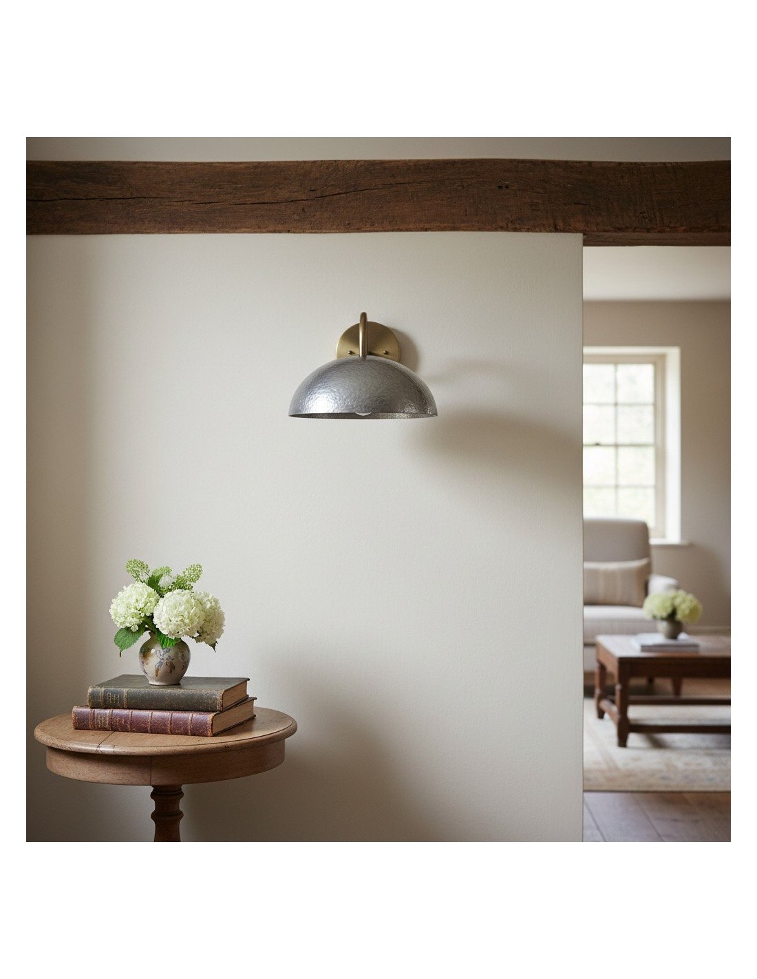 Aporta una elegancia discreta a tu decoración con este versátil aplique de pared. El brazo arqueado de latón sostiene una pantalla abovedada martillada que proyecta una luz sutil y concentrada hacia abajo. Ideal para superponer luces en pasillos, crear un ambiente acogedor junto a la cama o añadir profundidad a los espacios de estar. Una elegante mezcla de influencias modernas y vintage.