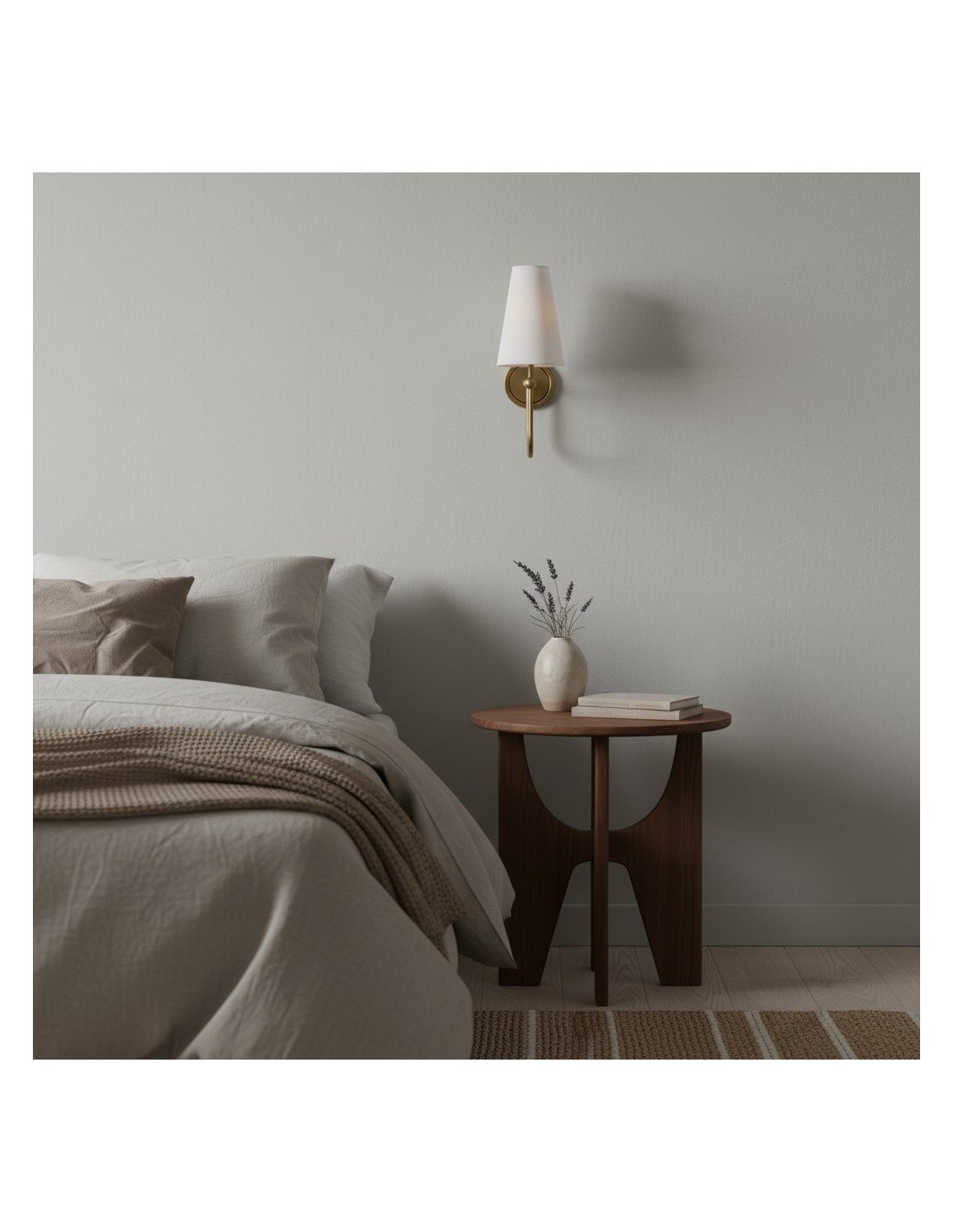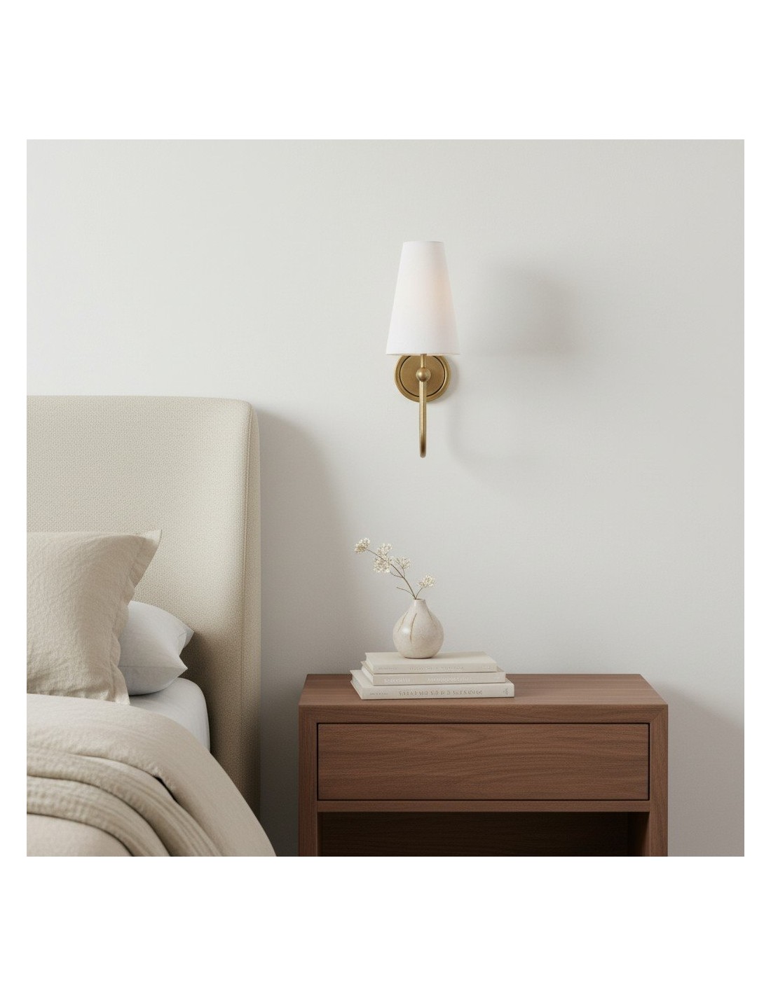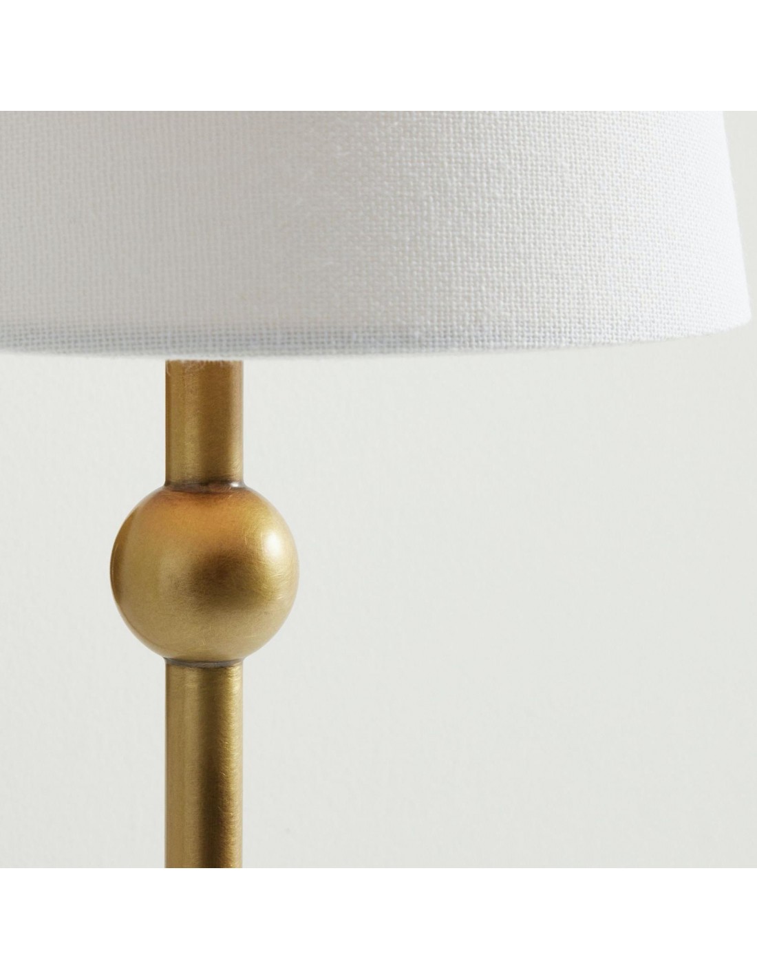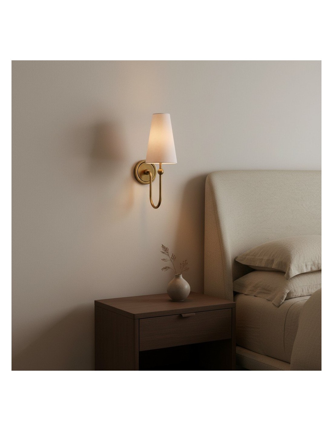 - Material: Hierro con acabado latón vintage / Pantalla de lino blanco