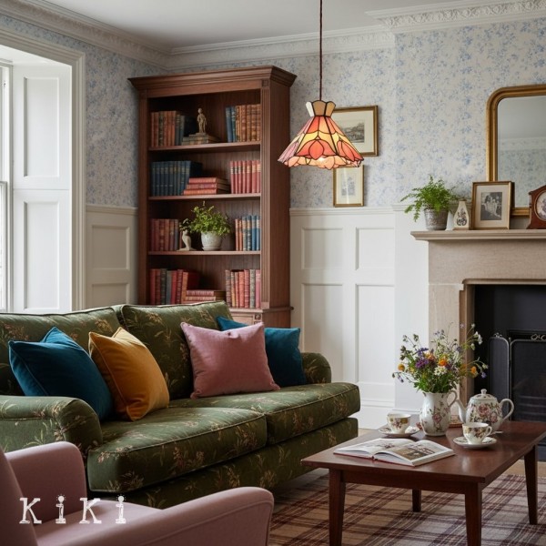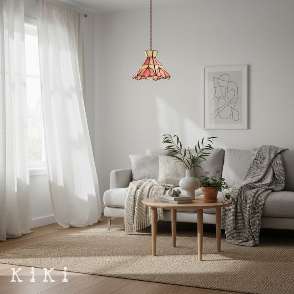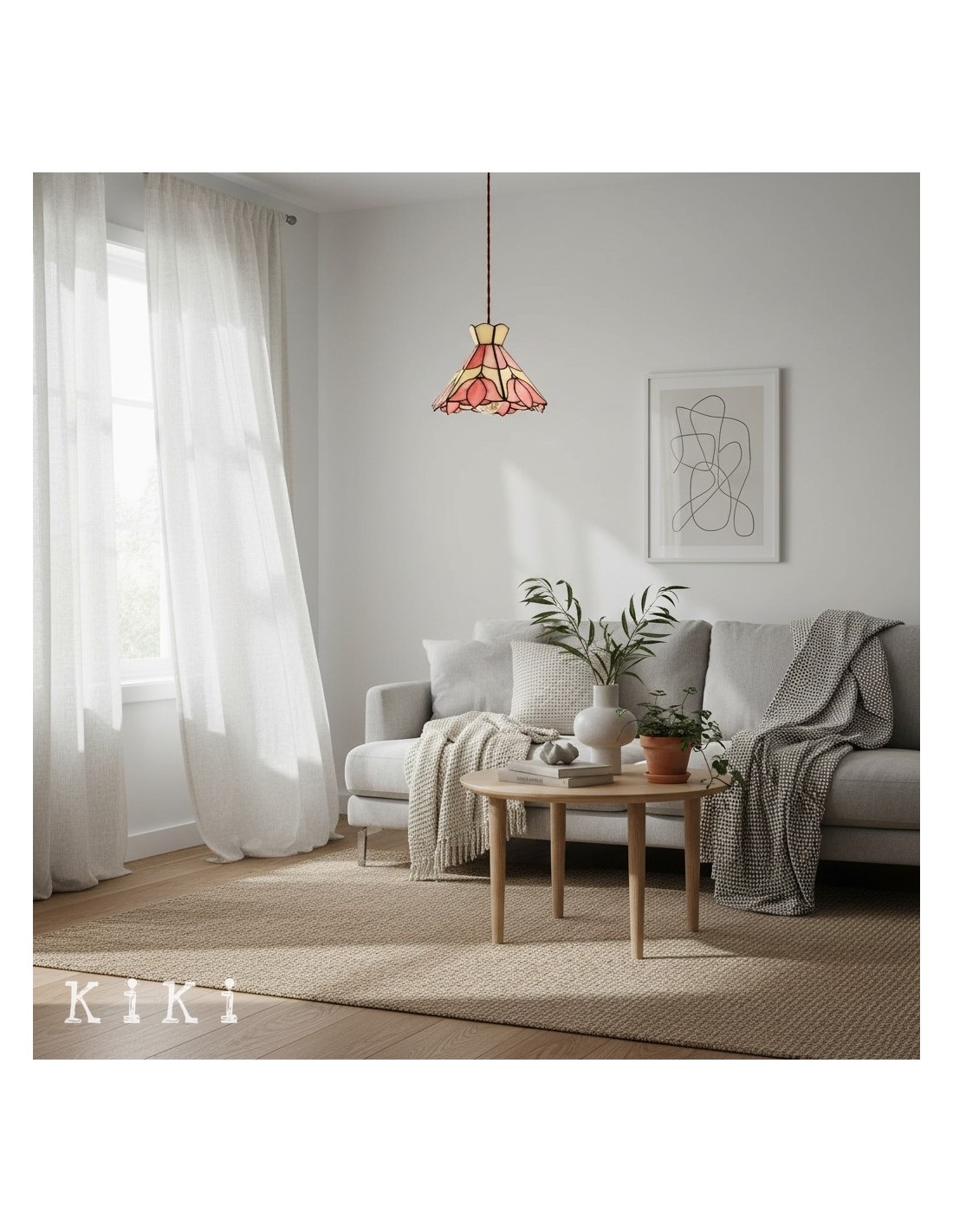 Realce sus espacios con la lámpara colgante de vitral floral Sevra, que combina la artesanía inspirada en Tiffany con la artesanía moderna. Su colorida pantalla de vidrio floral presenta intrincados patrones en tonos dorados, beige y rosas, creando una pieza central visualmente impactante que realza cualquier habitación.