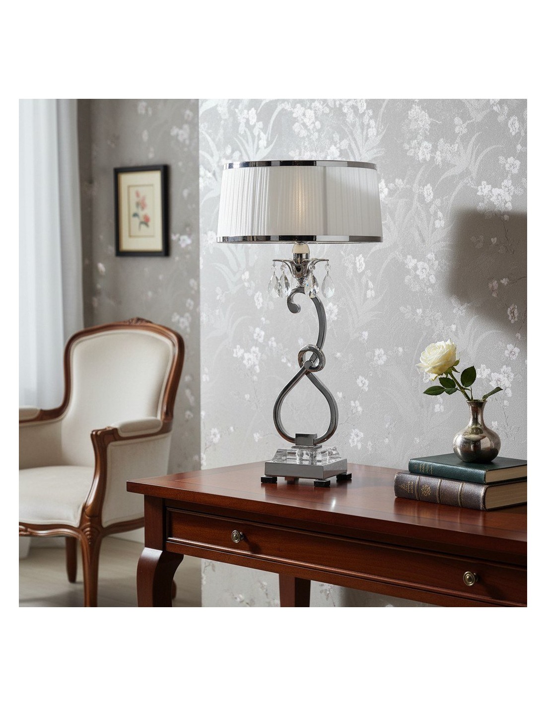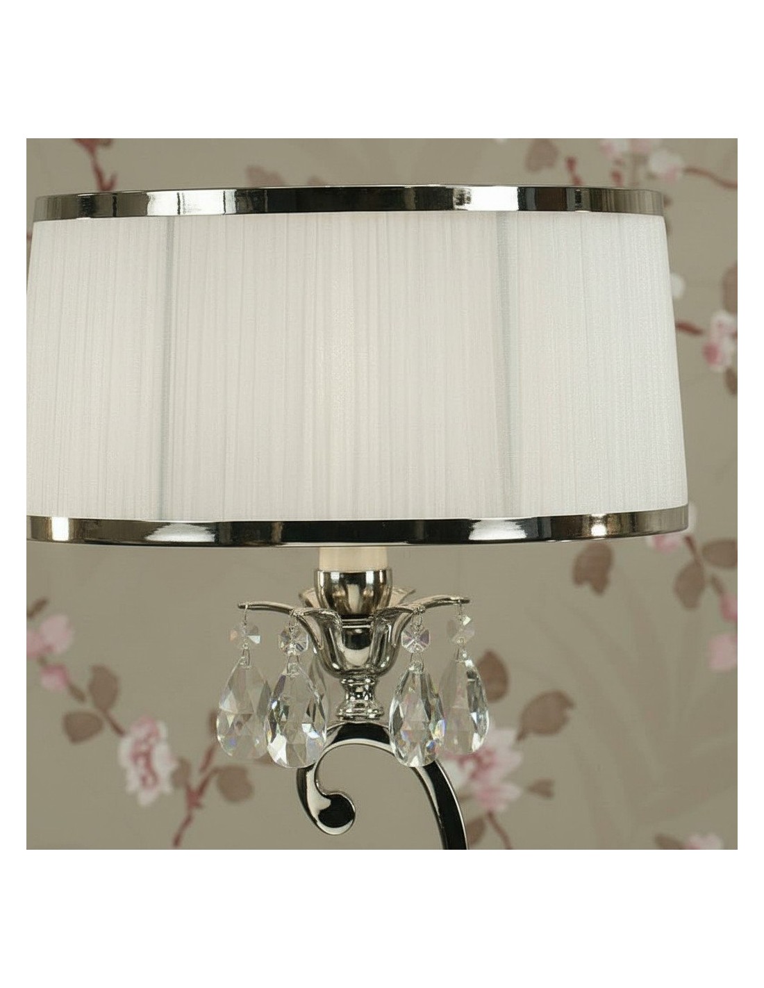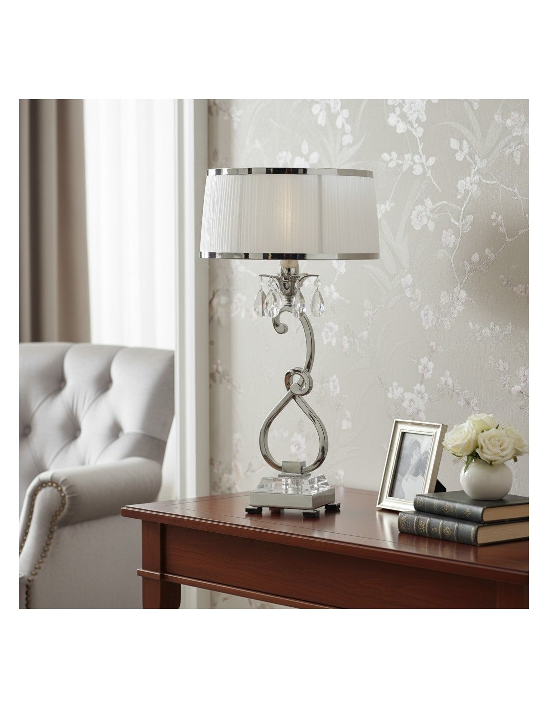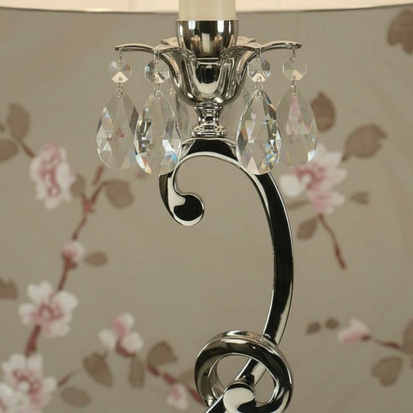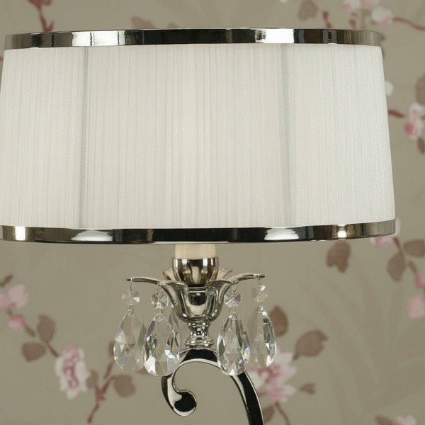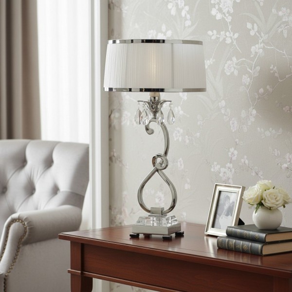 Esta lámpara de mesa presenta detalles curvos de níquel pulido y detalles de cristal facetado que realzan su aspecto refinado y moderno. La pantalla blanca suaviza la luz creando un brillo cálido, ideal para salas de estar, dormitorios o consolas de pasillo.