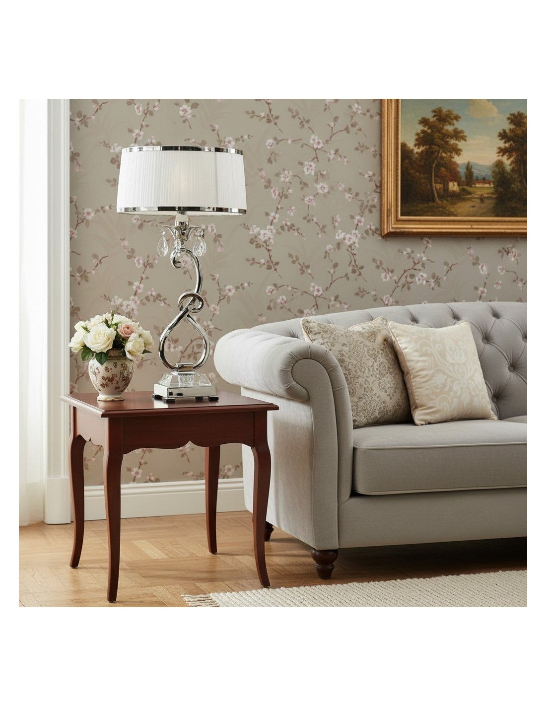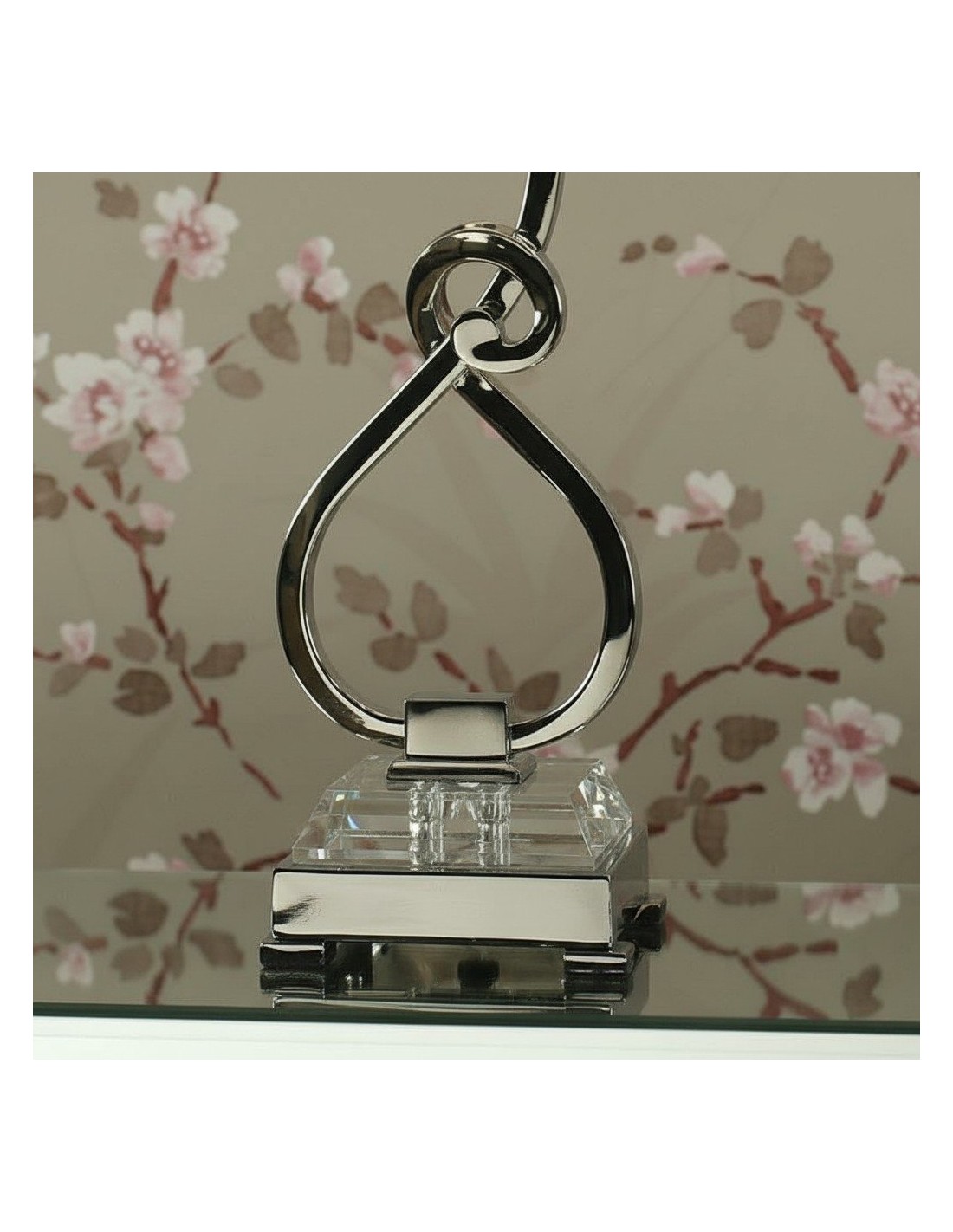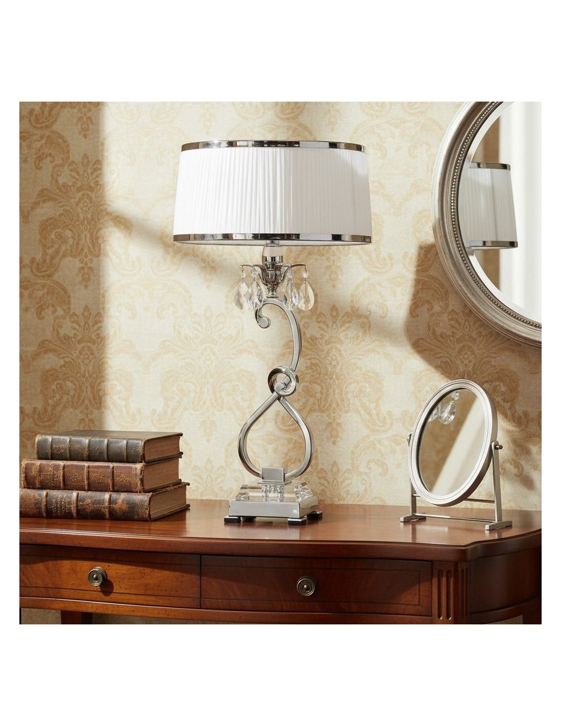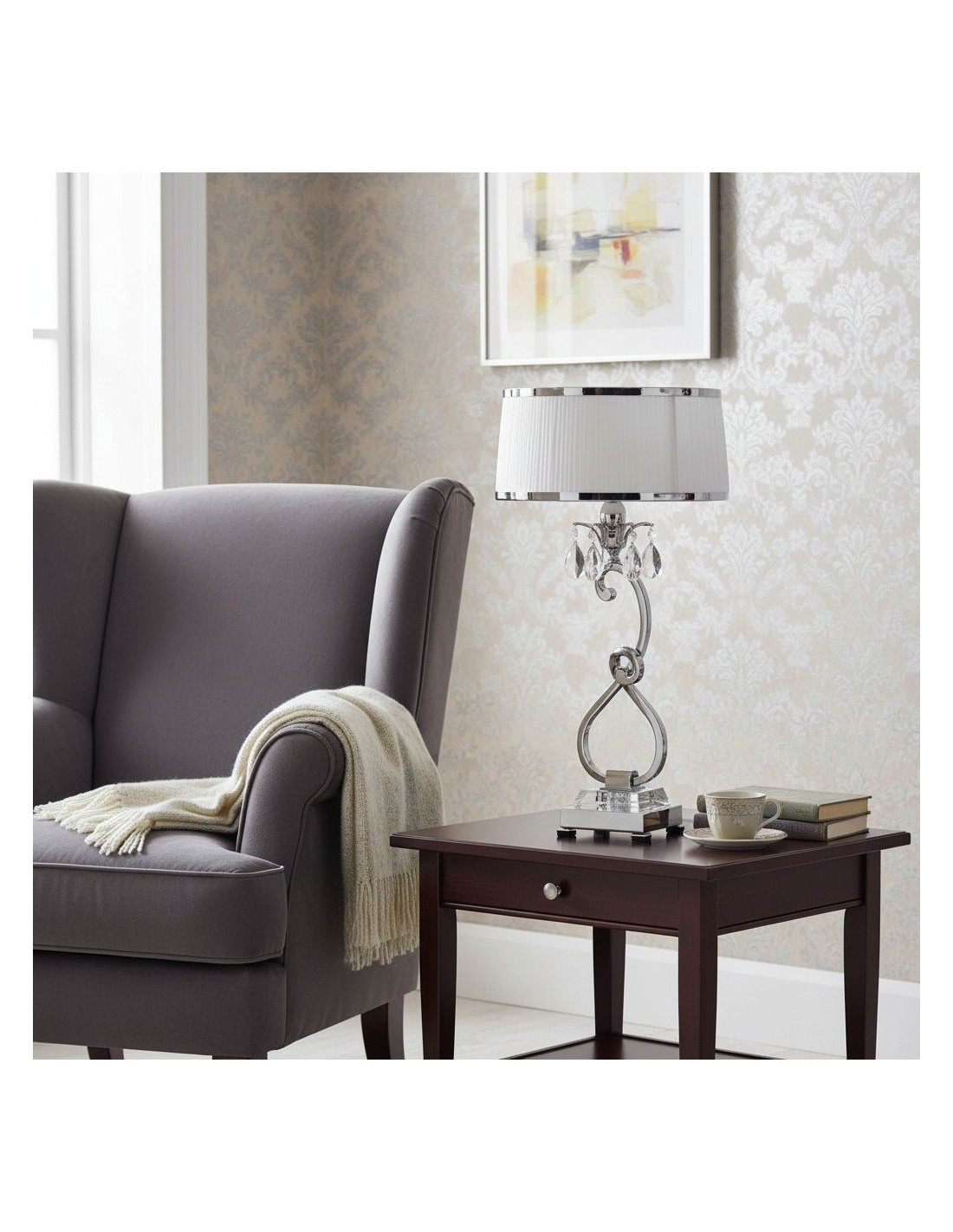 Esta lámpara de mesa presenta detalles curvos de níquel pulido y detalles de cristal facetado que realzan su aspecto refinado y moderno. La pantalla blanca suaviza la luz creando un brillo cálido, ideal para salas de estar, dormitorios o consolas de pasillo.