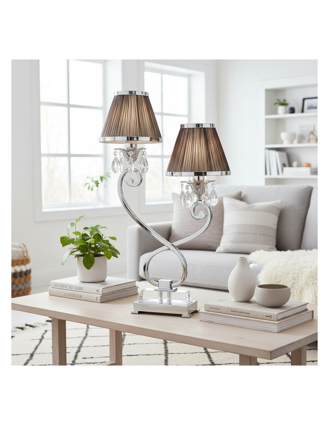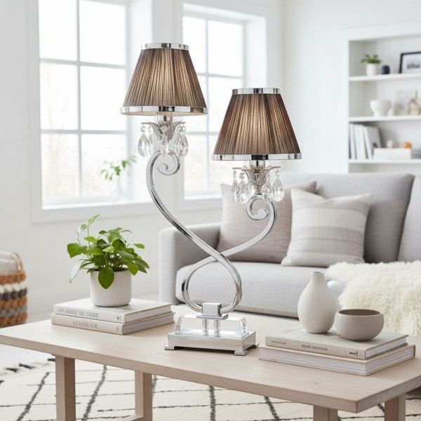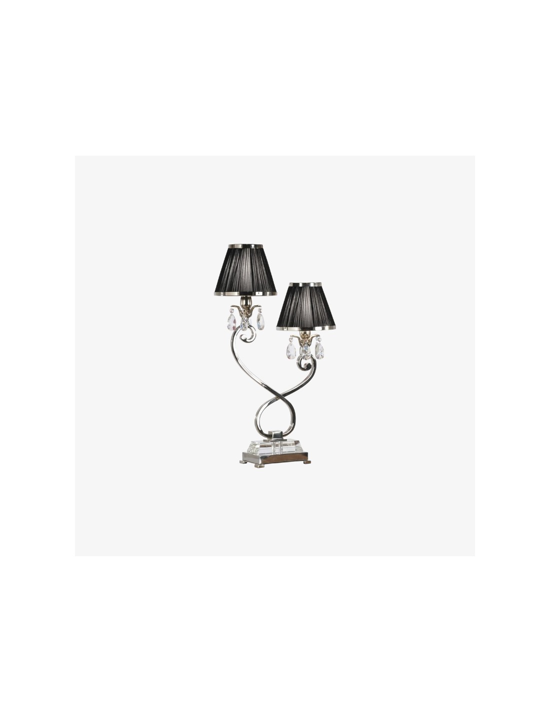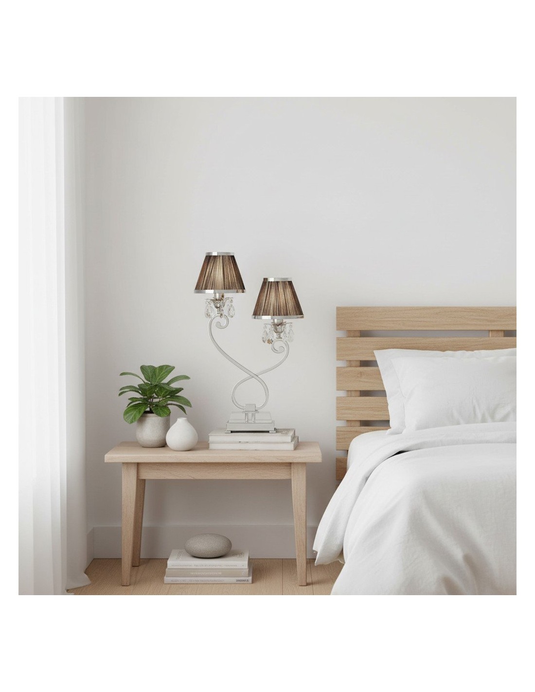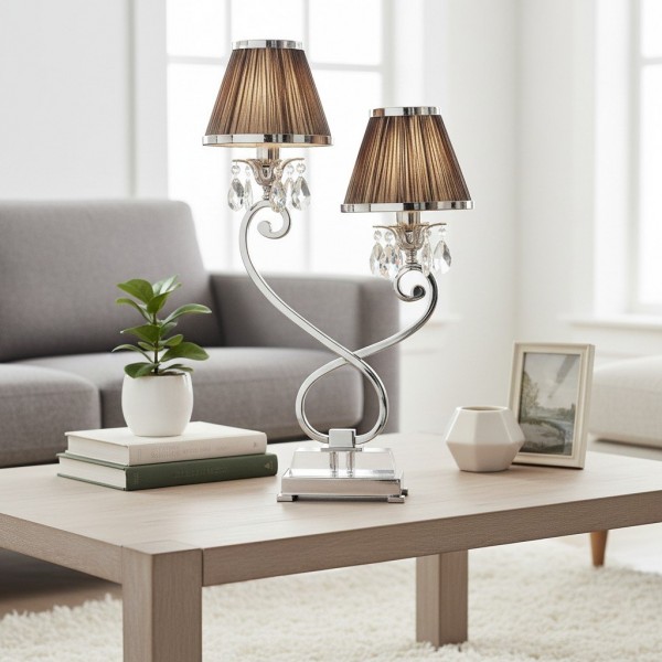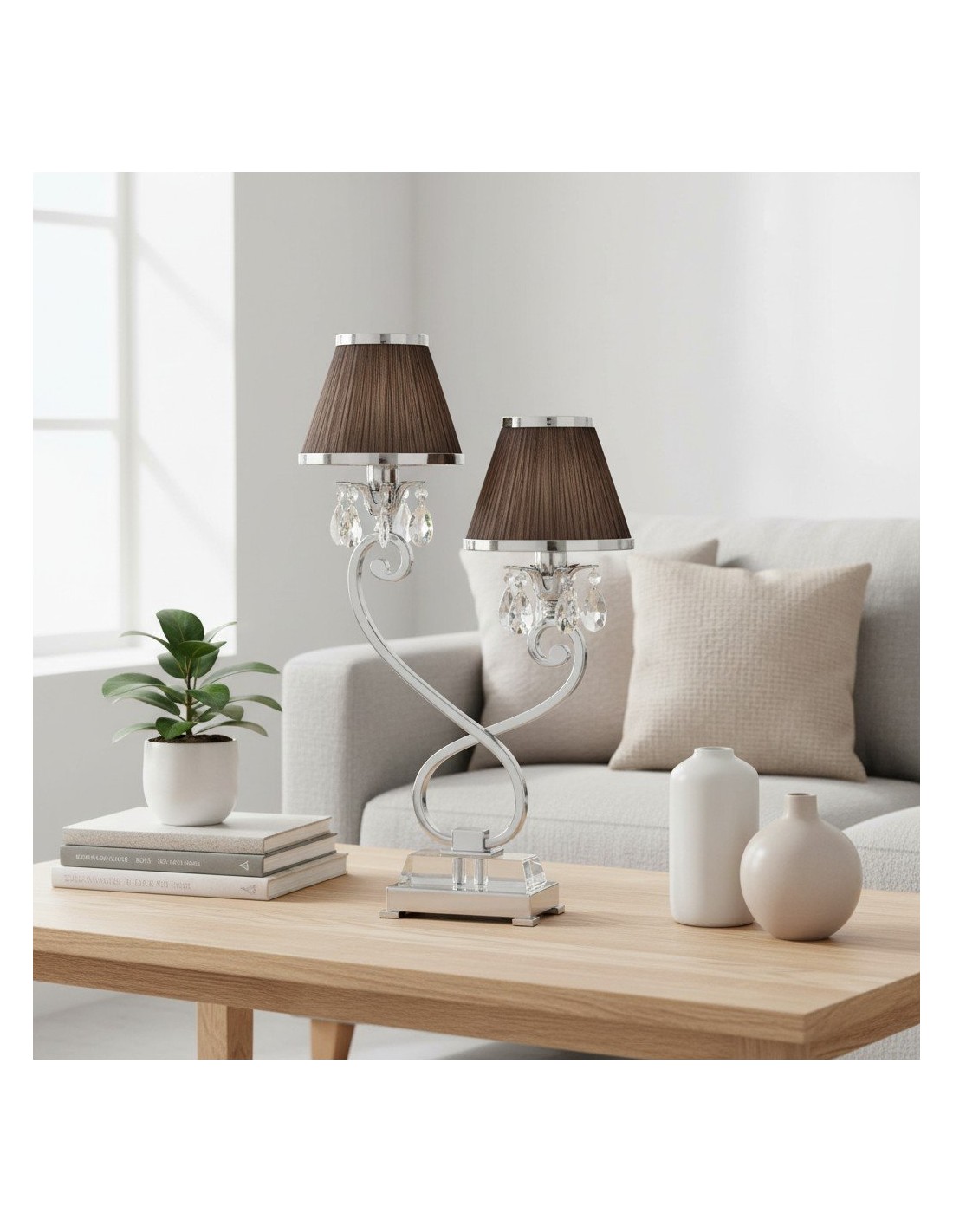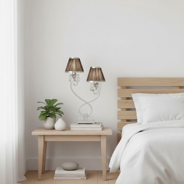 La lámpara de mesa doble combina dos pantallas con una base metálica estilizada para una iluminación ambiental equilibrada y una presencia escultural. Su silueta de dos brazos y su refinado acabado se adaptan a interiores modernos, de transición o clásicos; ideal para mesitas de noche, aparadores, escritorios de estudio o suites de hotel.