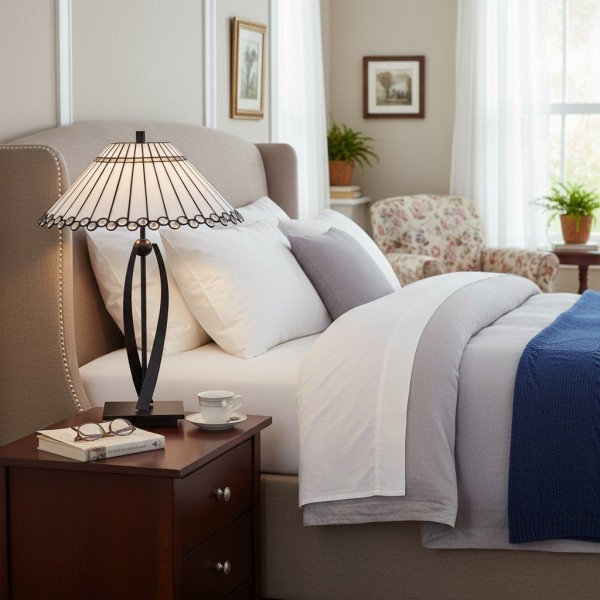 Esta lámpara de mesa cónica presenta una pantalla de vidrio única con un cautivador patrón geométrico. La cálida y acogedora luz que se filtra a través del vidrio artístico crea un ambiente acogedor, perfecto para cualquier interior de inspiración clásica o vintage. Su robusta base proporciona una base estable y elegante, ideal para la sala de estar, la mesita de noche y el estudio.