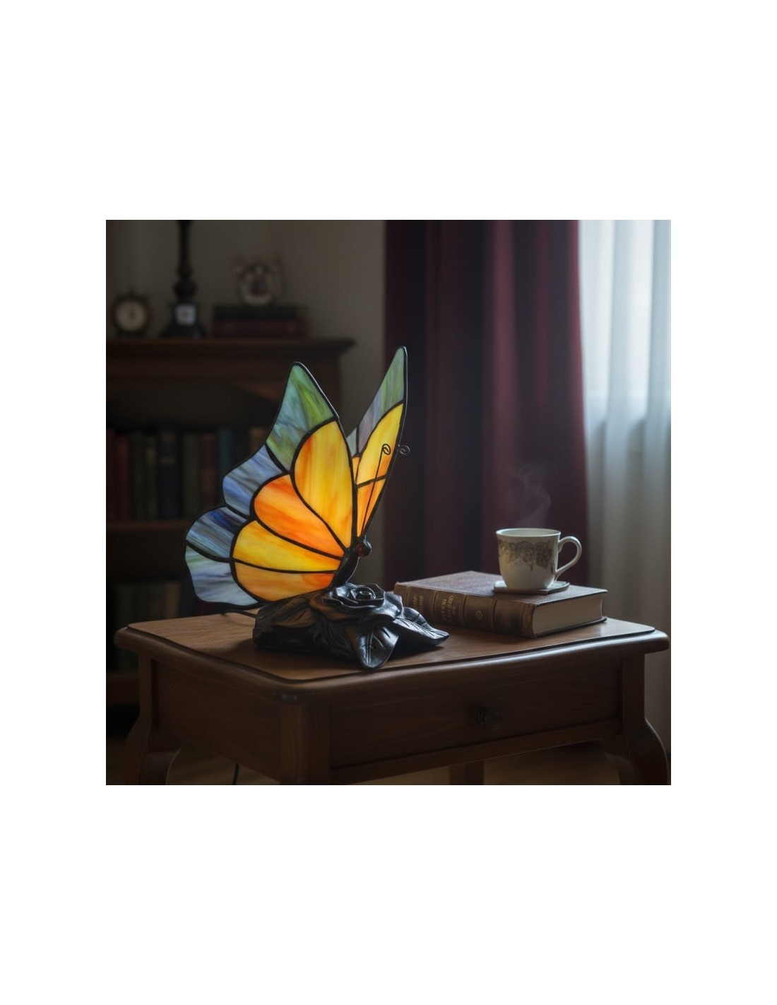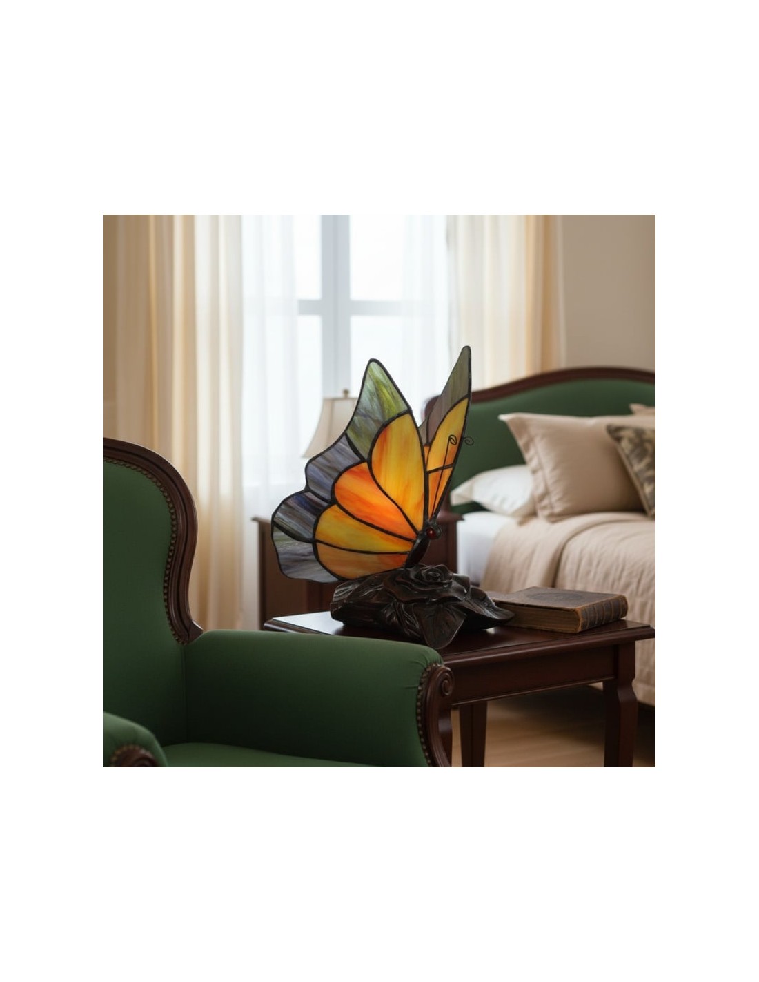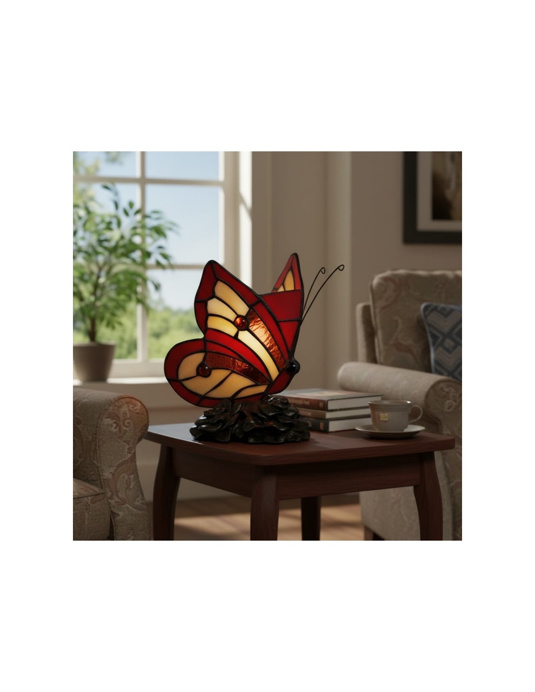 Lámpara de mesa TF Butterfly con vitrales tallados a mano que forman delicados patrones de mariposas y flores. Su diseño atemporal ofrece una iluminación cálida y ambiental que realza salas de estar, dormitorios y pasillos. Elegante, artística y versátil, aporta encanto y belleza decorativa a cualquier espacio.