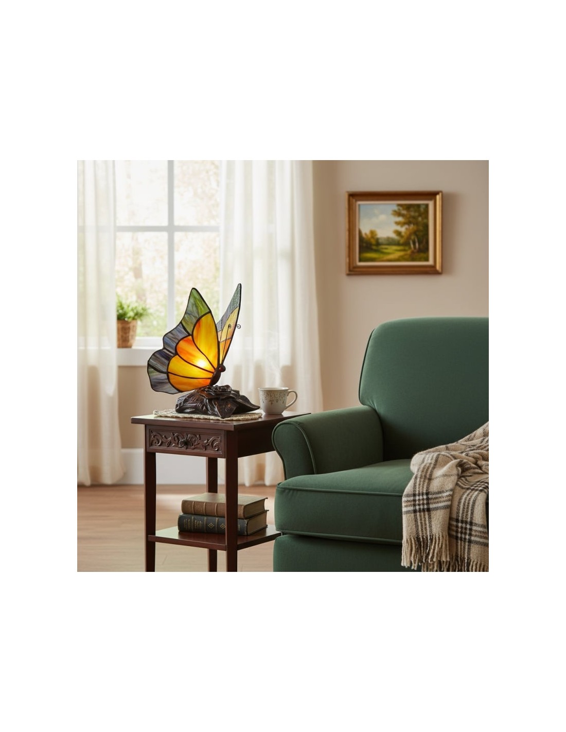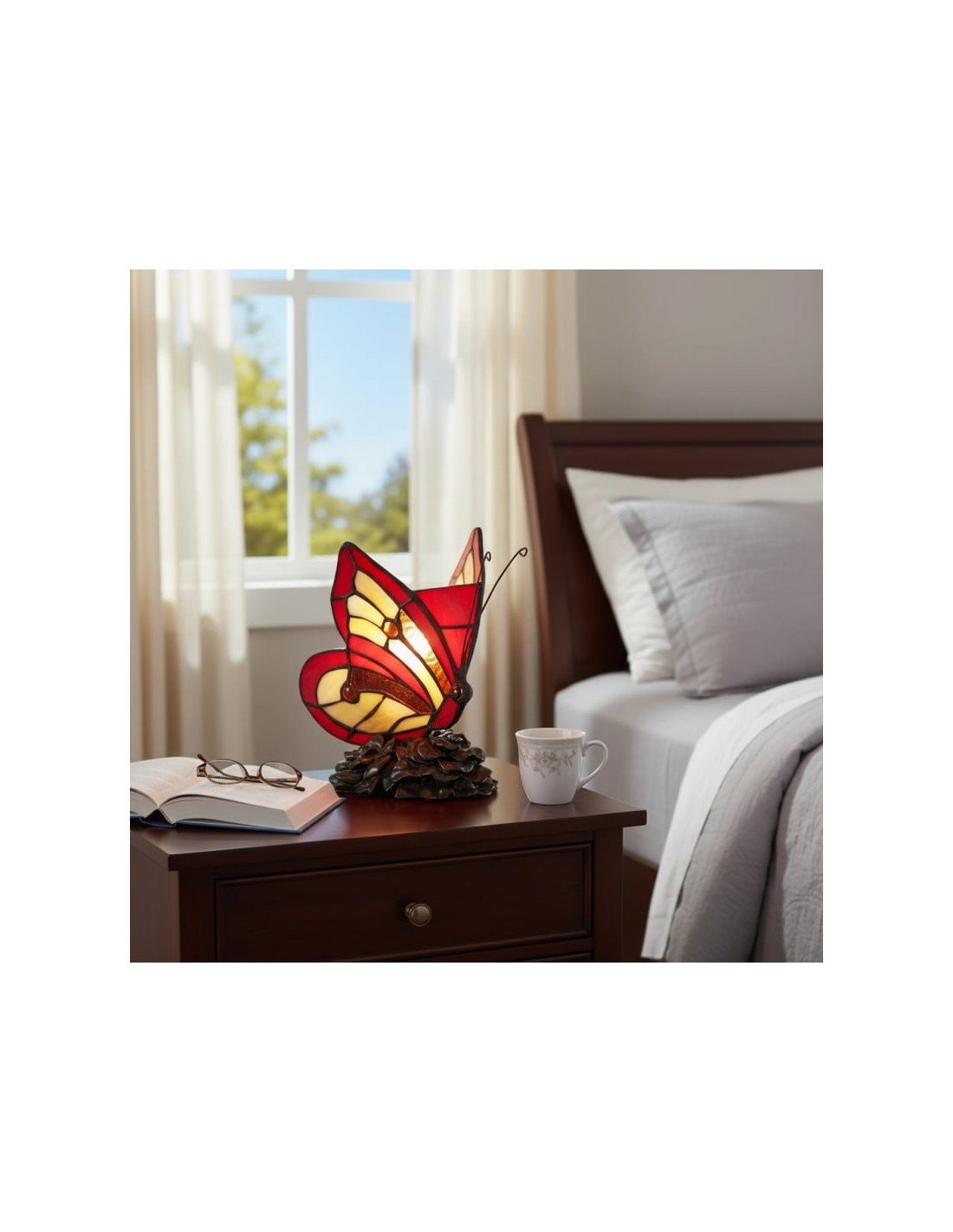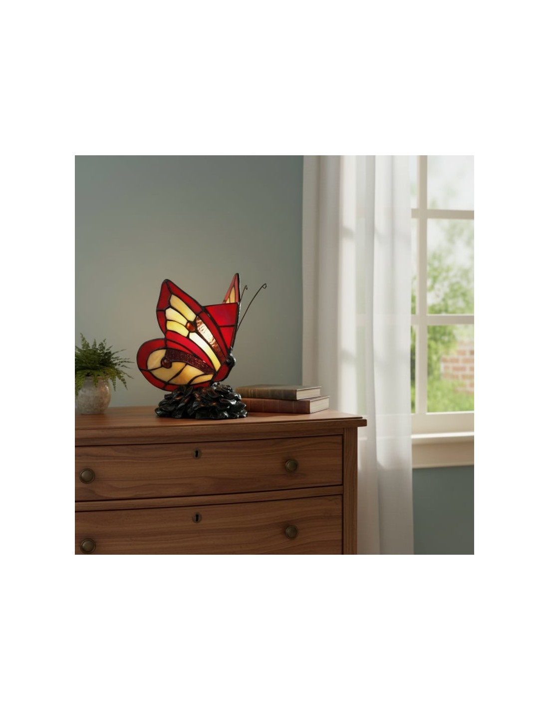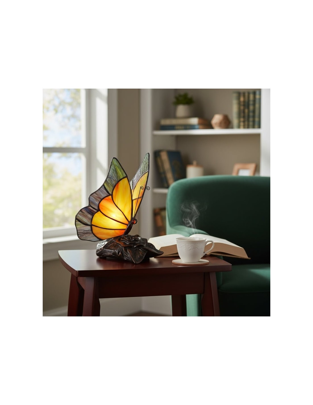 Lámpara de mesa TF Butterfly con vitrales tallados a mano que forman delicados patrones de mariposas y flores. Su diseño atemporal ofrece una iluminación cálida y ambiental que realza salas de estar, dormitorios y pasillos. Elegante, artística y versátil, aporta encanto y belleza decorativa a cualquier espacio.