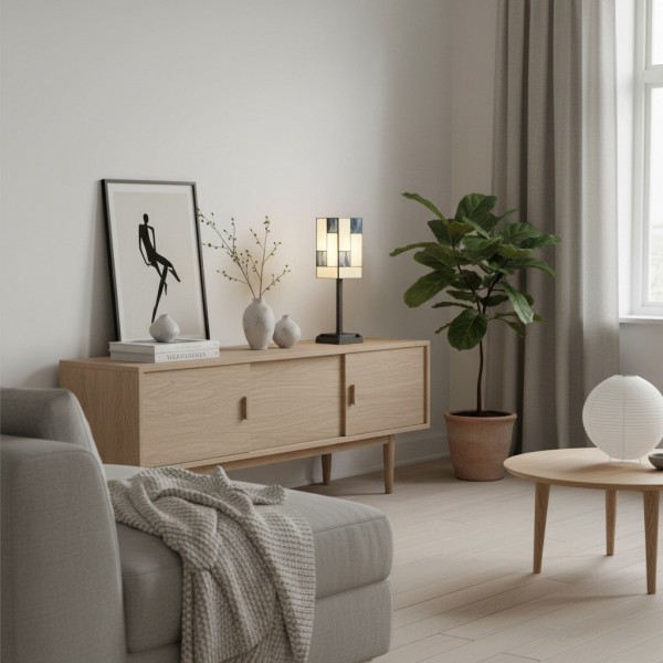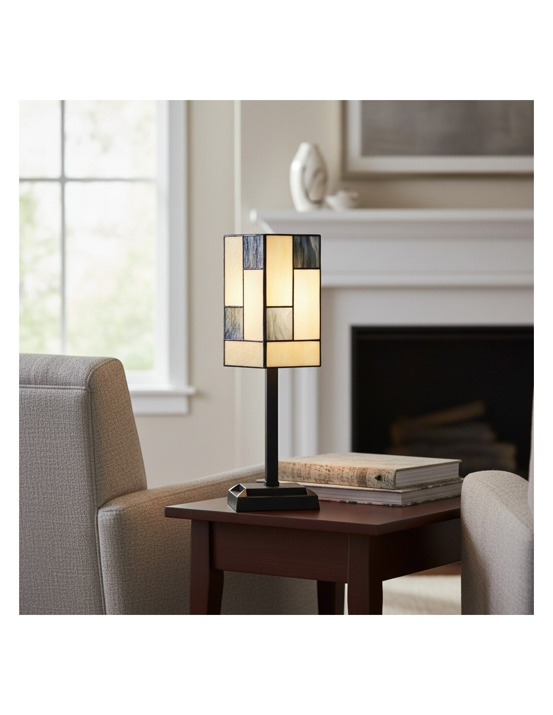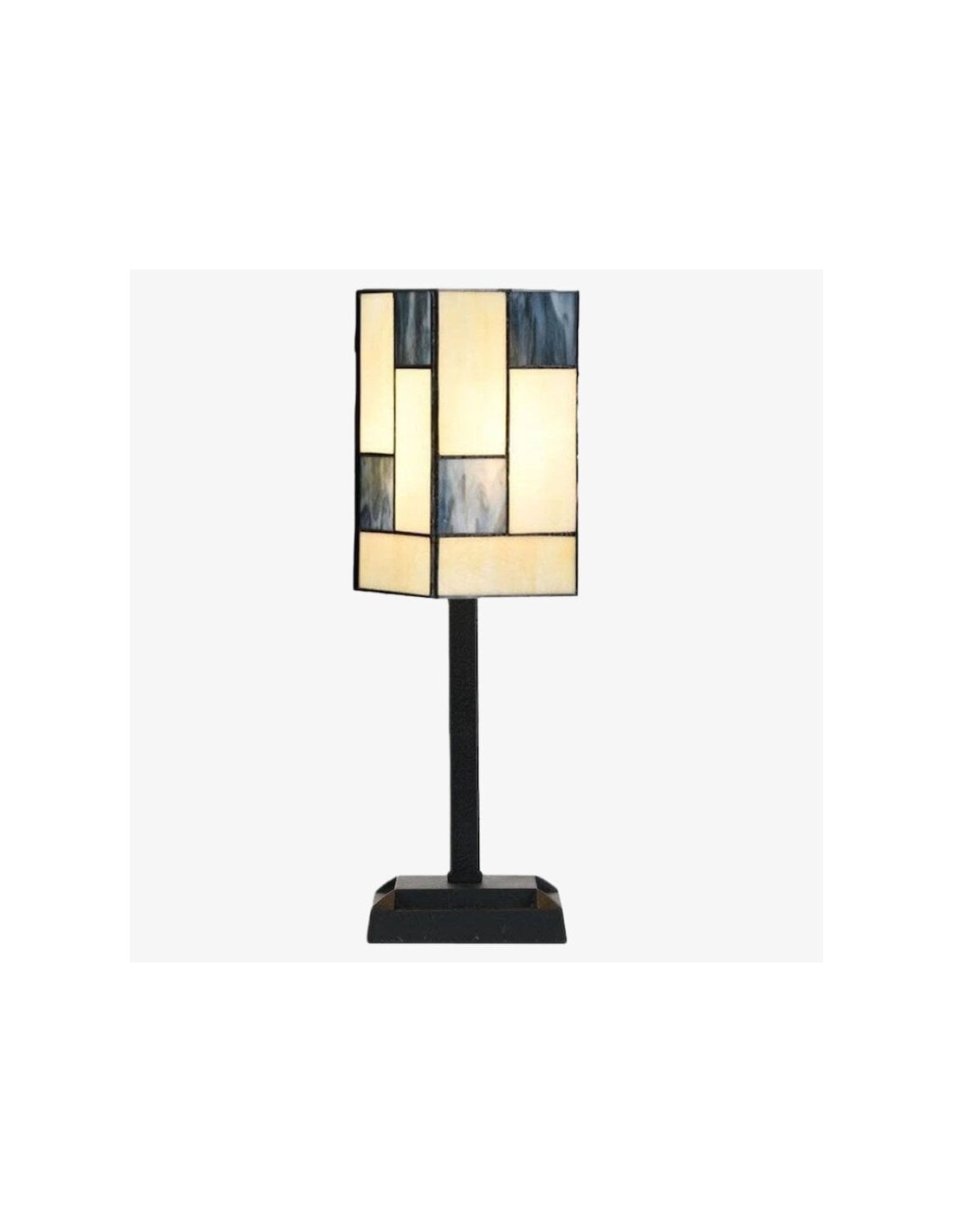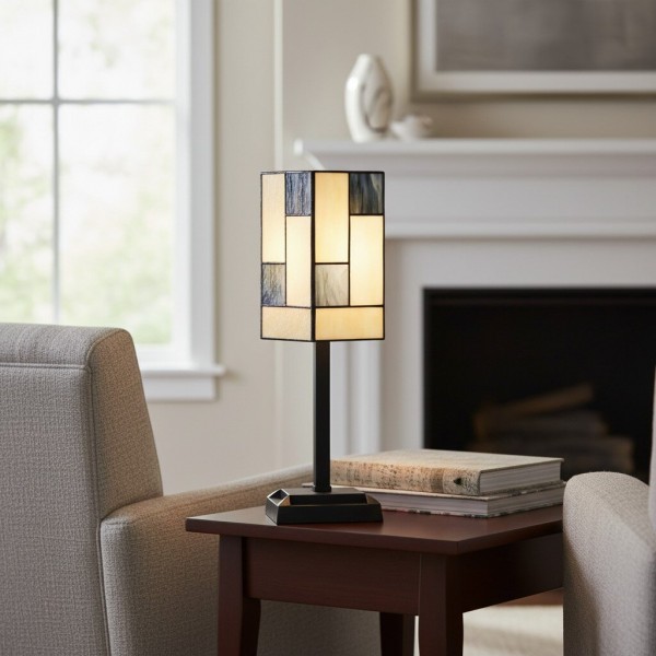 Ilumina tu espacio con la elegancia atemporal de esta lámpara de mesa de vitral. Esta lámpara de escritorio cuenta con una impresionante pantalla artesanal hecha con piezas individuales de vitral. Su diseño geométrico, en una paleta de tonos cálidos y acogedores, crea un cautivador mosaico de luz al iluminarse. Su pequeño tamaño la convierte en el complemento perfecto para una mesita de noche o un escritorio de estudio en tu hogar.