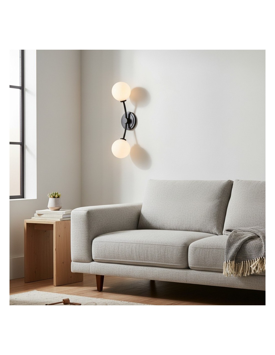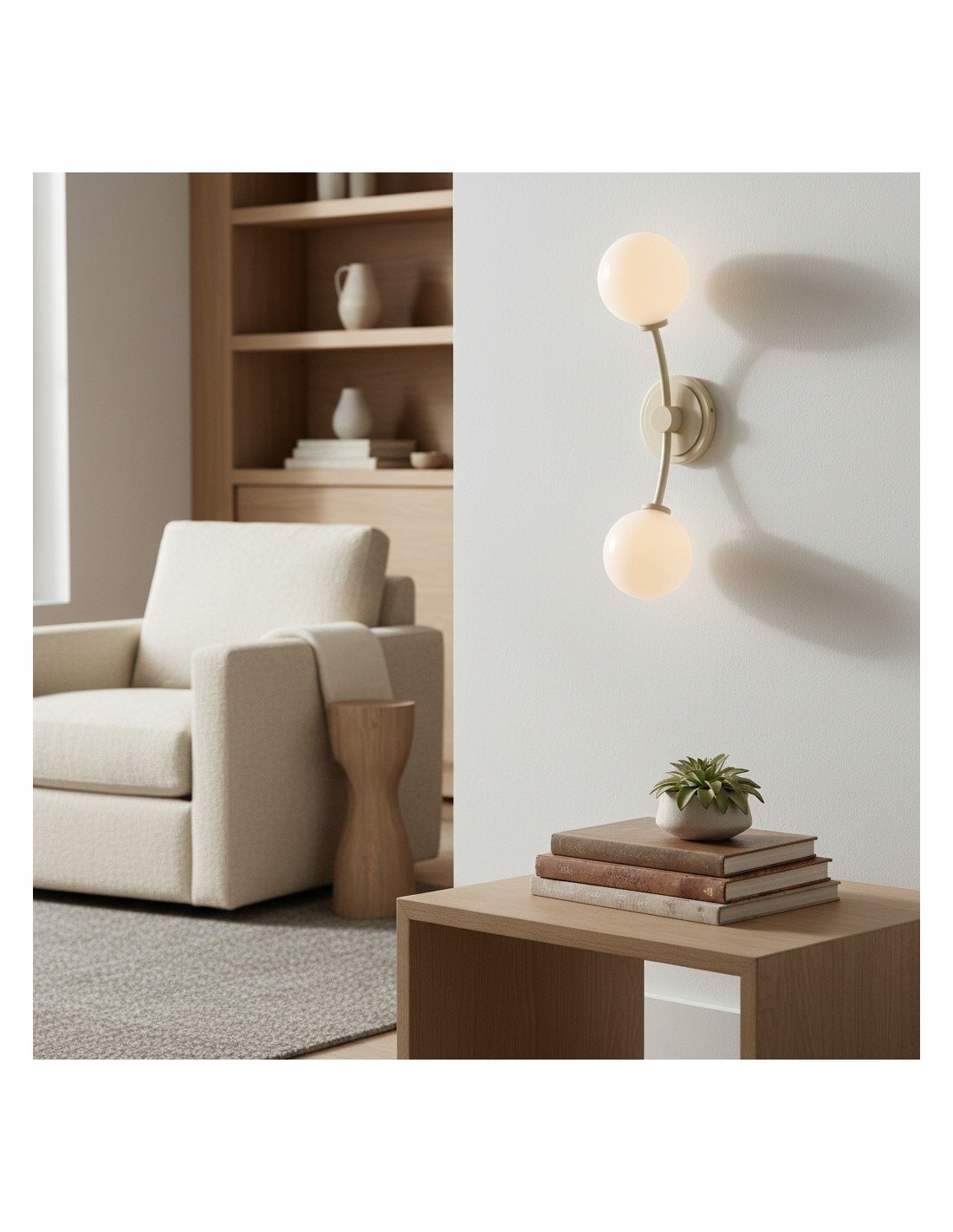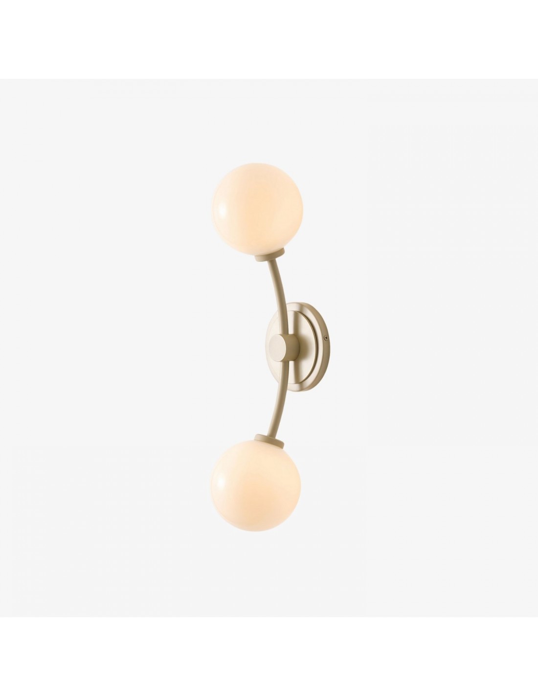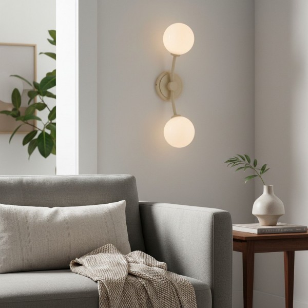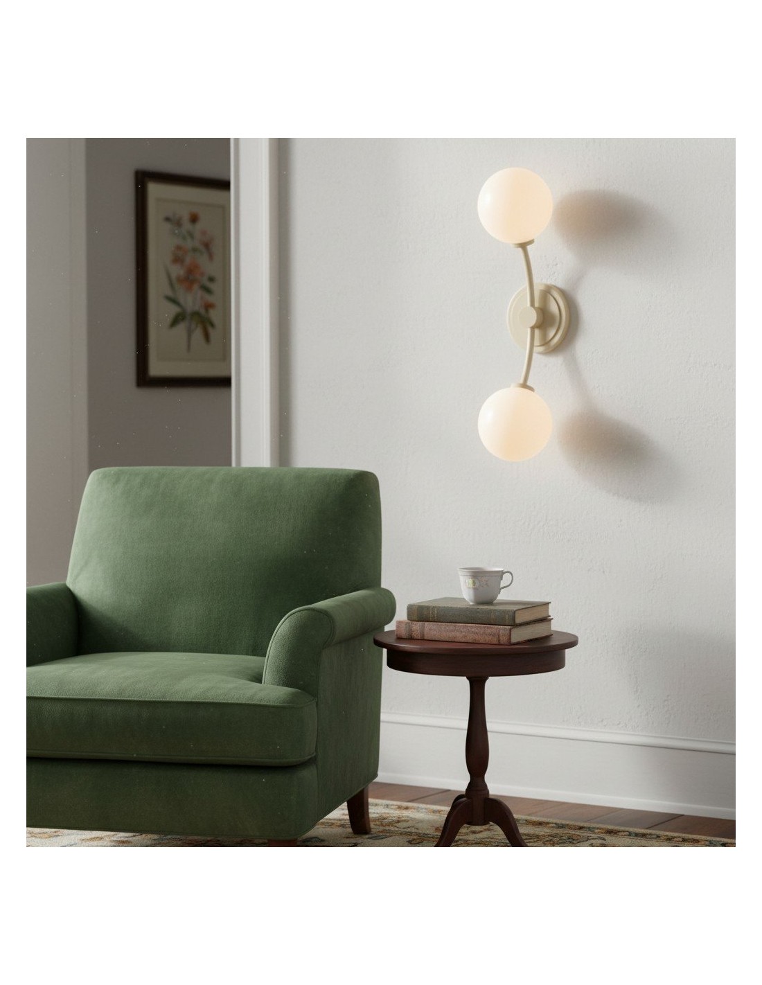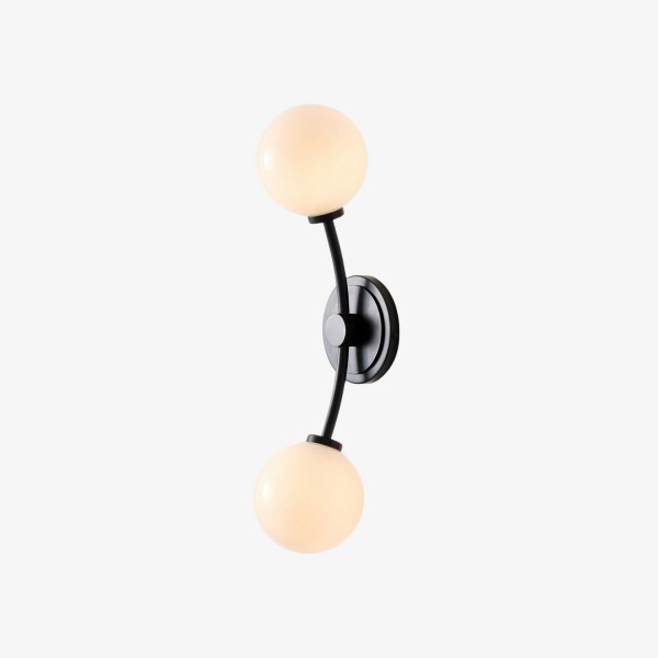 L'applique in vetro Arden fonde l'eleganza scultorea con la semplicità moderna: due globi in vetro opalino satinato poggiano con grazia su un braccio in ferro delicatamente curvo, creando un'illuminazione soffusa e ambientale.