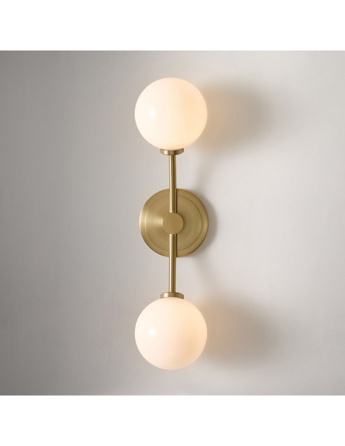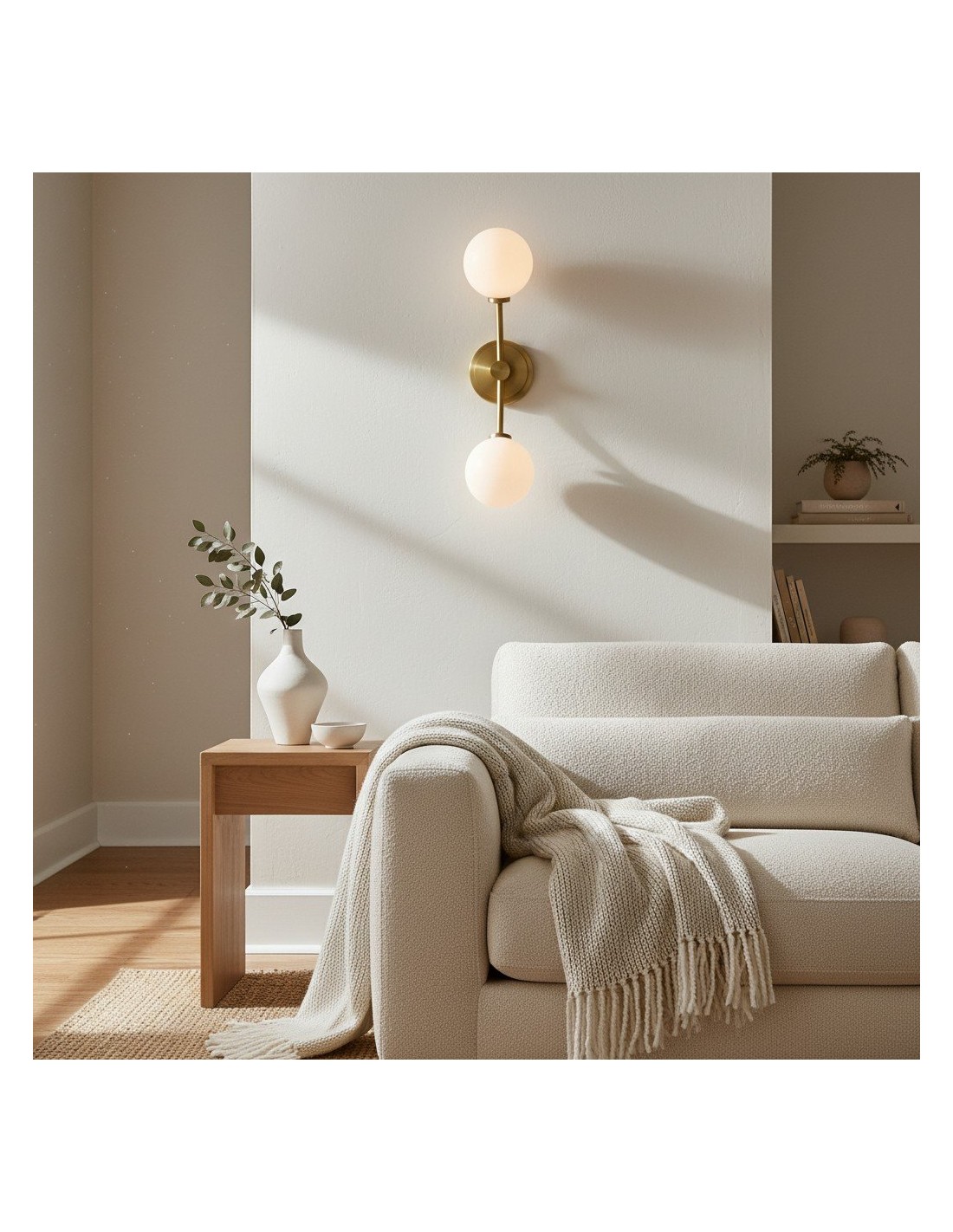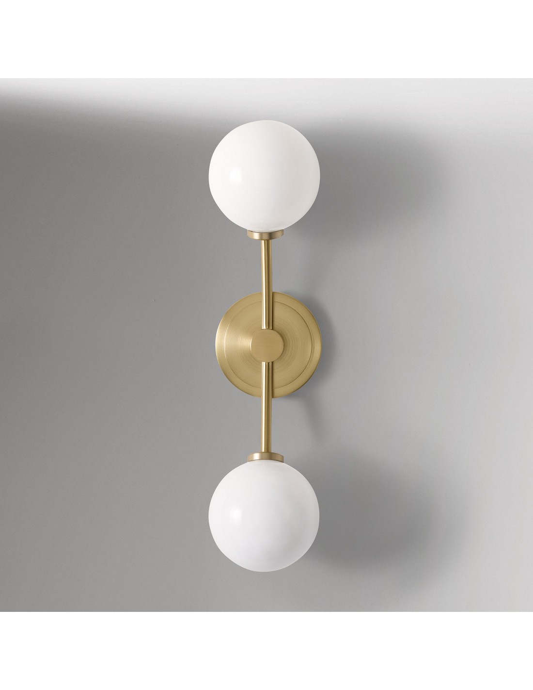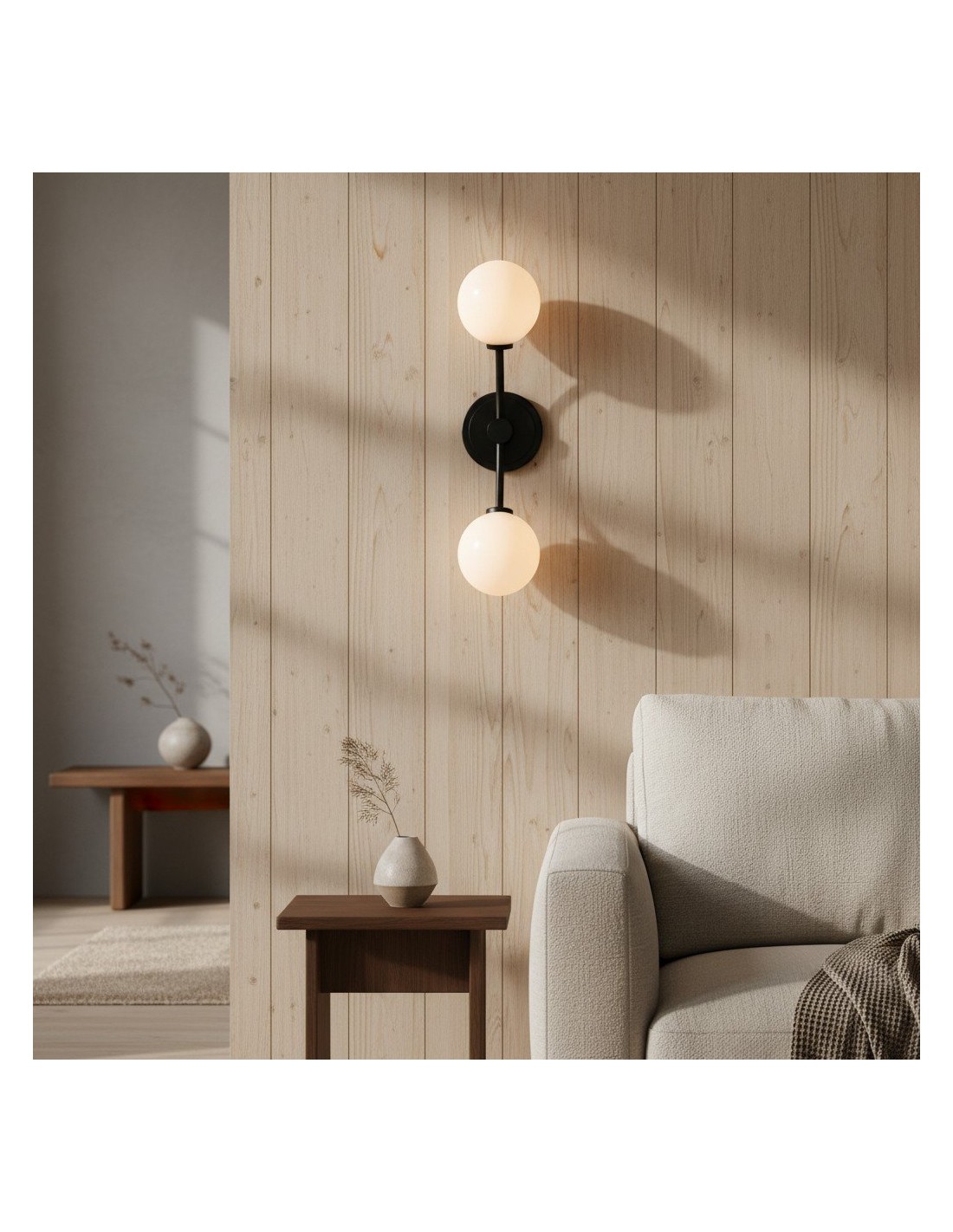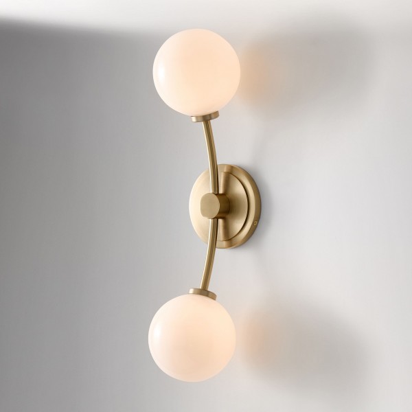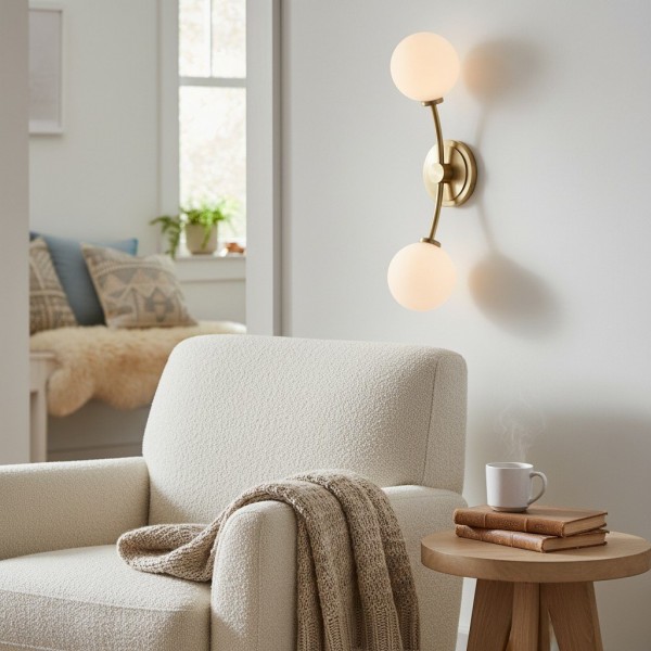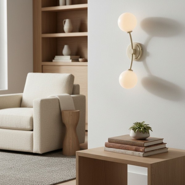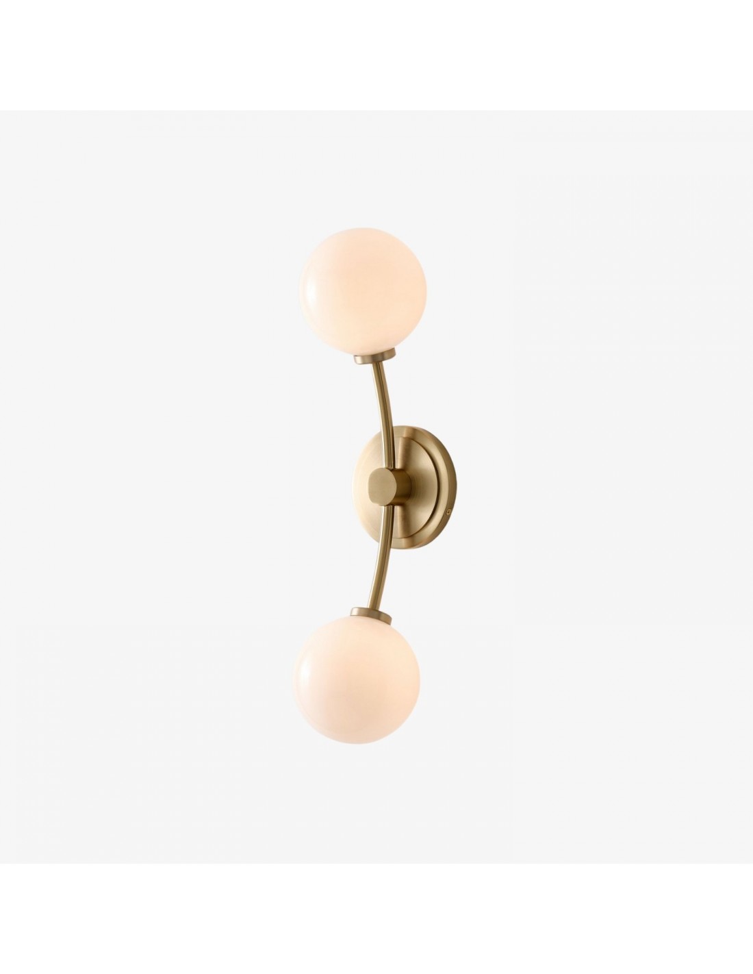 L'applique in vetro Arden fonde l'eleganza scultorea con la semplicità moderna: due globi in vetro opalino satinato poggiano con grazia su un braccio in ferro delicatamente curvo, creando un'illuminazione soffusa e ambientale.