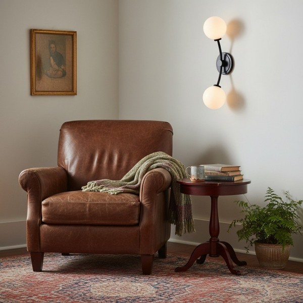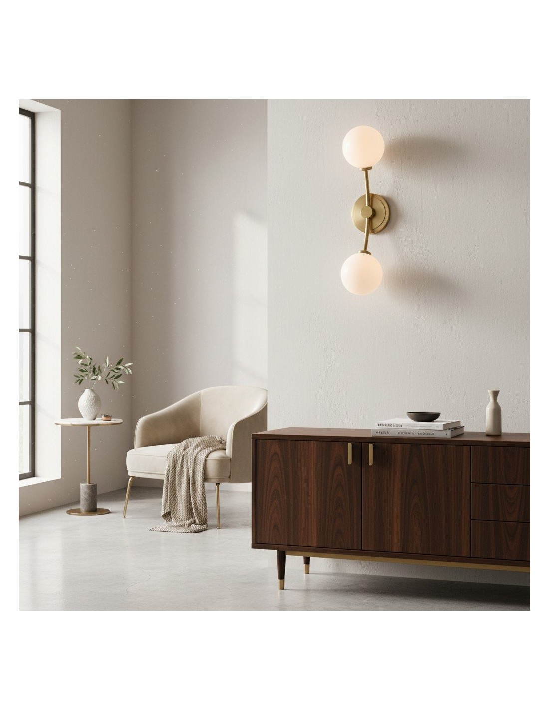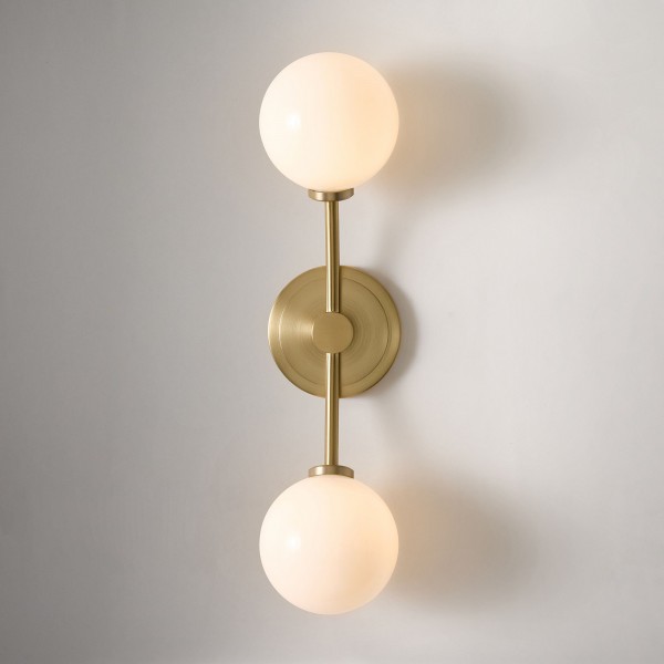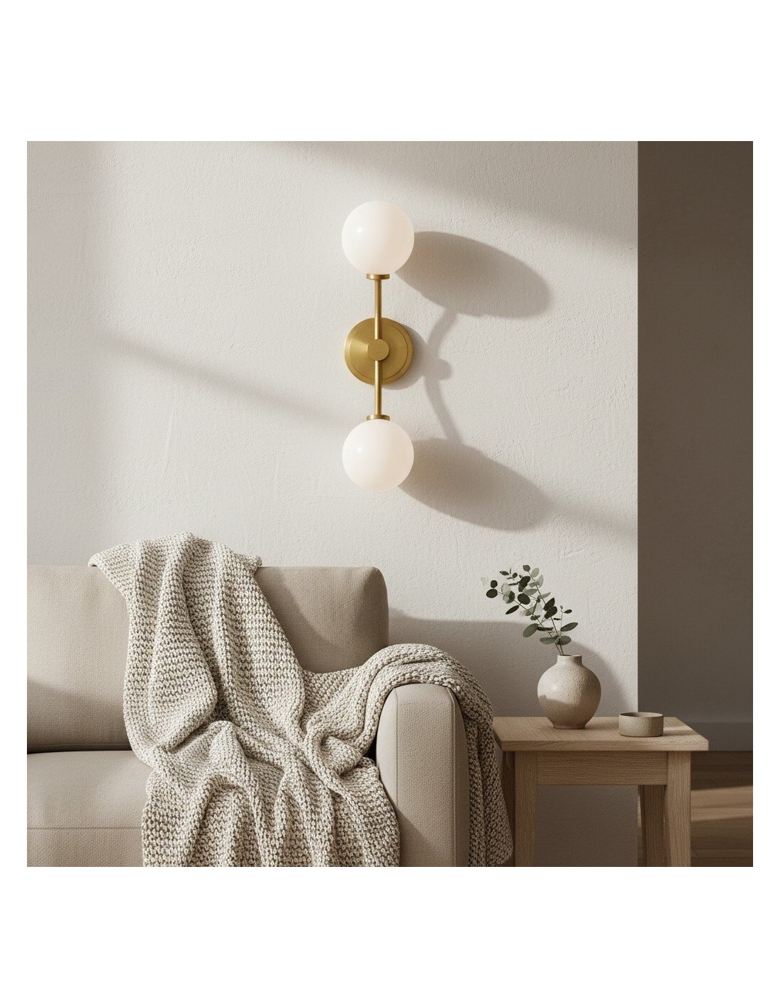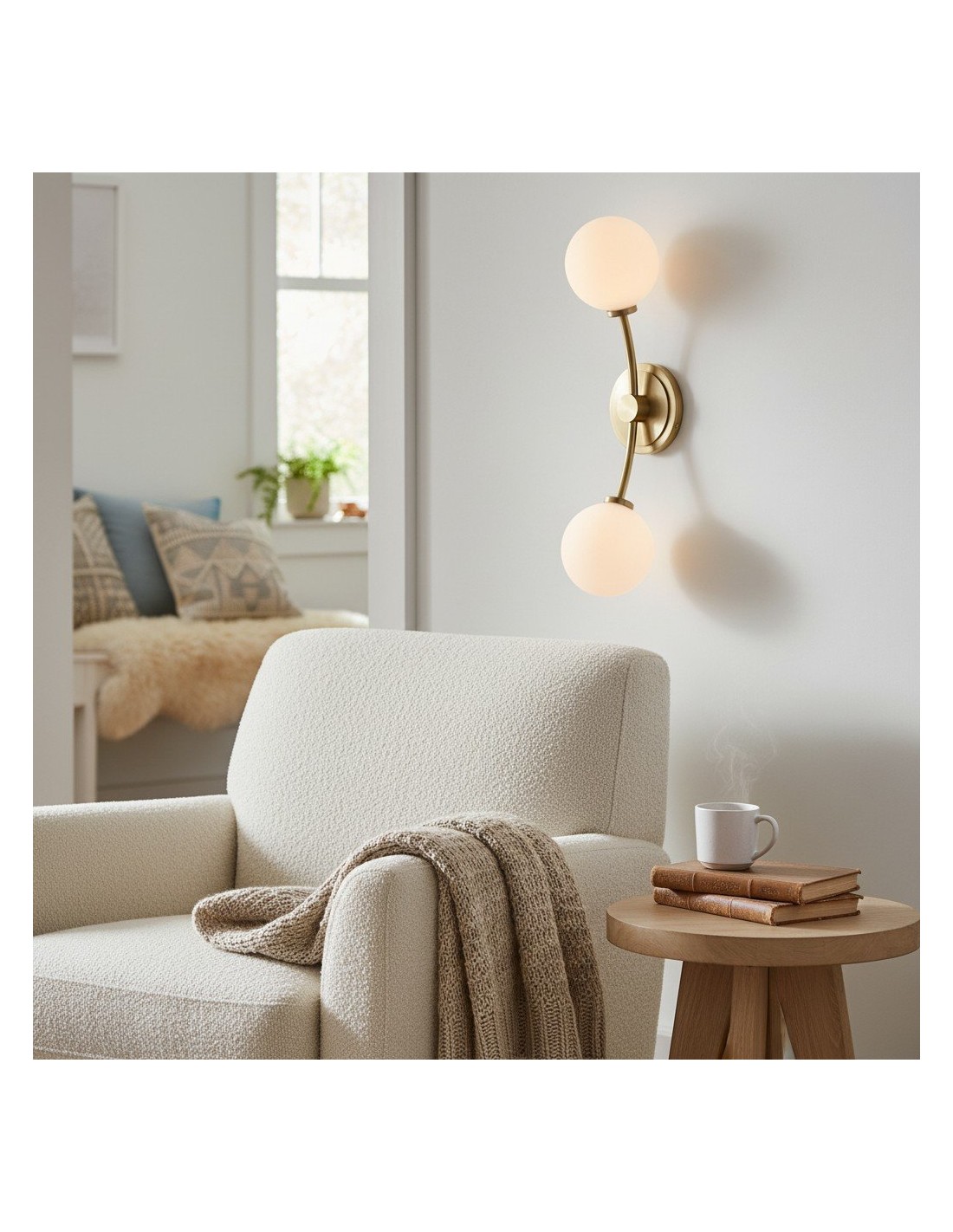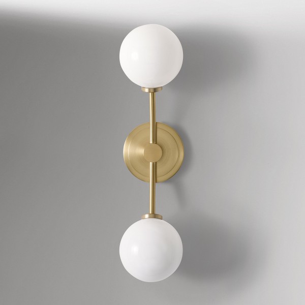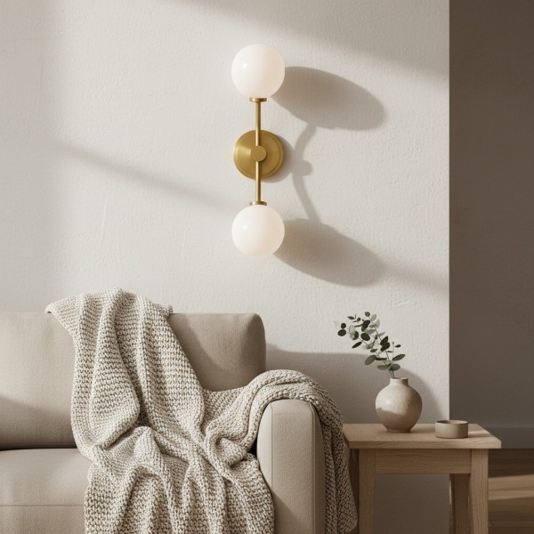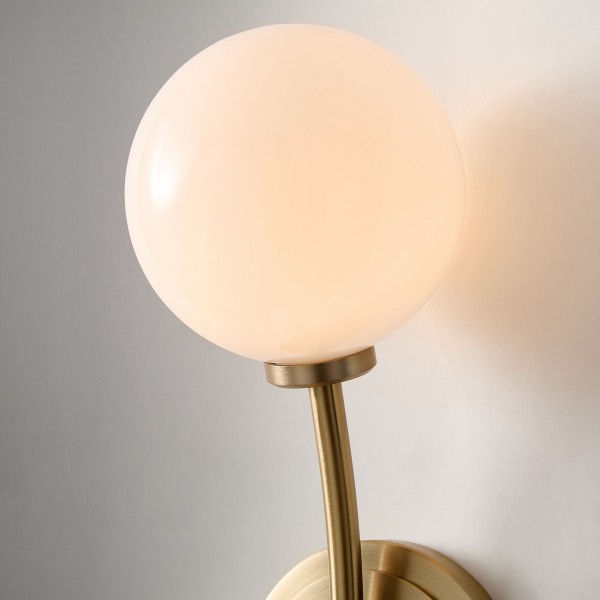 L'applique in vetro Arden fonde l'eleganza scultorea con la semplicità moderna: due globi in vetro opalino satinato poggiano con grazia su un braccio in ferro delicatamente curvo, creando un'illuminazione soffusa e ambientale.