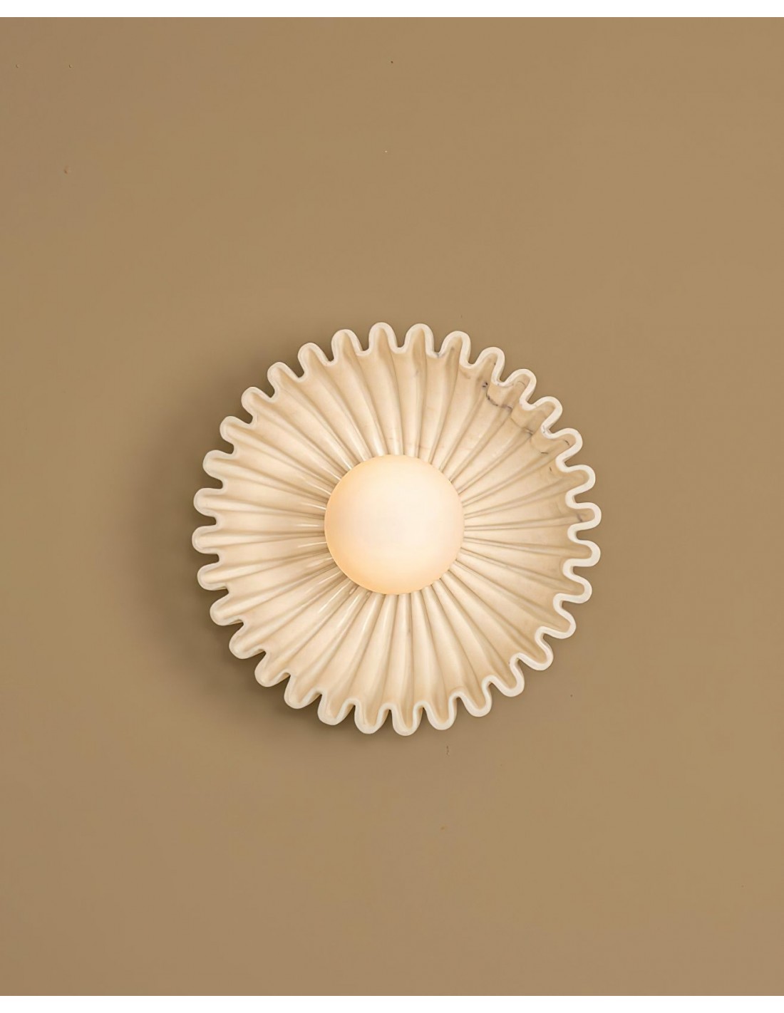 La lampada da parete in ceramica è un'armoniosa combinazione di arte e funzionalità. Un globo opalino rotondo si incastona elegantemente in una ciotola di ceramica testurizzata, creando una presenza scultorea al tempo stesso morbida e raffinata. Il retro testurizzato, che ricorda le delicate pieghe del tessuto, aggiunge un tocco tattile e artigianale all'oggetto.