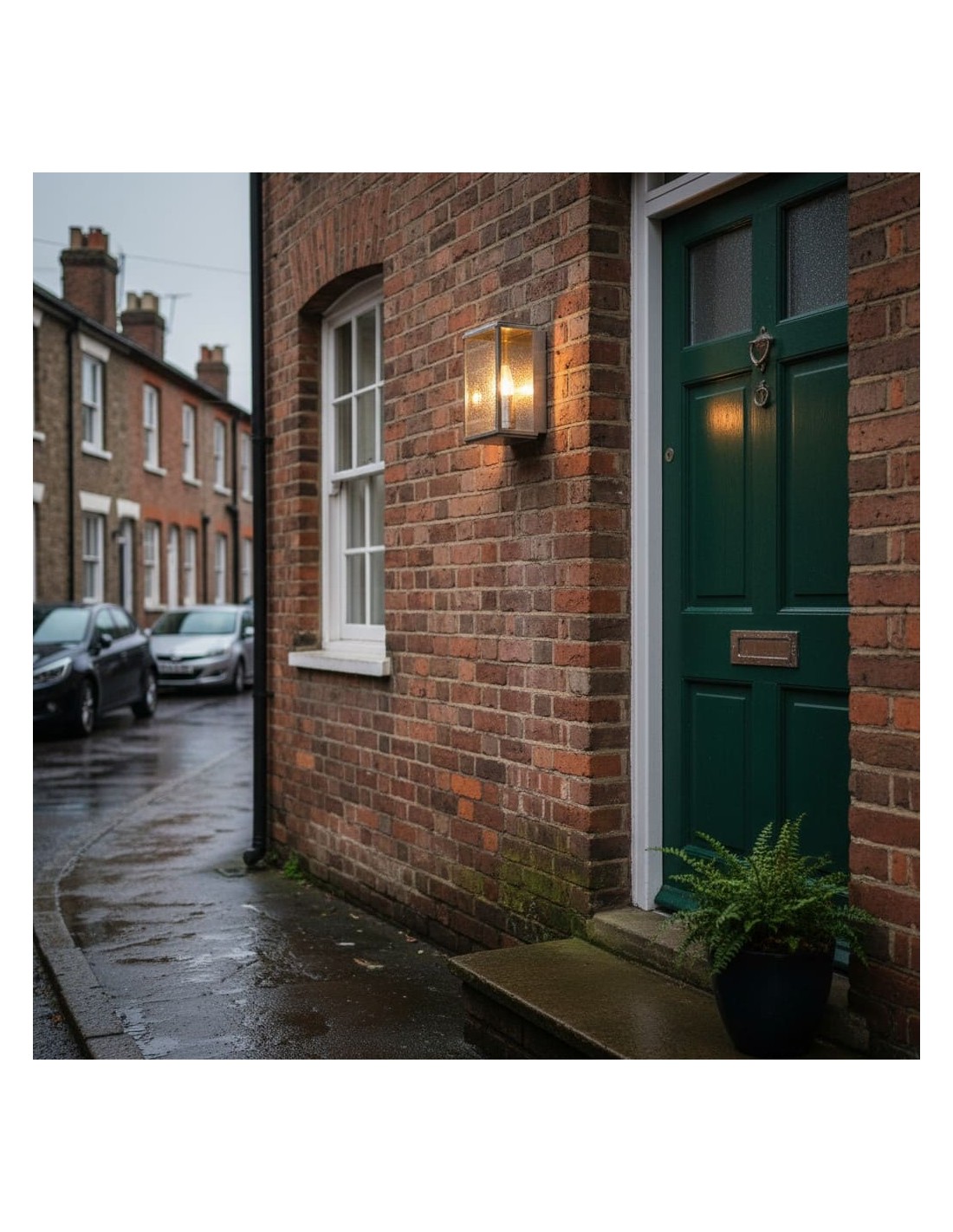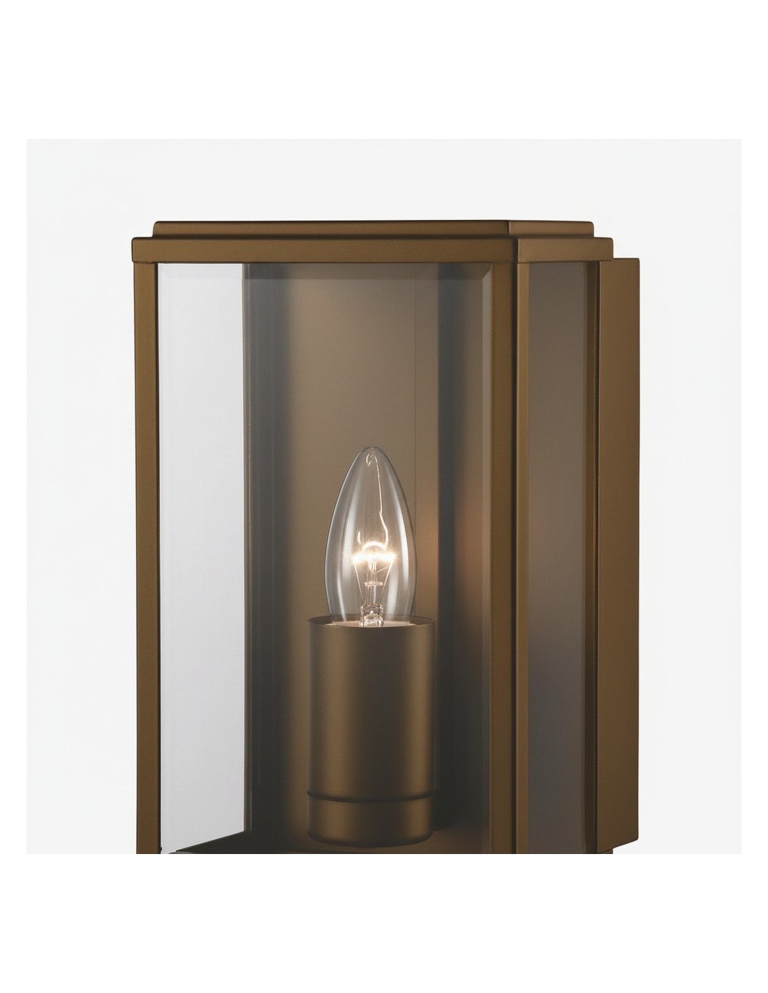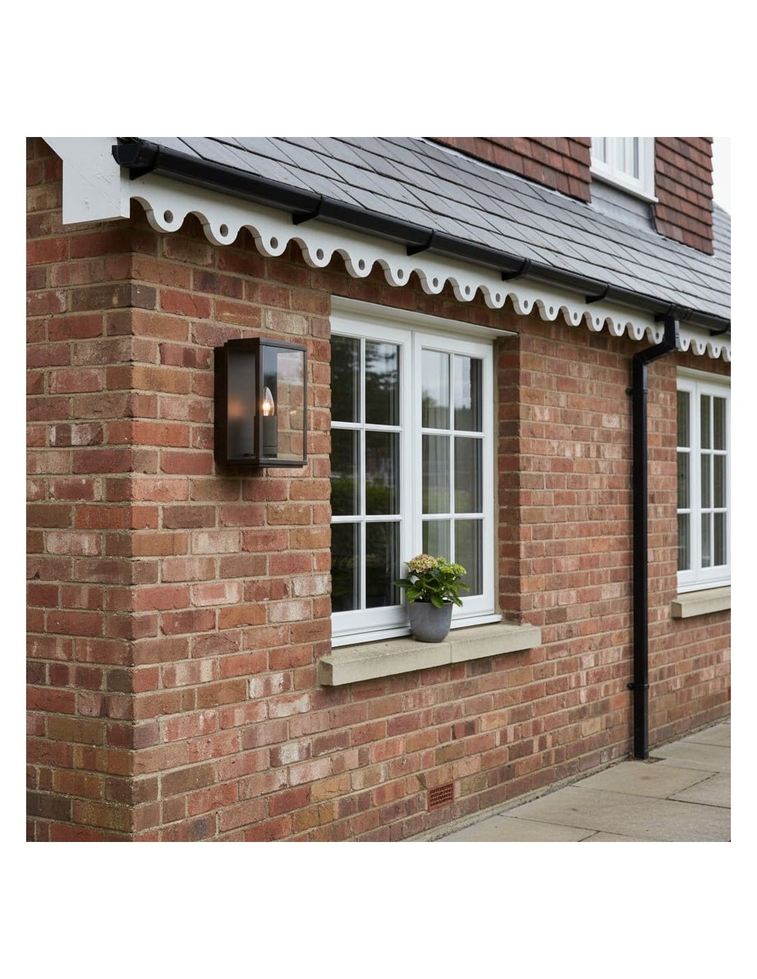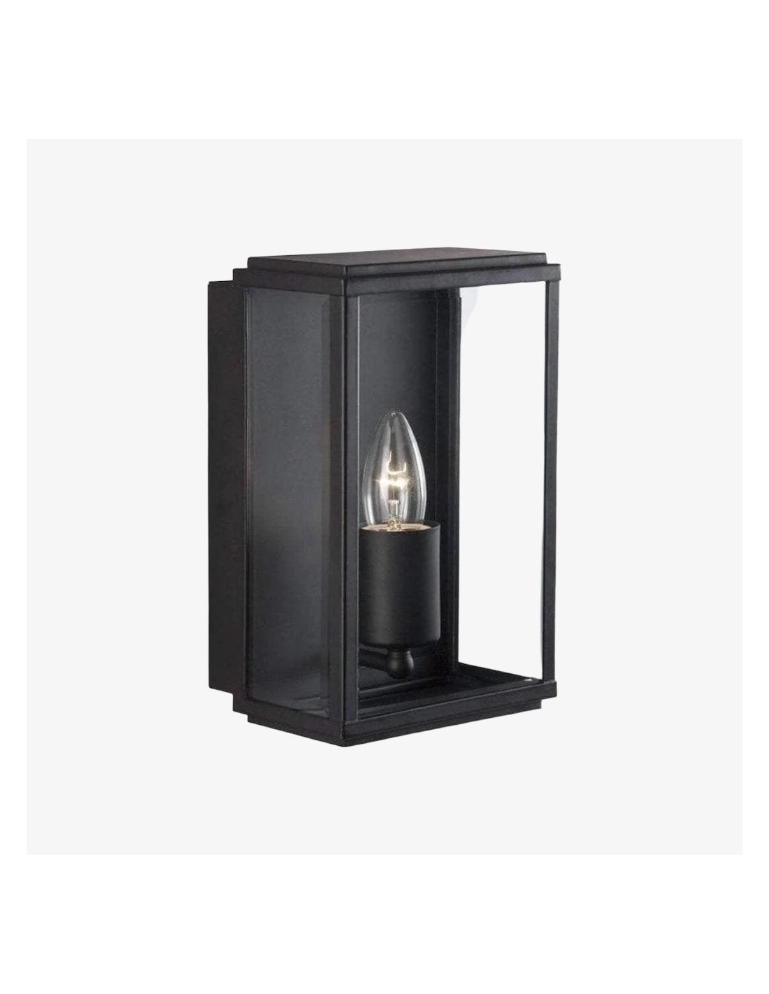 Questa lanterna da parete per esterni presenta una struttura metallica squadrata con pannelli in vetro trasparente, che offre un aspetto pulito e strutturato. Costruita per resistere agli agenti atmosferici, la sua struttura robusta la rende ideale per portici, ingressi, patii e muri da giardino. Disponibile in una varietà di finiture per adattarsi a diversi stili di esterni.