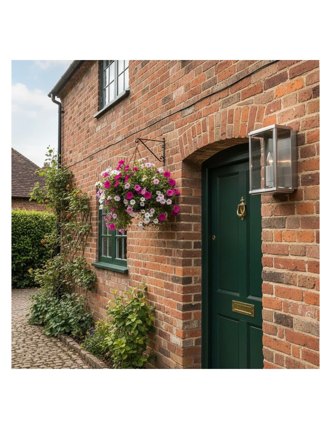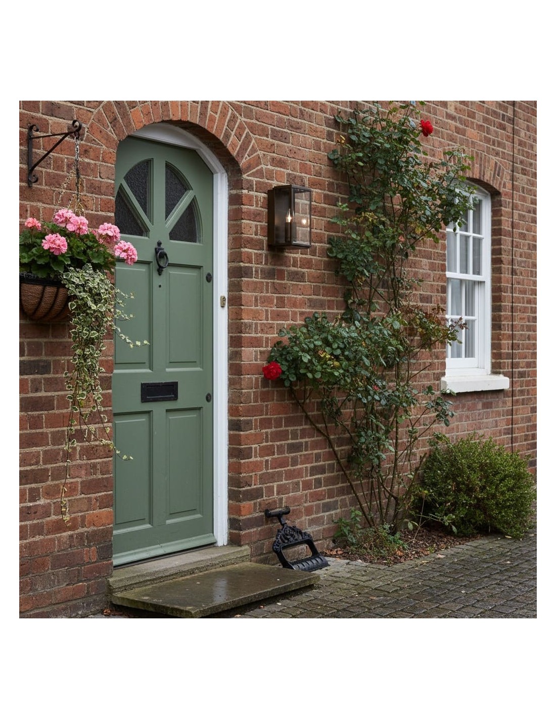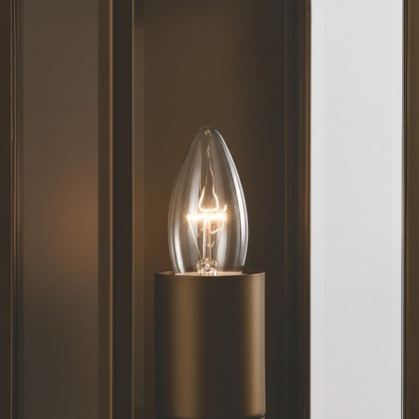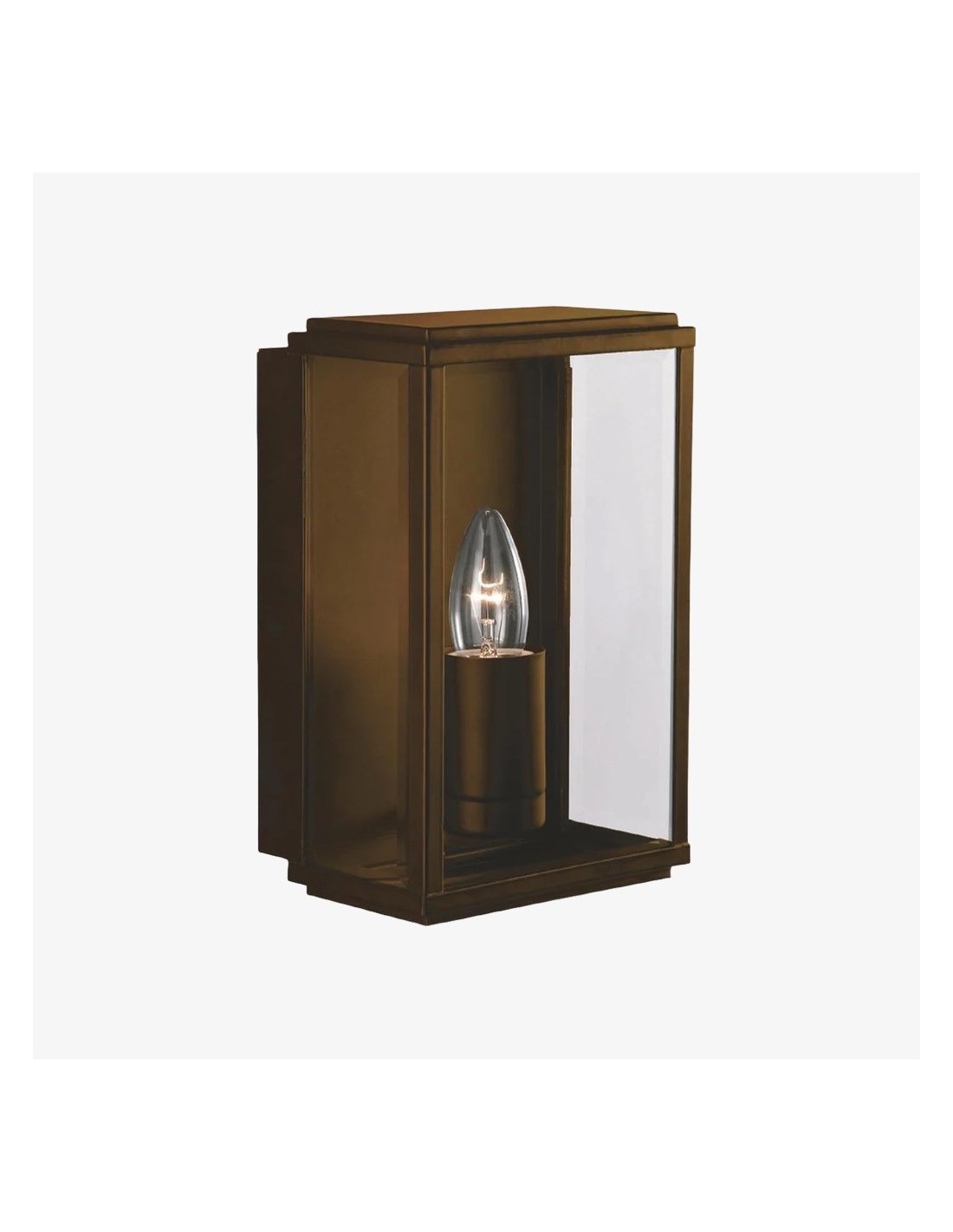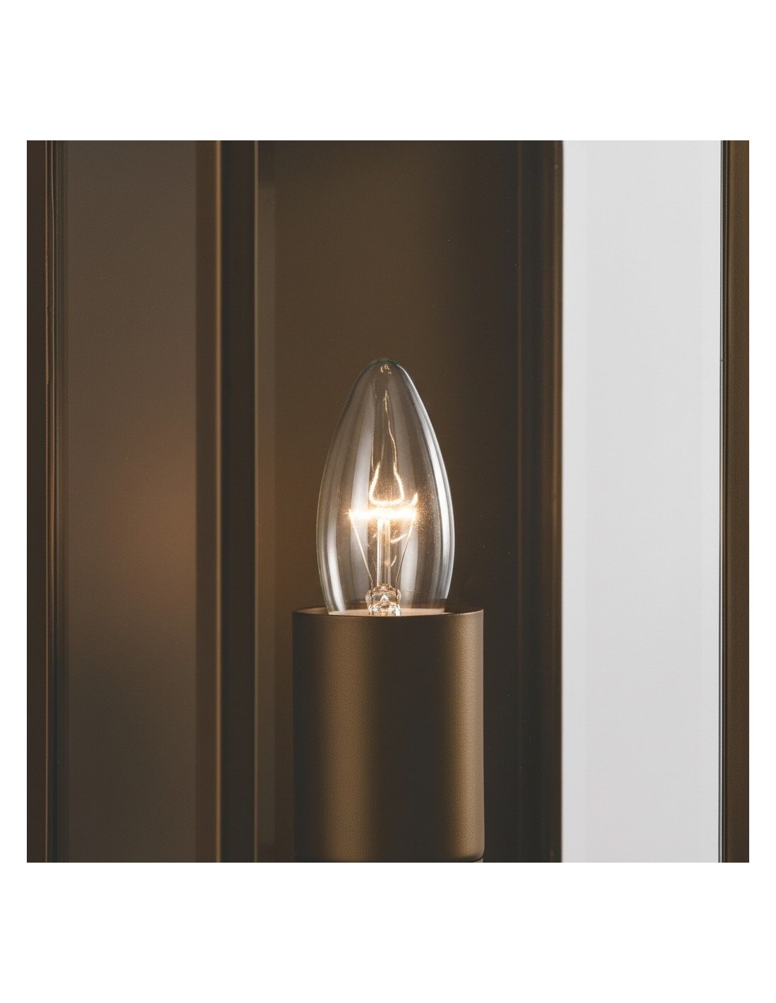 Questa lanterna da parete per esterni presenta una struttura metallica squadrata con pannelli in vetro trasparente, che offre un aspetto pulito e strutturato. Costruita per resistere agli agenti atmosferici, la sua struttura robusta la rende ideale per portici, ingressi, patii e muri da giardino. Disponibile in una varietà di finiture per adattarsi a diversi stili di esterni.