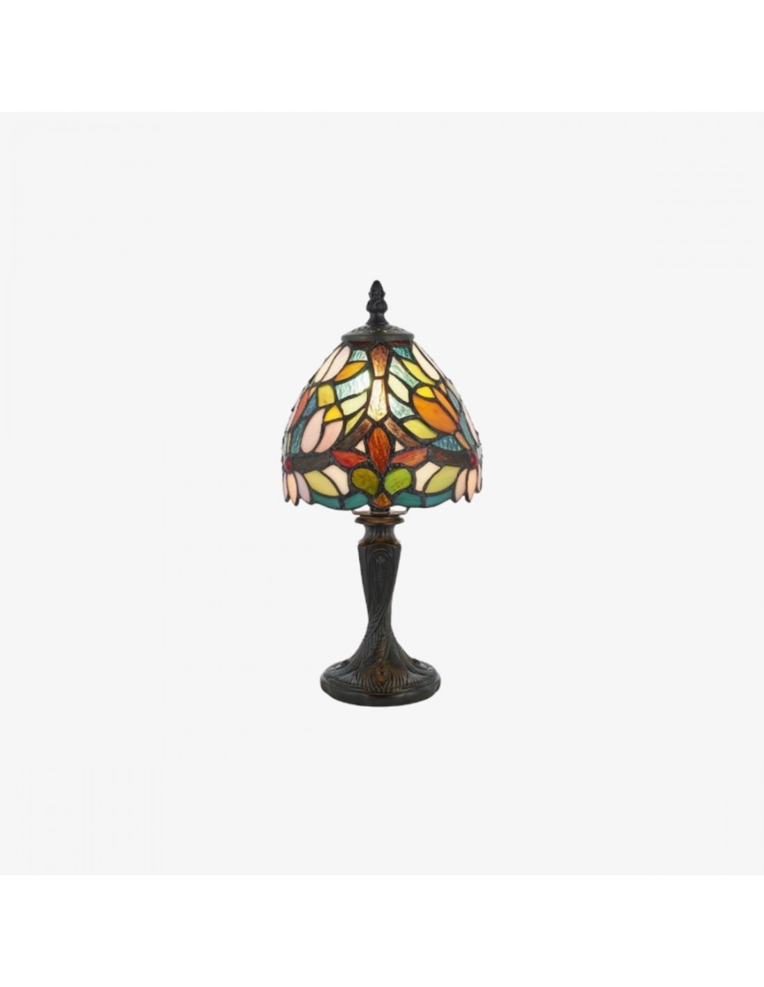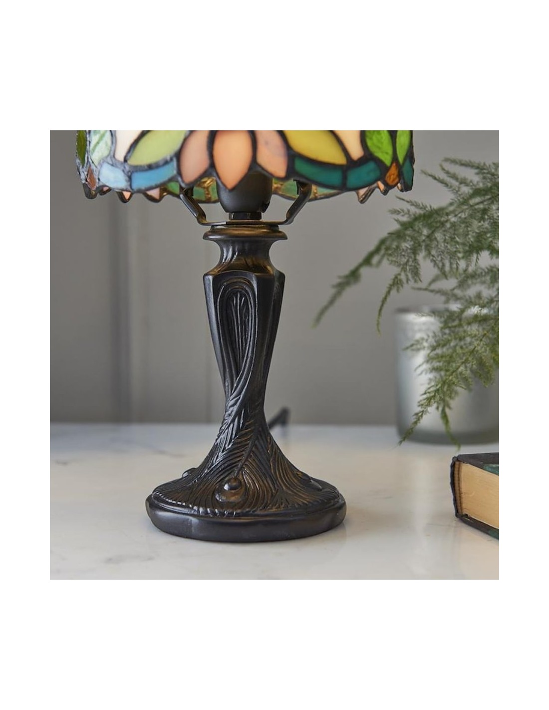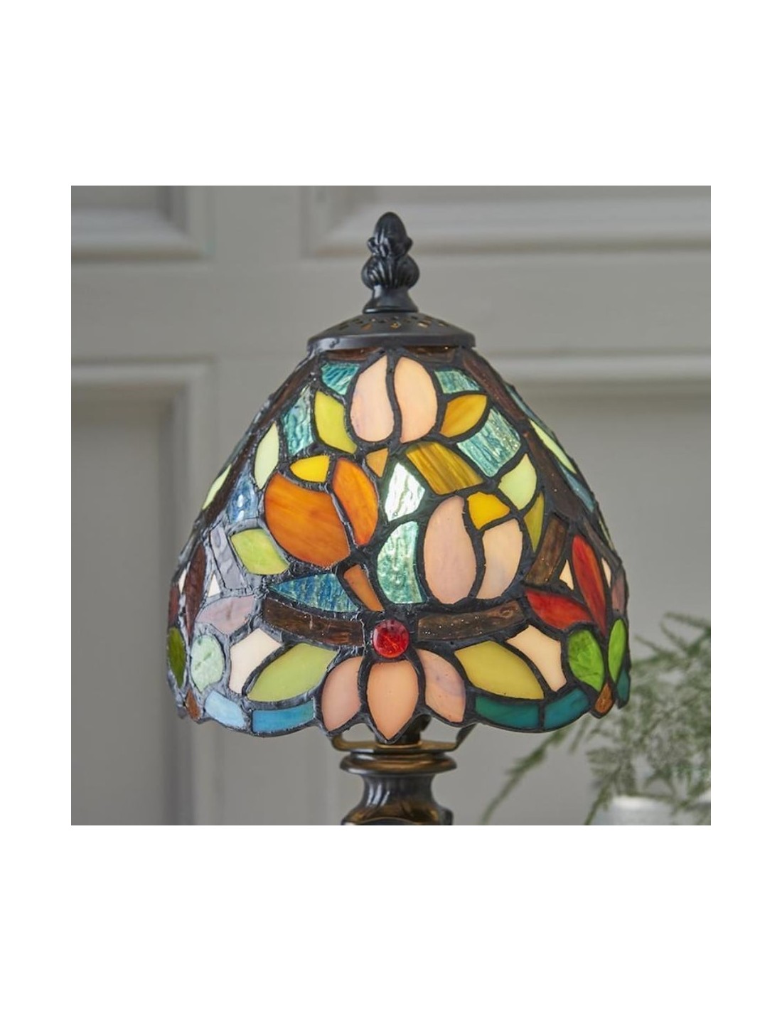 Illumina il tuo spazio con un'eleganza senza tempo. Questa lampada da tavolo Calyra, ispirata all'Art Déco, presenta uno splendido paralume in vetro colorato lavorato a mano con un intricato motivo floreale. La luce calda e ambientale filtra attraverso il vetro vibrante, creando un'atmosfera accogliente, perfetta per qualsiasi comodino, scrivania o angolo del soggiorno.