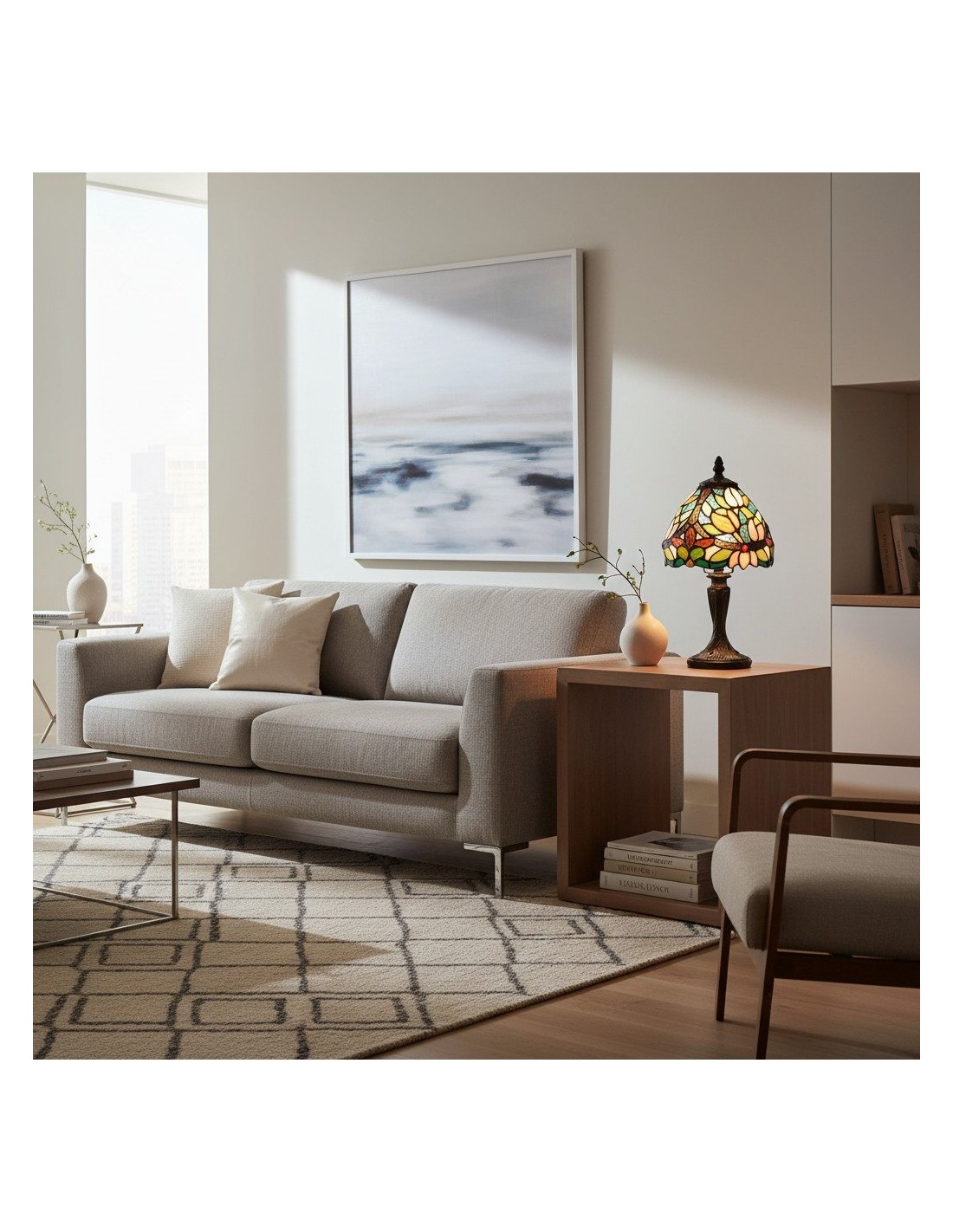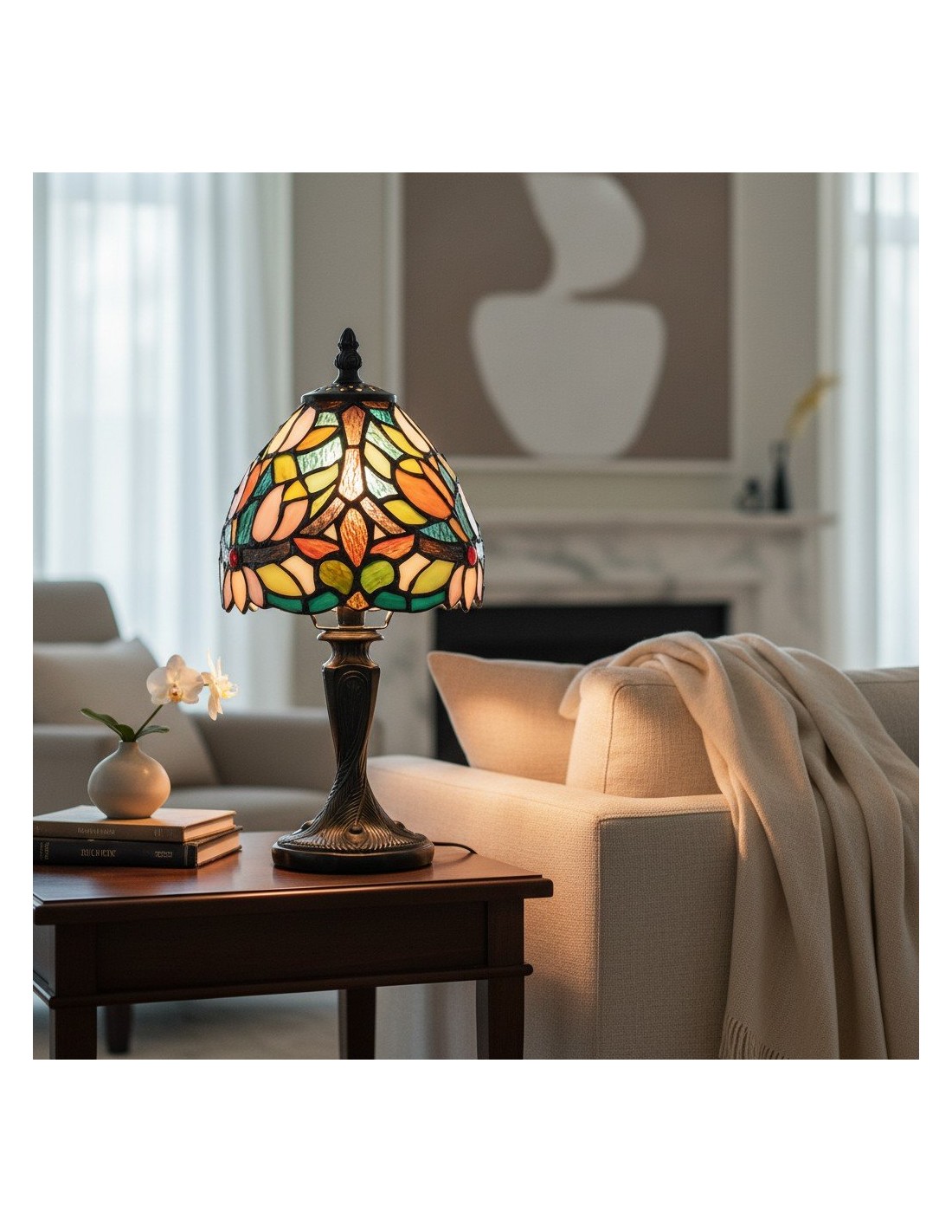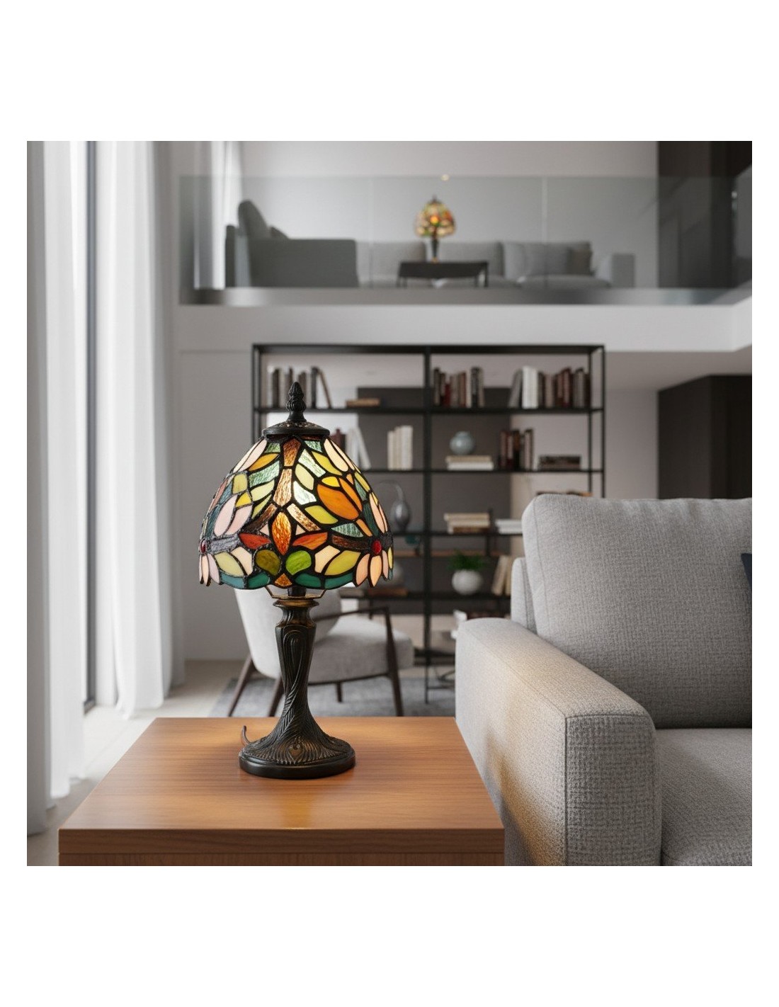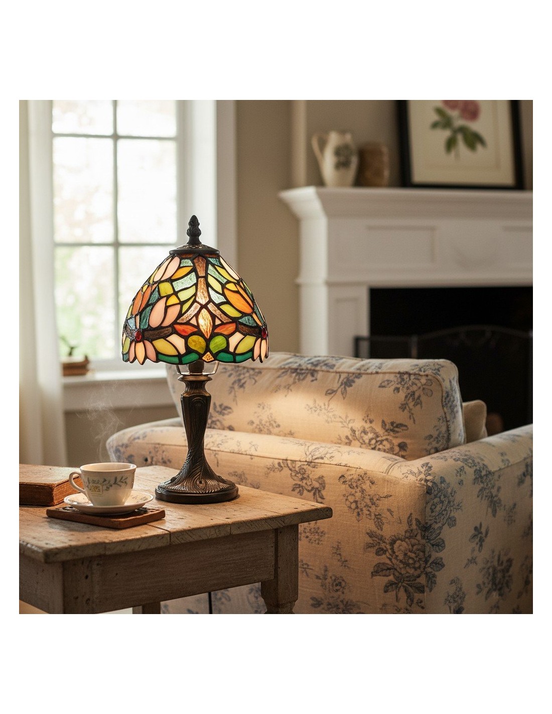 Illumina il tuo spazio con un'eleganza senza tempo. Questa lampada da tavolo Calyra, ispirata all'Art Déco, presenta uno splendido paralume in vetro colorato lavorato a mano con un intricato motivo floreale. La luce calda e ambientale filtra attraverso il vetro vibrante, creando un'atmosfera accogliente, perfetta per qualsiasi comodino, scrivania o angolo del soggiorno.