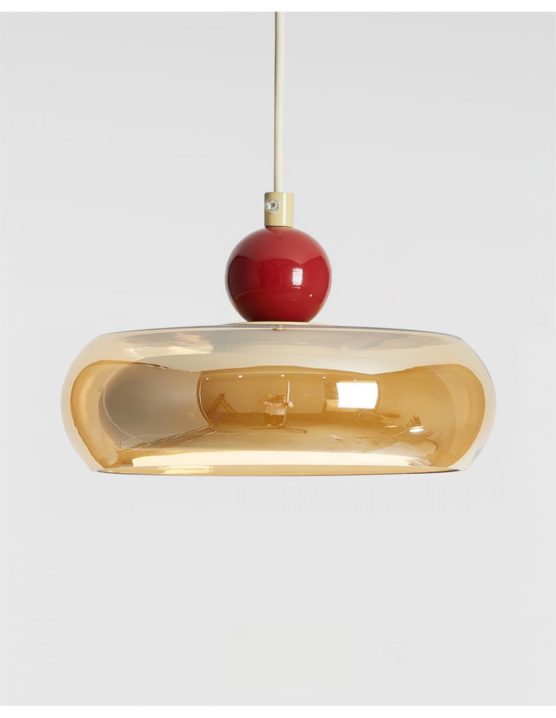 Scopri l'eleganza della Cherry Shape Glass Pendant Lamp, dove il design moderno incontra la raffinatezza giocosa. Questa lampada a sospensione presenta un sorprendente paralume in vetro color cognac che emette una luce calda e invitante, perfettamente completata dall'accento rosso audace nella parte superiore. La sua forma elegante e arrotondata aggiunge un tocco di stile contemporaneo a qualsiasi spazio, rendendola un elemento centrale ideale per sale da pranzo o soggiorni.