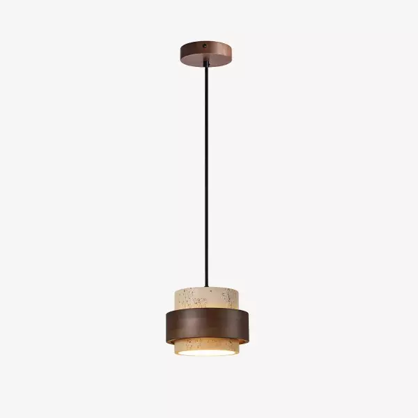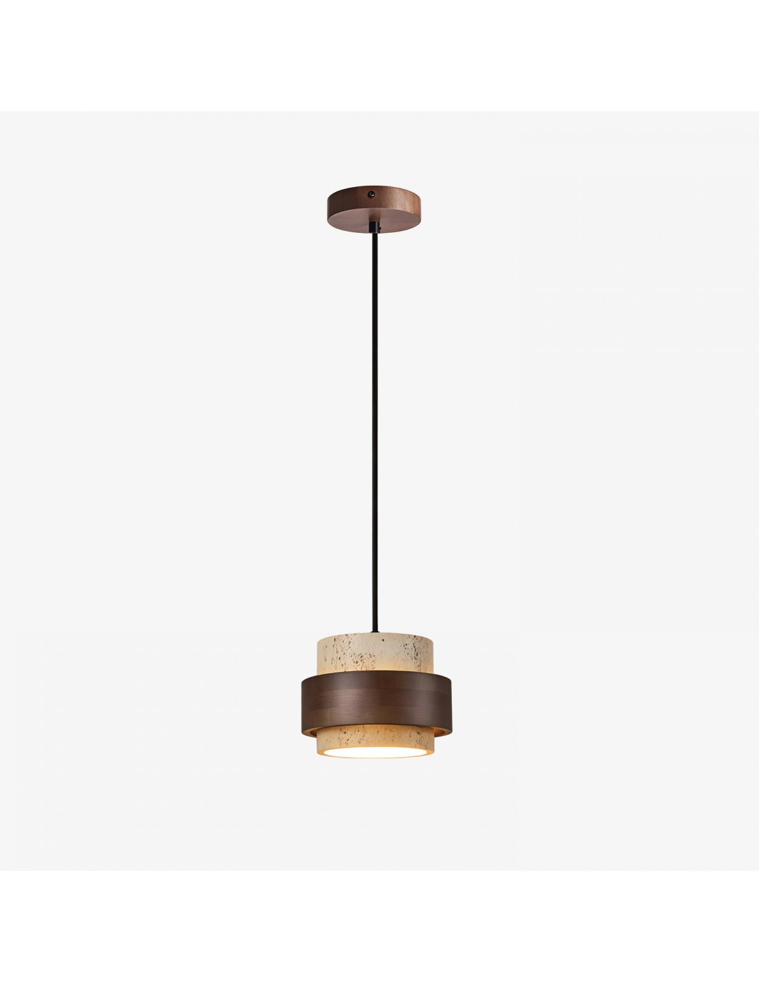 La lampada a sospensione Travertine, una straordinaria combinazione di eleganza naturale e design industriale. Questa lampada unica presenta un paralume cilindrico in vera pietra di travertino, che ne mette in mostra i motivi intrinseci e i toni caldi e terrosi. Circondata da una fascia in legno di noce che aggiunge un tocco contemporaneo, la lampada è progettata per proiettare una luce soffusa e ambientale, esaltando la consistenza visiva della pietra. Questa lampada non solo illumina uno spazio, ma funge anche da elemento centrale che fonde senza sforzo materiali rustici con l'architettura moderna.