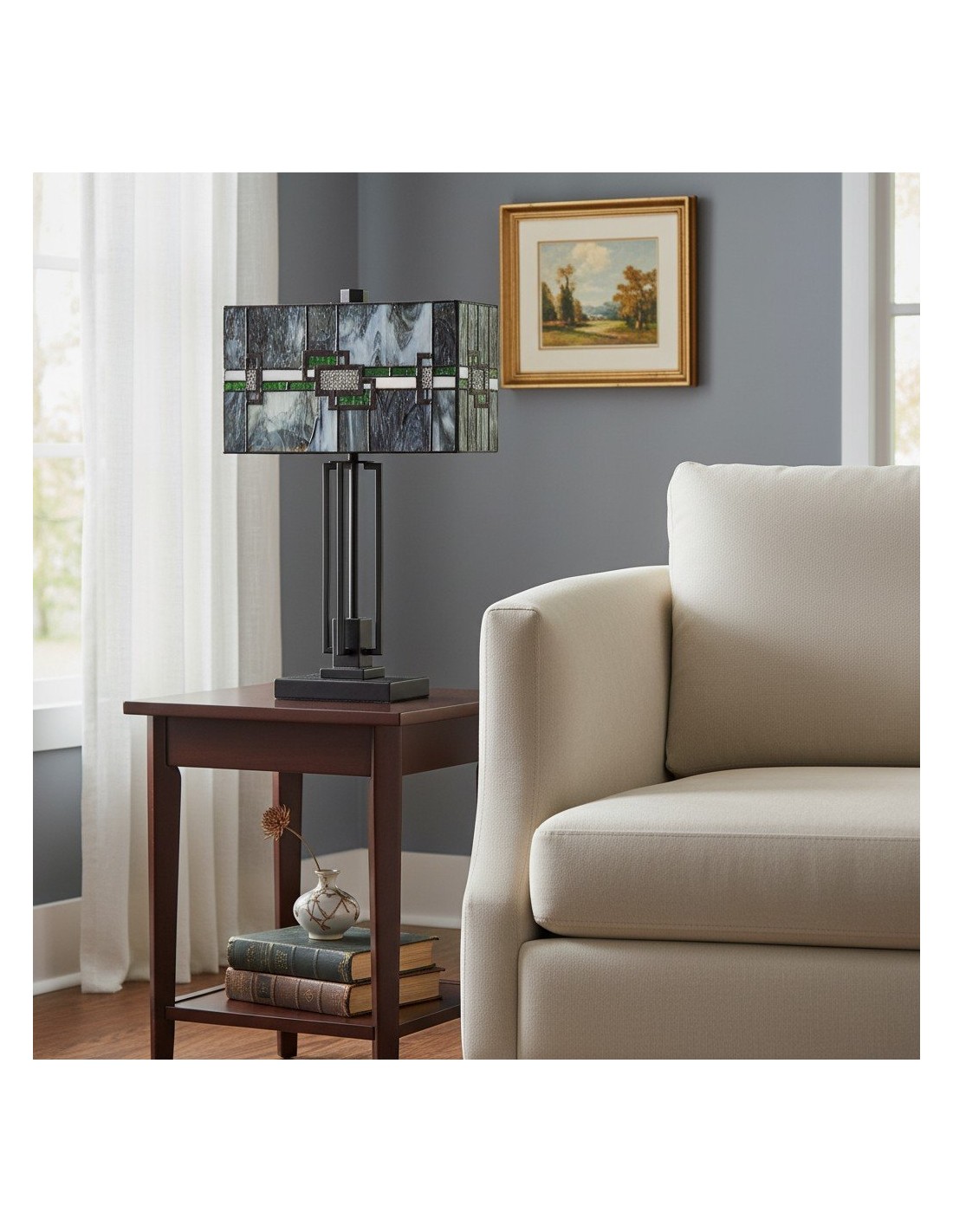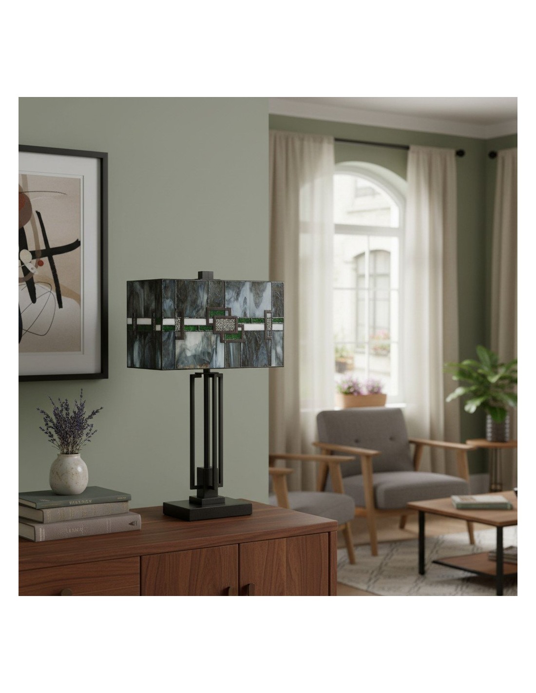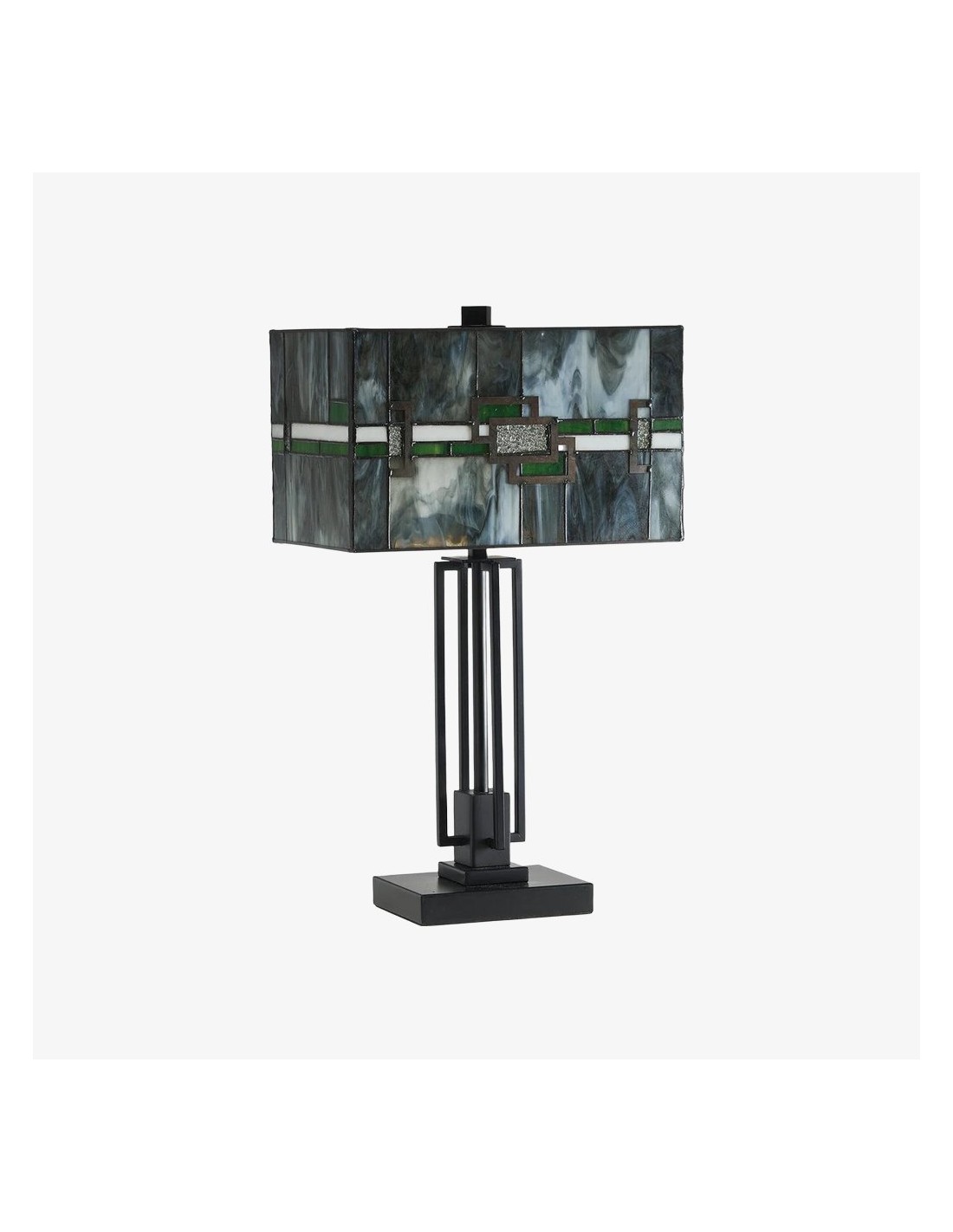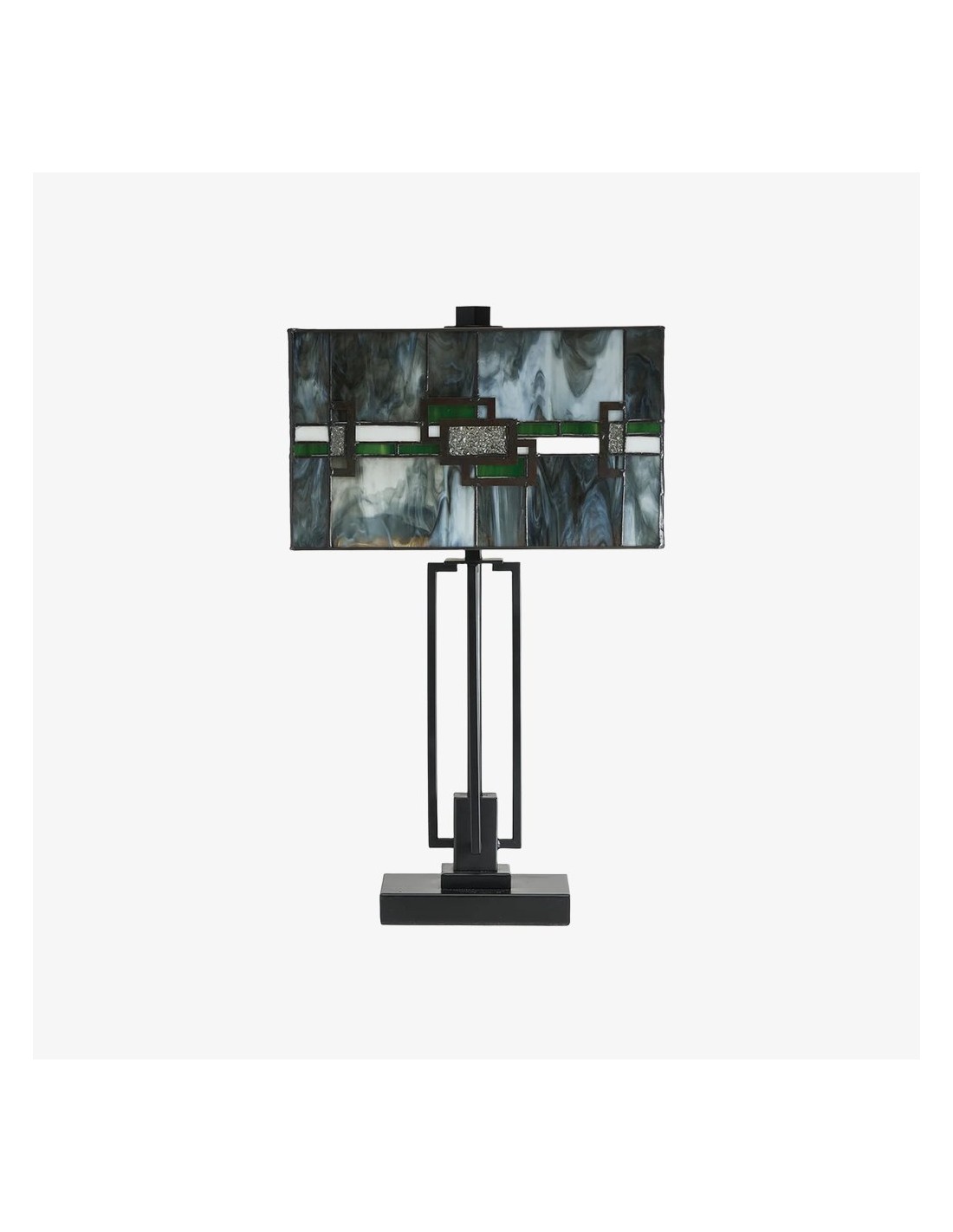 Questa lampada da tavolo presenta un sottile paralume rettangolare realizzato con pezzi di vetro tagliati singolarmente, creando un sorprendente motivo geometrico dal carattere artigianale. Il suo profilo compatto si adatta a superfici strette, mentre la luce calda valorizza soggiorni, camere da letto, corridoi e interni moderni o classici.