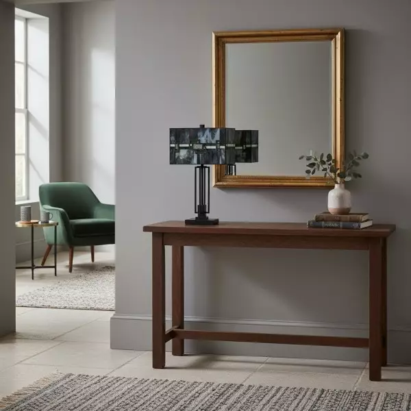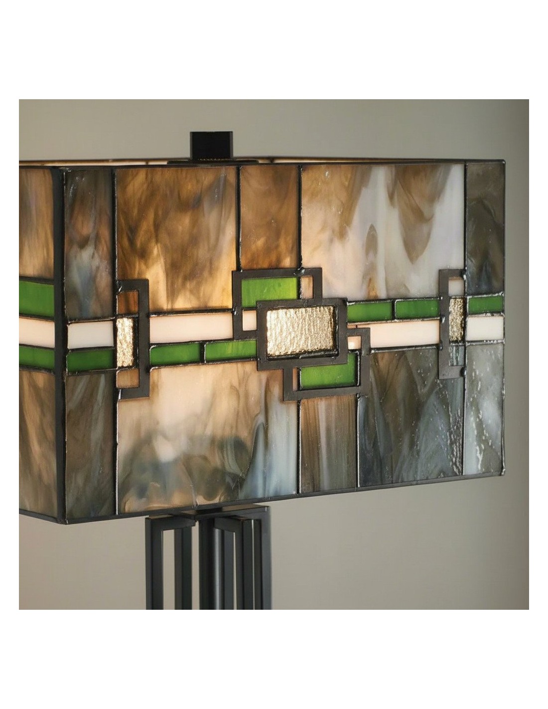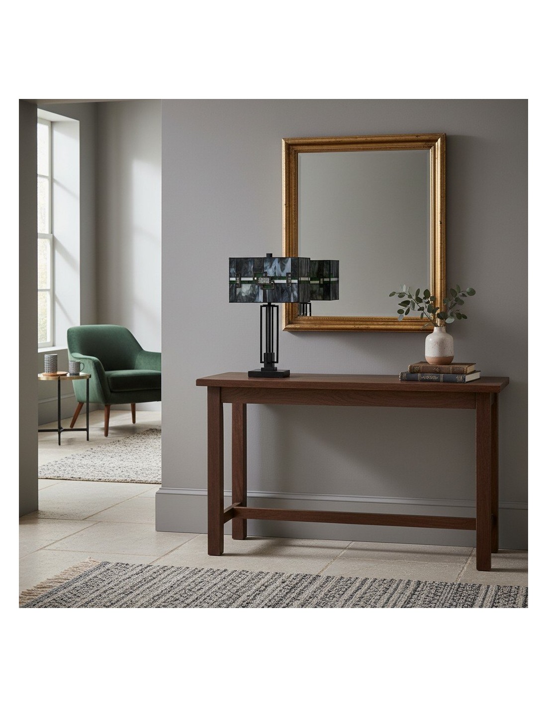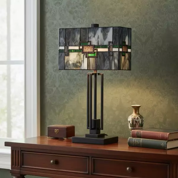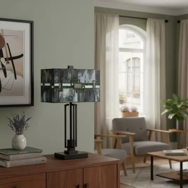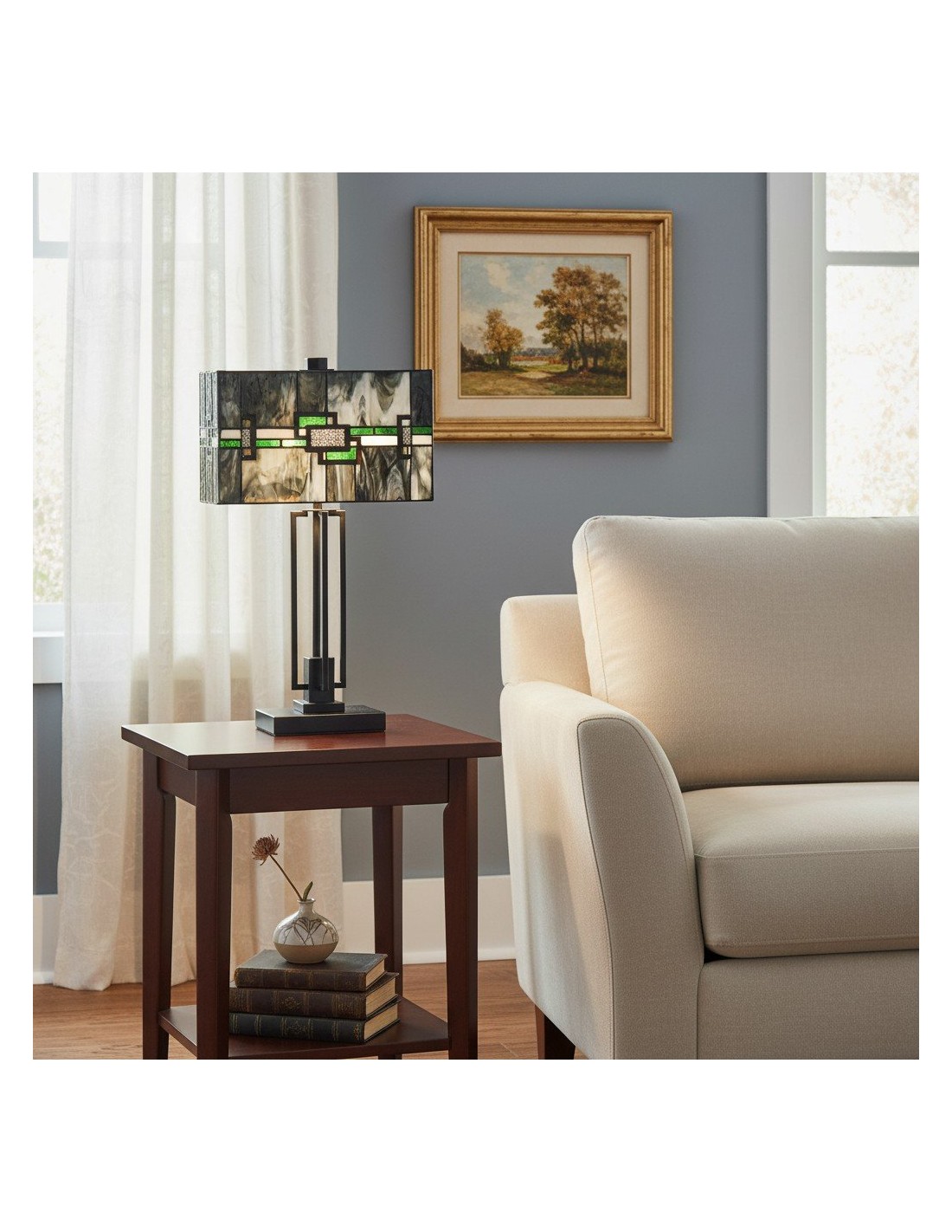 Questa lampada da tavolo presenta un sottile paralume rettangolare realizzato con pezzi di vetro tagliati singolarmente, creando un sorprendente motivo geometrico dal carattere artigianale. Il suo profilo compatto si adatta a superfici strette, mentre la luce calda valorizza soggiorni, camere da letto, corridoi e interni moderni o classici.