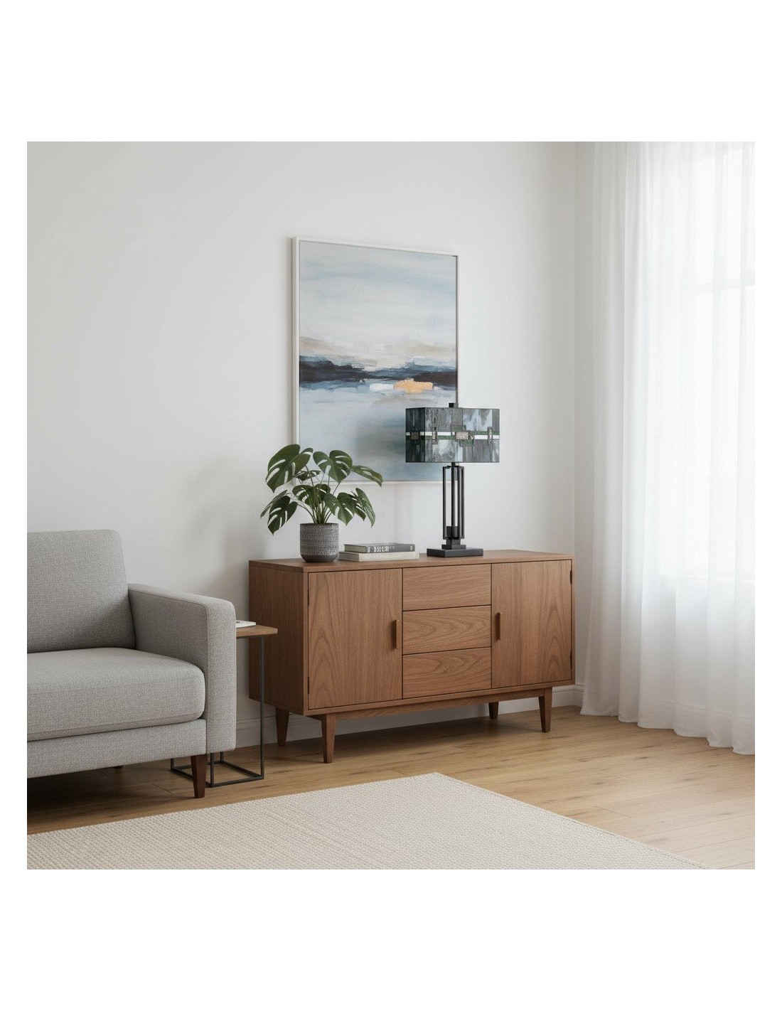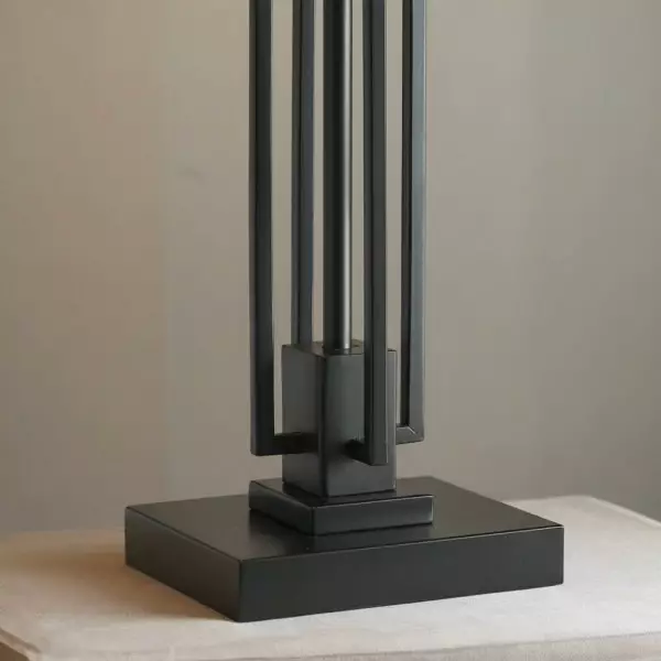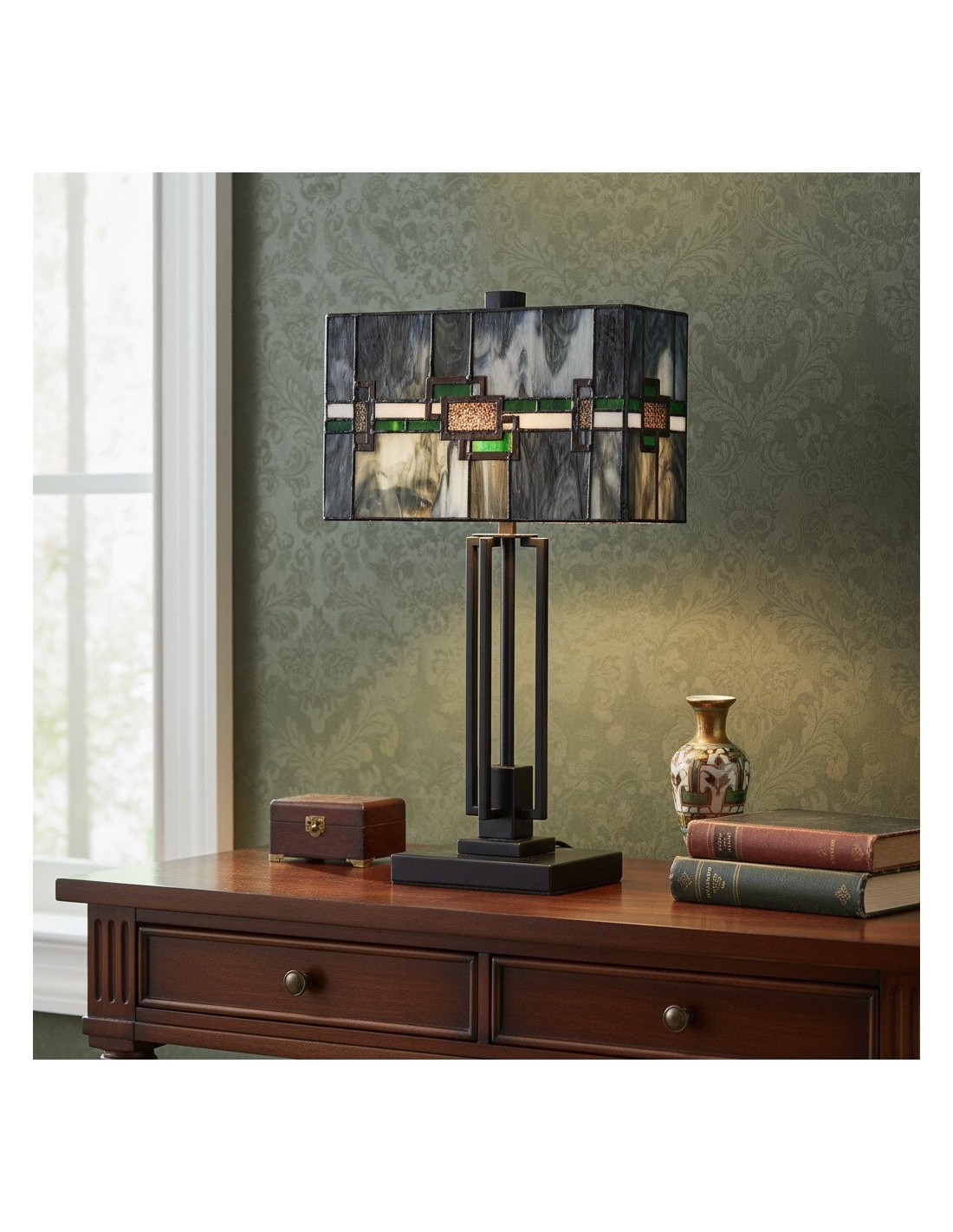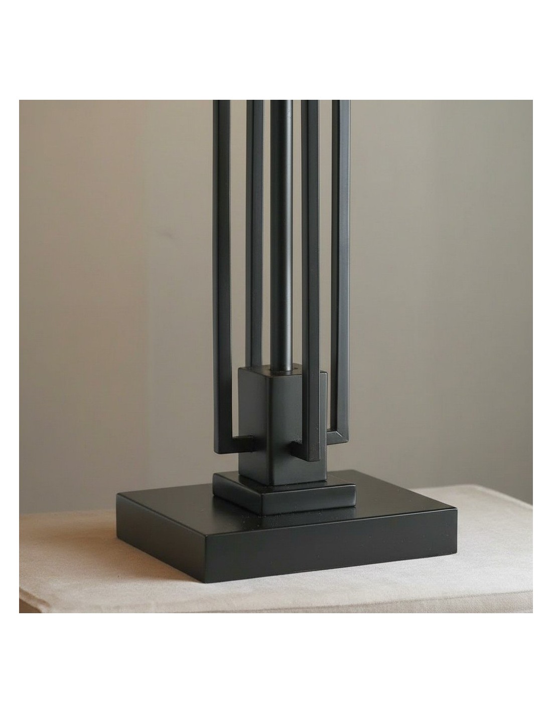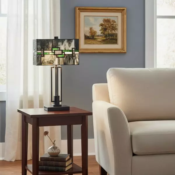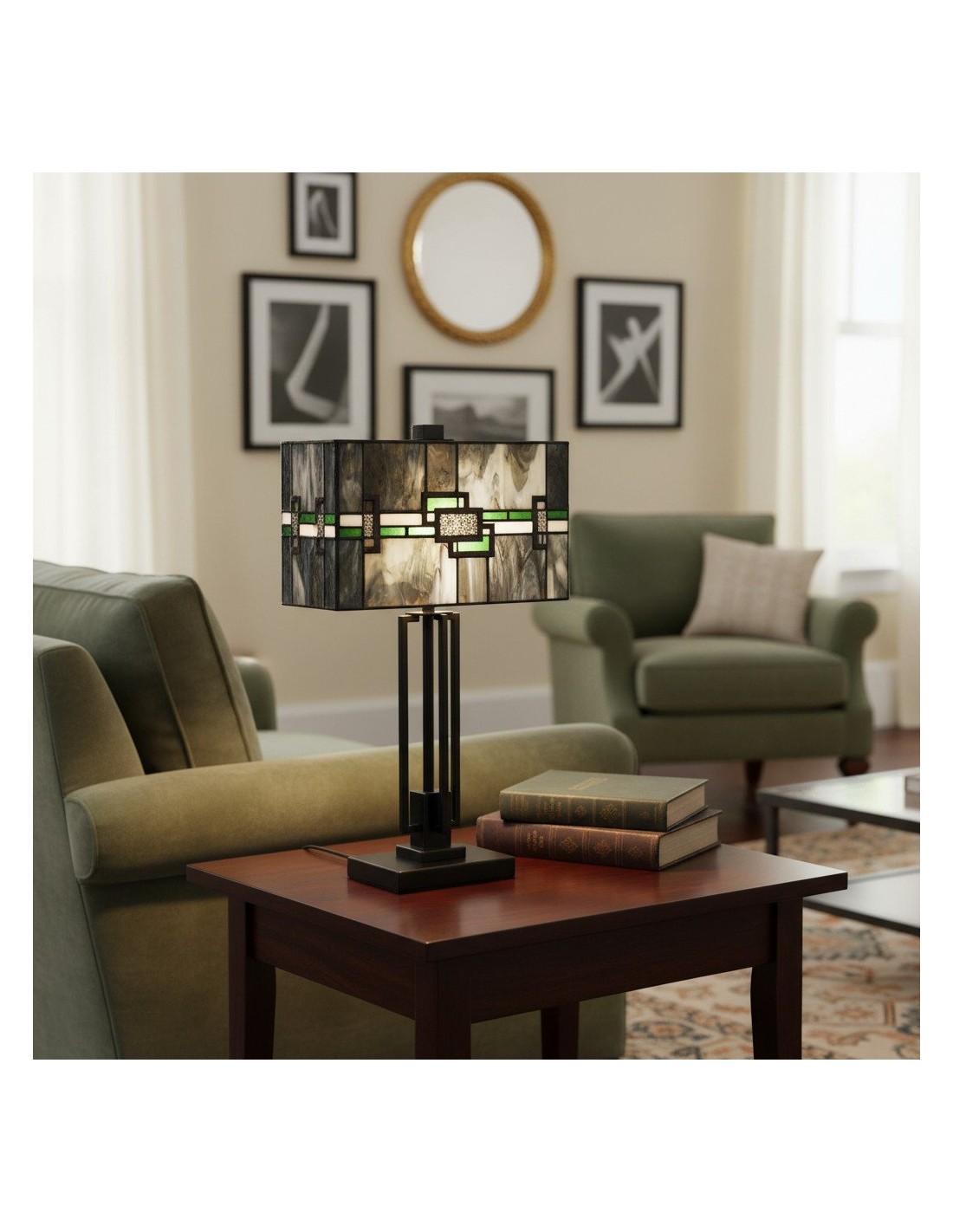 Questa lampada da tavolo presenta un sottile paralume rettangolare realizzato con pezzi di vetro tagliati singolarmente, creando un sorprendente motivo geometrico dal carattere artigianale. Il suo profilo compatto si adatta a superfici strette, mentre la luce calda valorizza soggiorni, camere da letto, corridoi e interni moderni o classici.