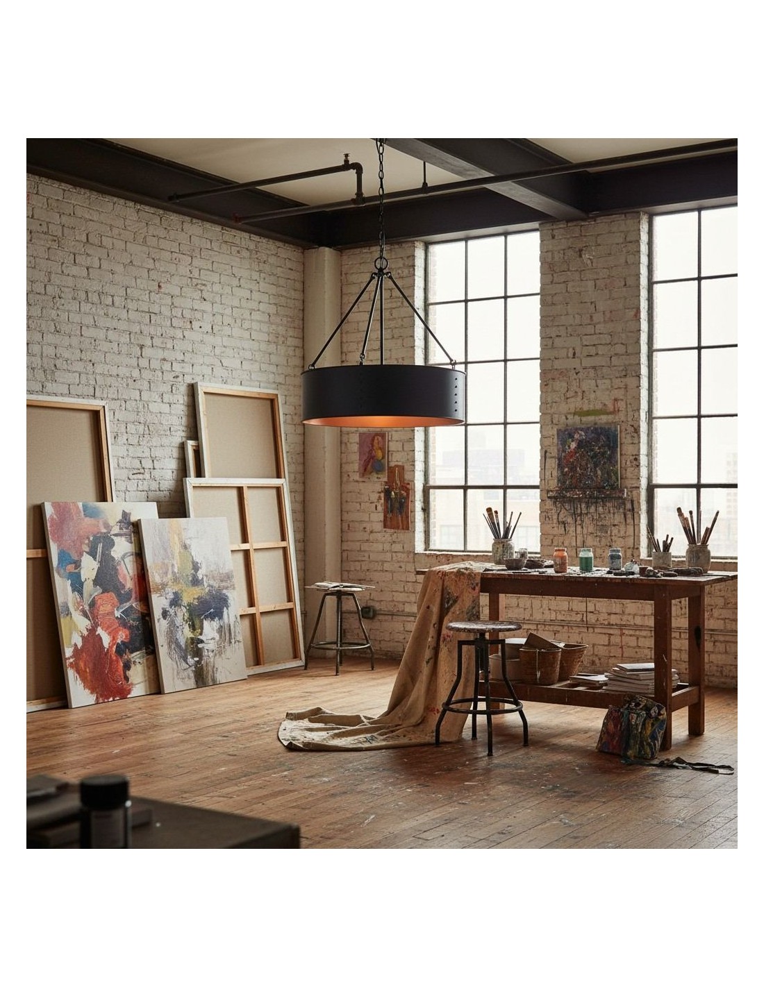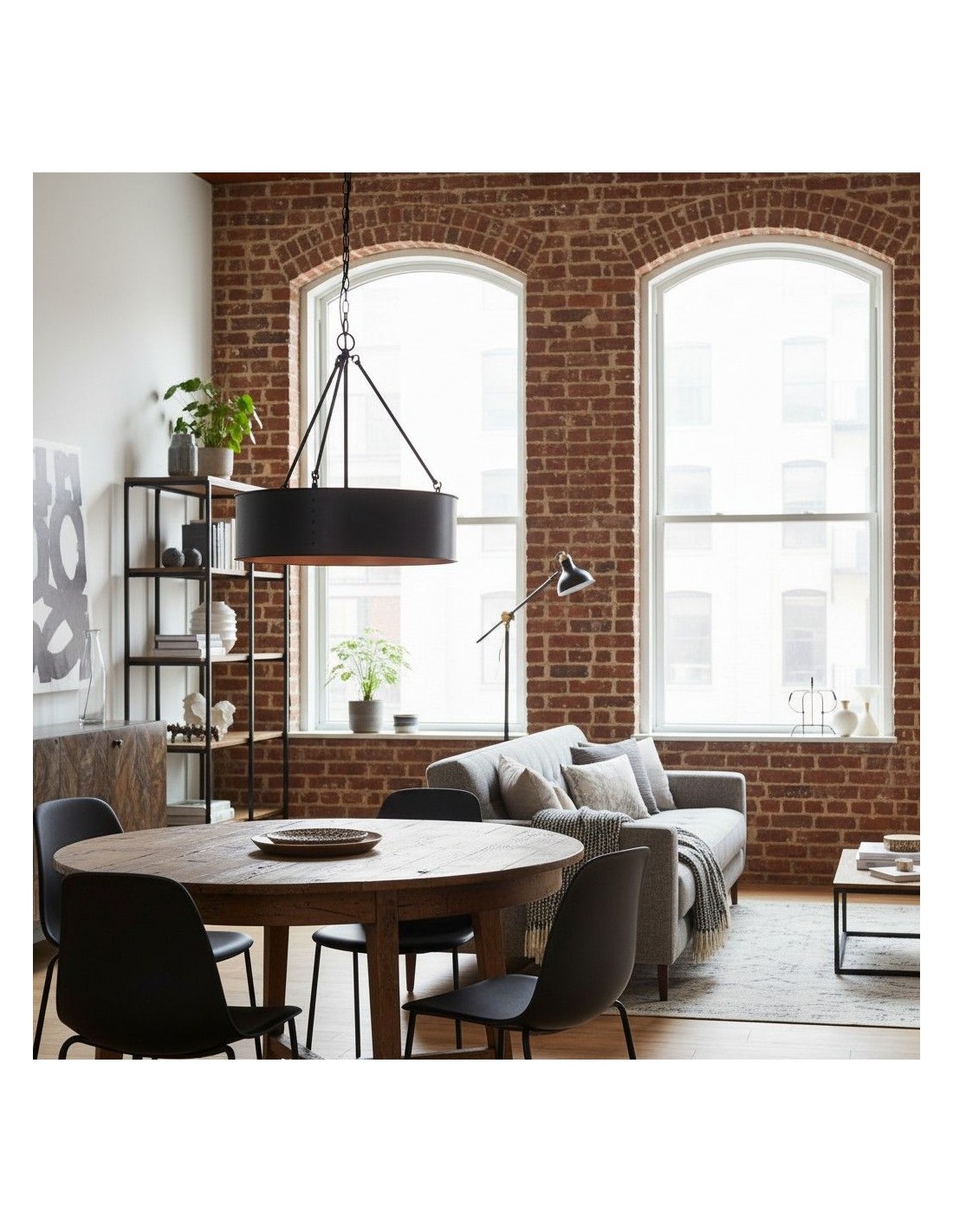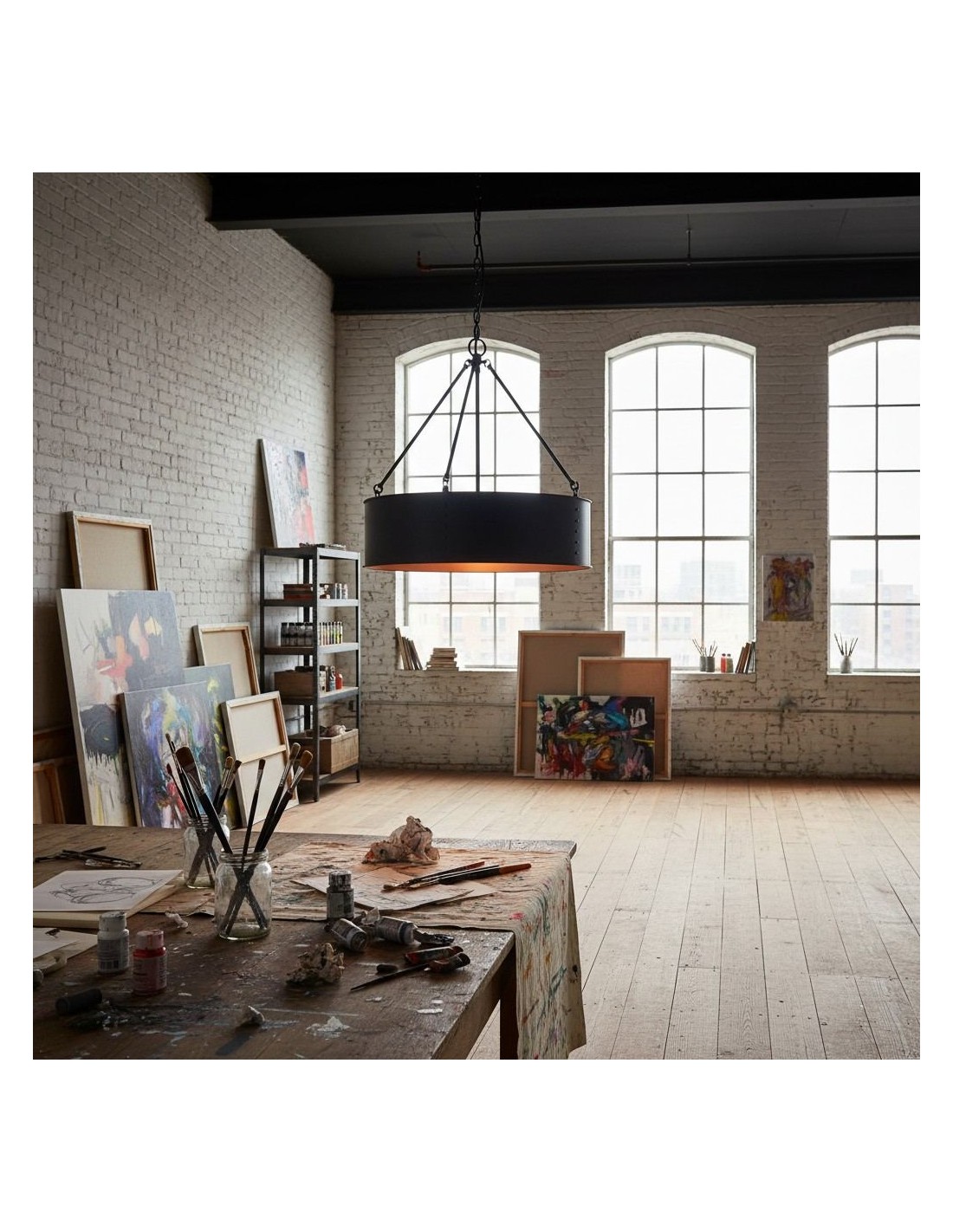 Valorizza gli interni con questa lampada a sospensione a tamburo industriale che fonde un tocco moderno con un fascino rustico. Caratterizzata da un'audace silhouette cilindrica e da un resistente paralume in metallo, diffonde un'illuminazione ambientale su sale da pranzo, ingressi, soggiorni, cucine e altro ancora.