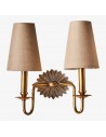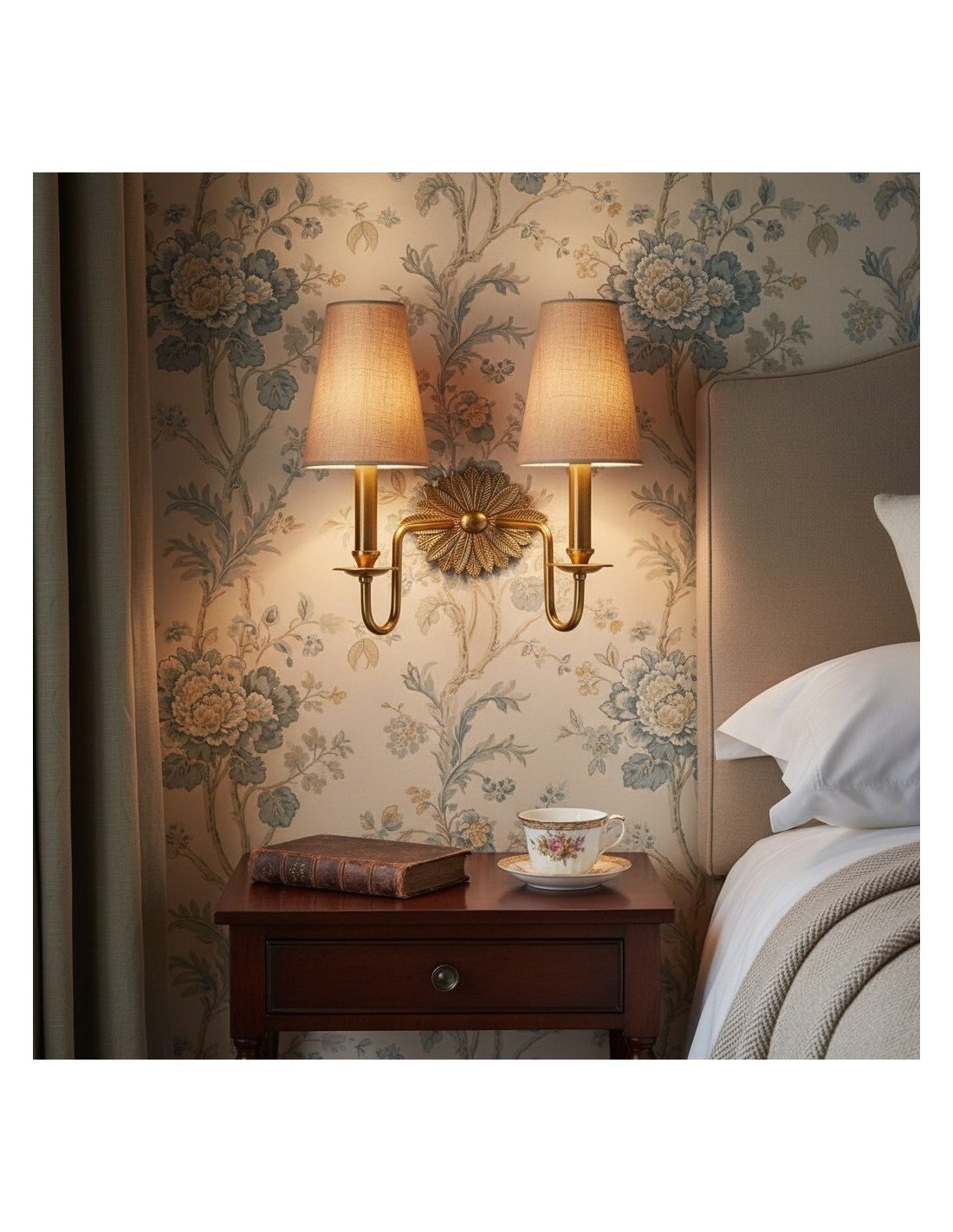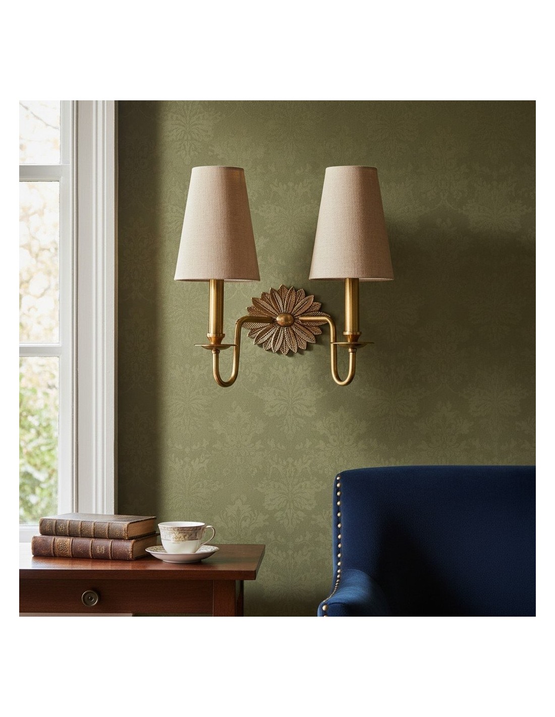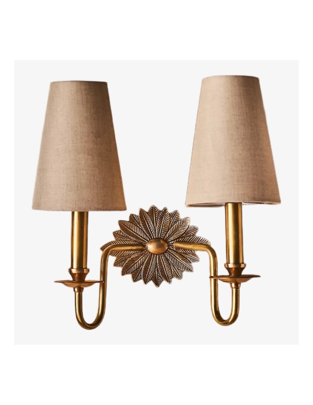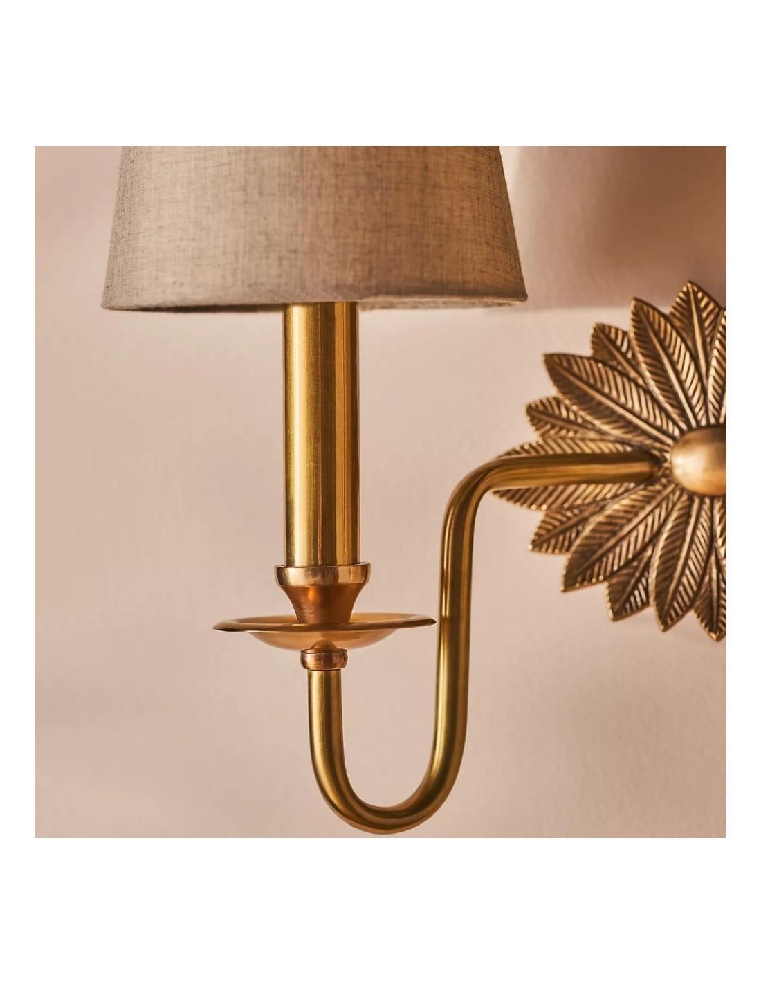 L'applique doppia presenta un design scultoreo in metallo che ricorda l'eleganza, con una calda finitura in ottone anticato. Due sottili bracci sostengono paralumi in lino stile impero. Questa lampada da parete doppia dona un tocco raffinato a corridoi, soggiorni, uffici o camere da letto.