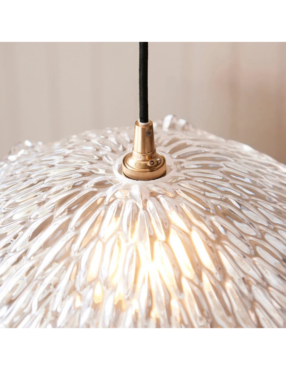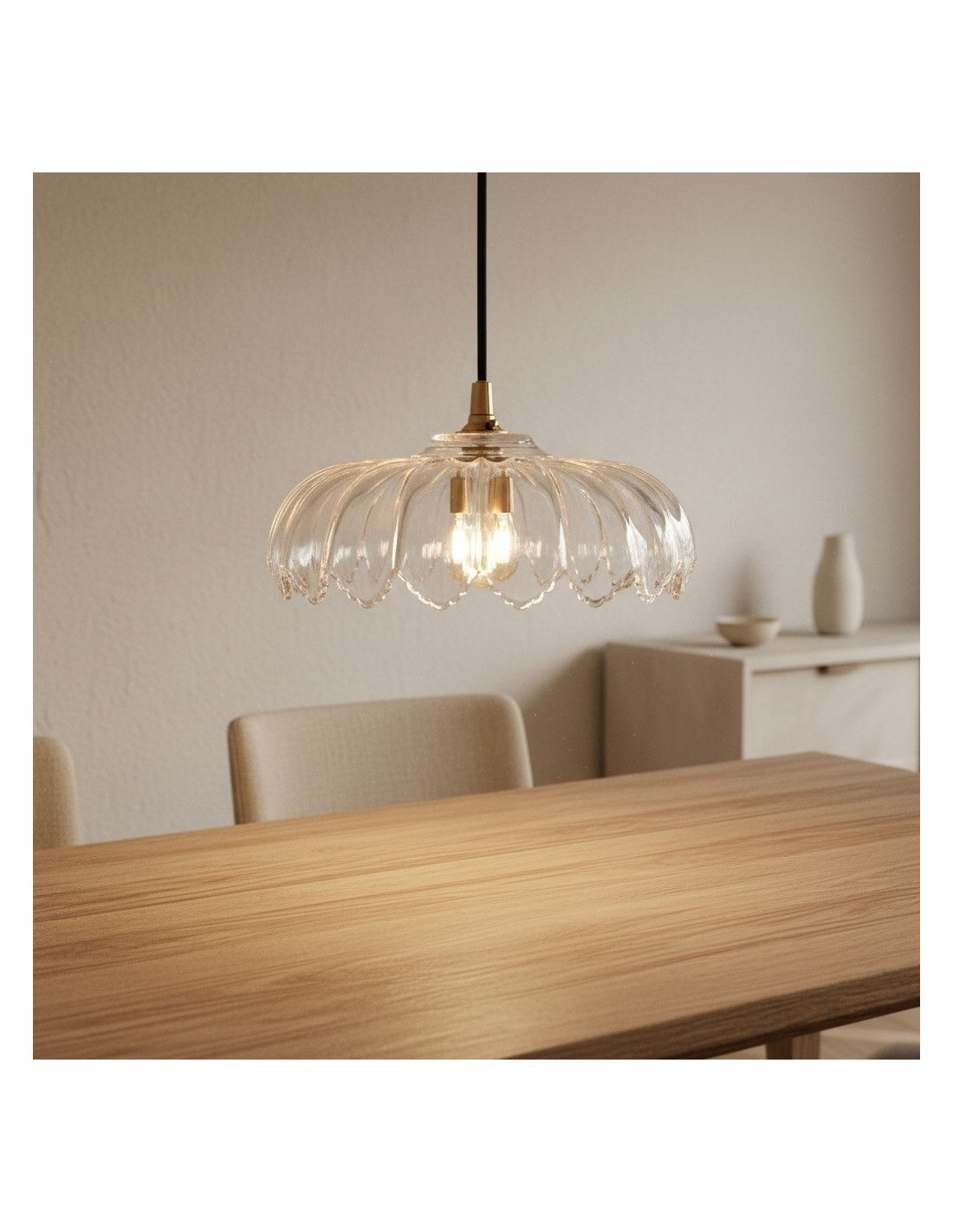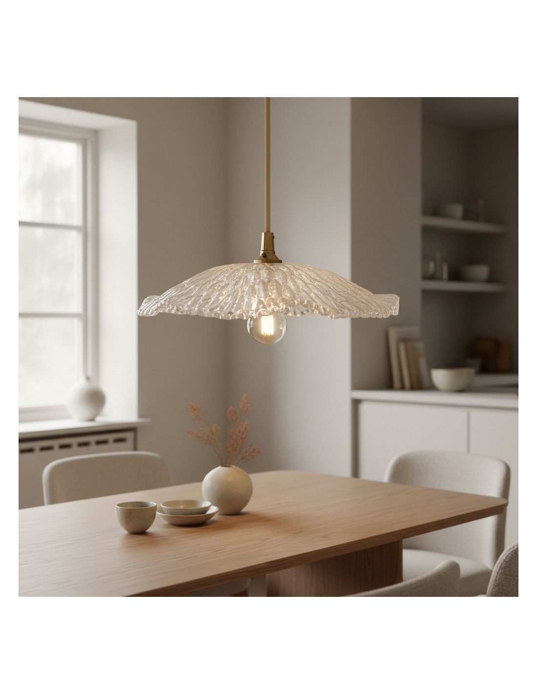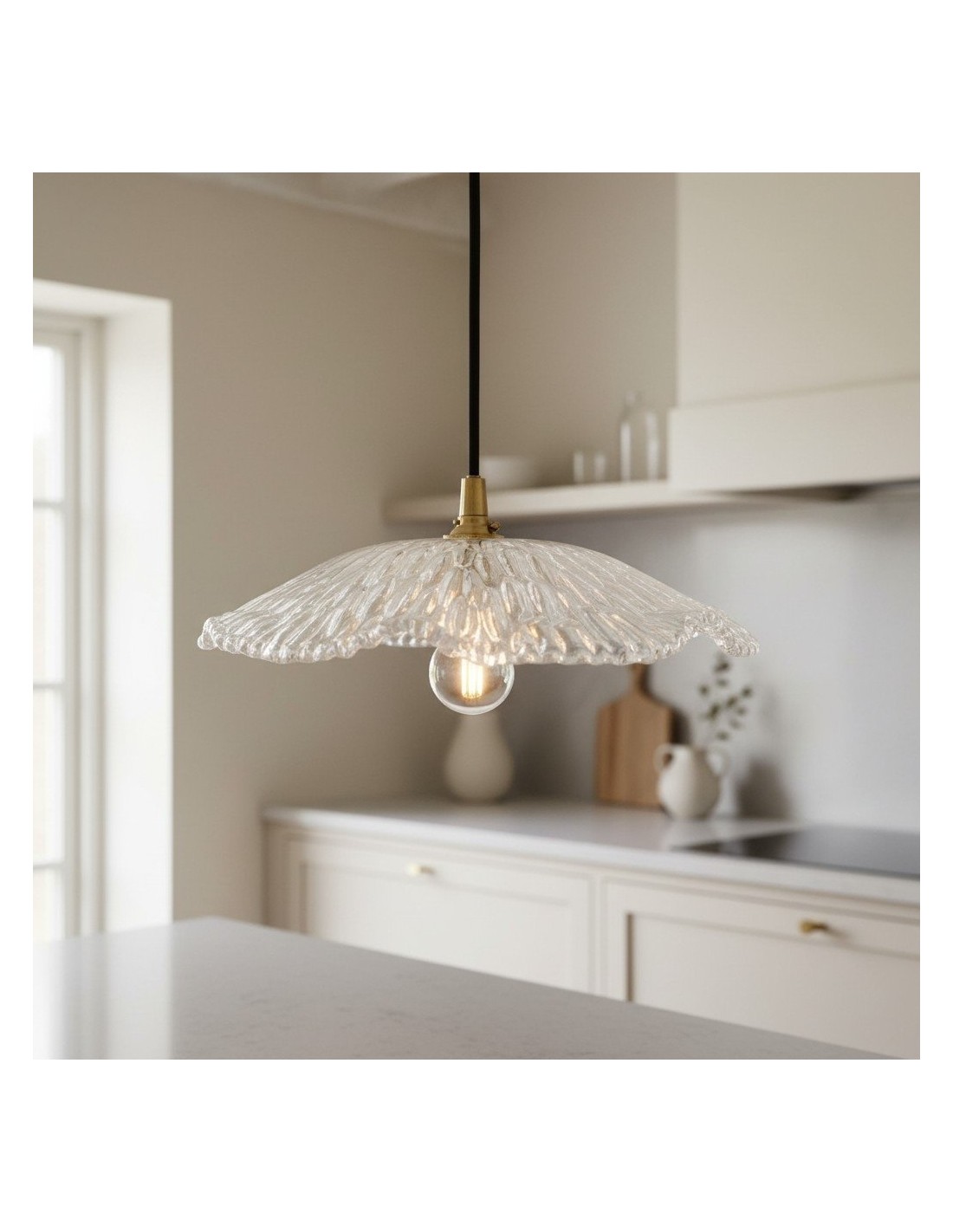 Una lampada a sospensione in vetro floreale Floriaxis che fonde forma decorativa e funzionalità quotidiana. Ogni modello presenta una forma a fiore abbinata a un cavo di sospensione intrecciato in tessuto (disponibile in colore naturale o nero). Versatile ed elegante, dona un fascino classico e artistico a cucine, sale da pranzo e ambienti dedicati all'ospitalità.