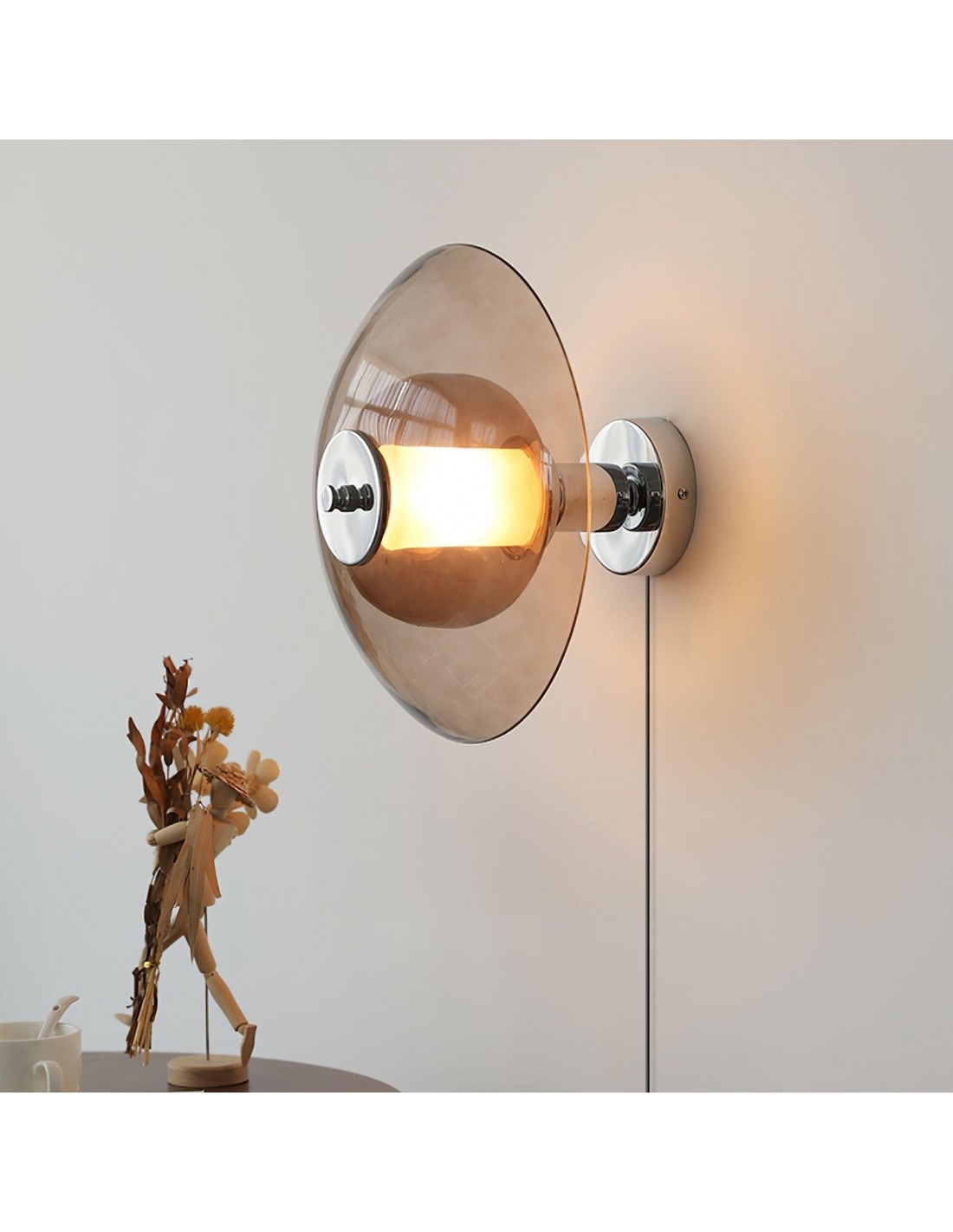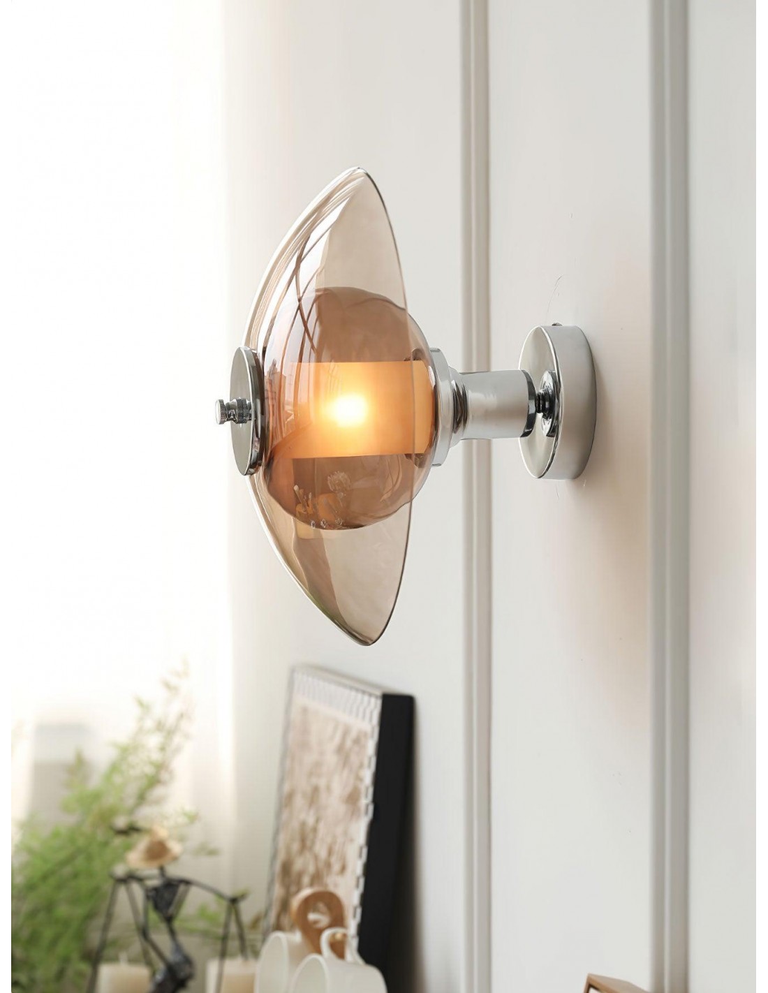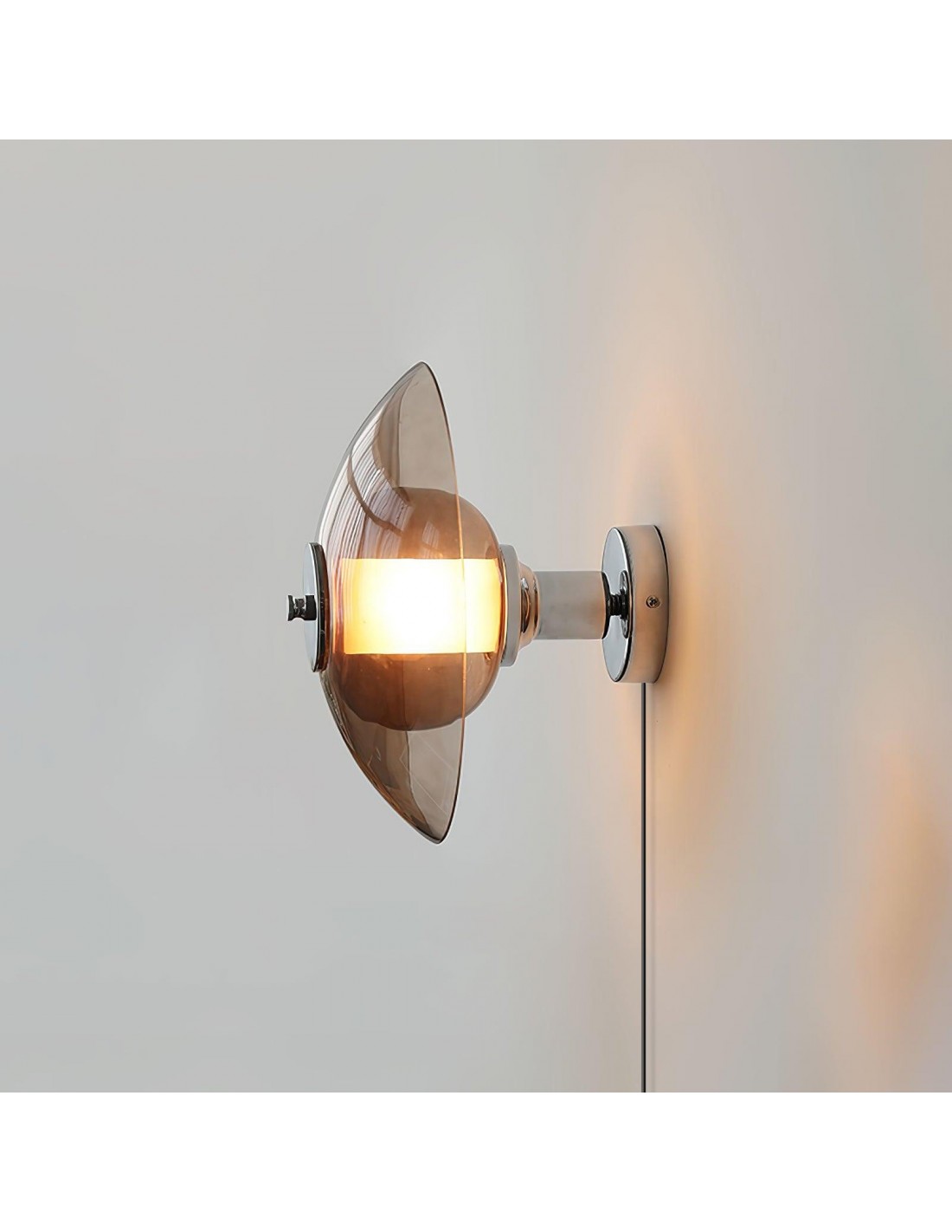 La lampada da parete Flying Saucer Chrome richiama con un pizzico di nostalgia di metà secolo infusa di eleganza contemporanea. Questa lampada presenta una finitura cromata lucida che completa perfettamente il suo paralume in vetro ambrato, che ricorda l'iconica silhouette UFO che ha catturato l'immaginazione per decenni.