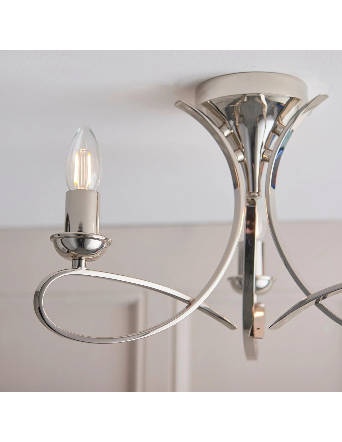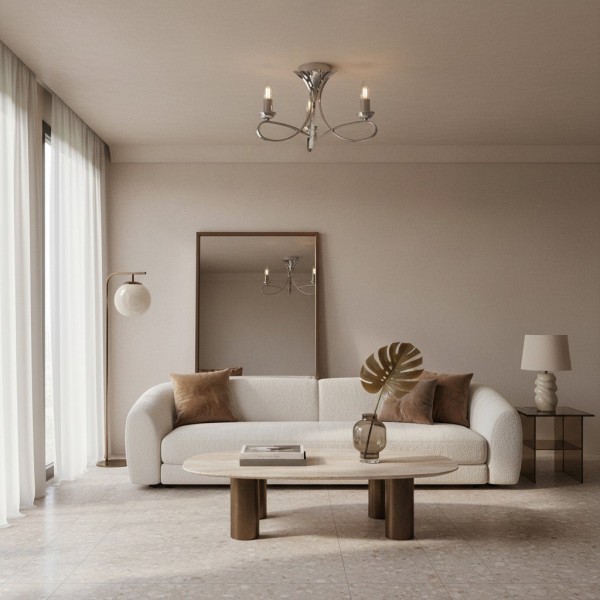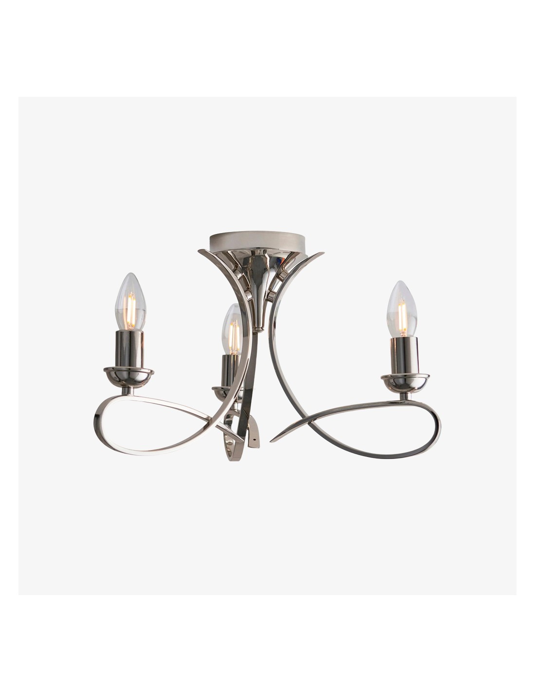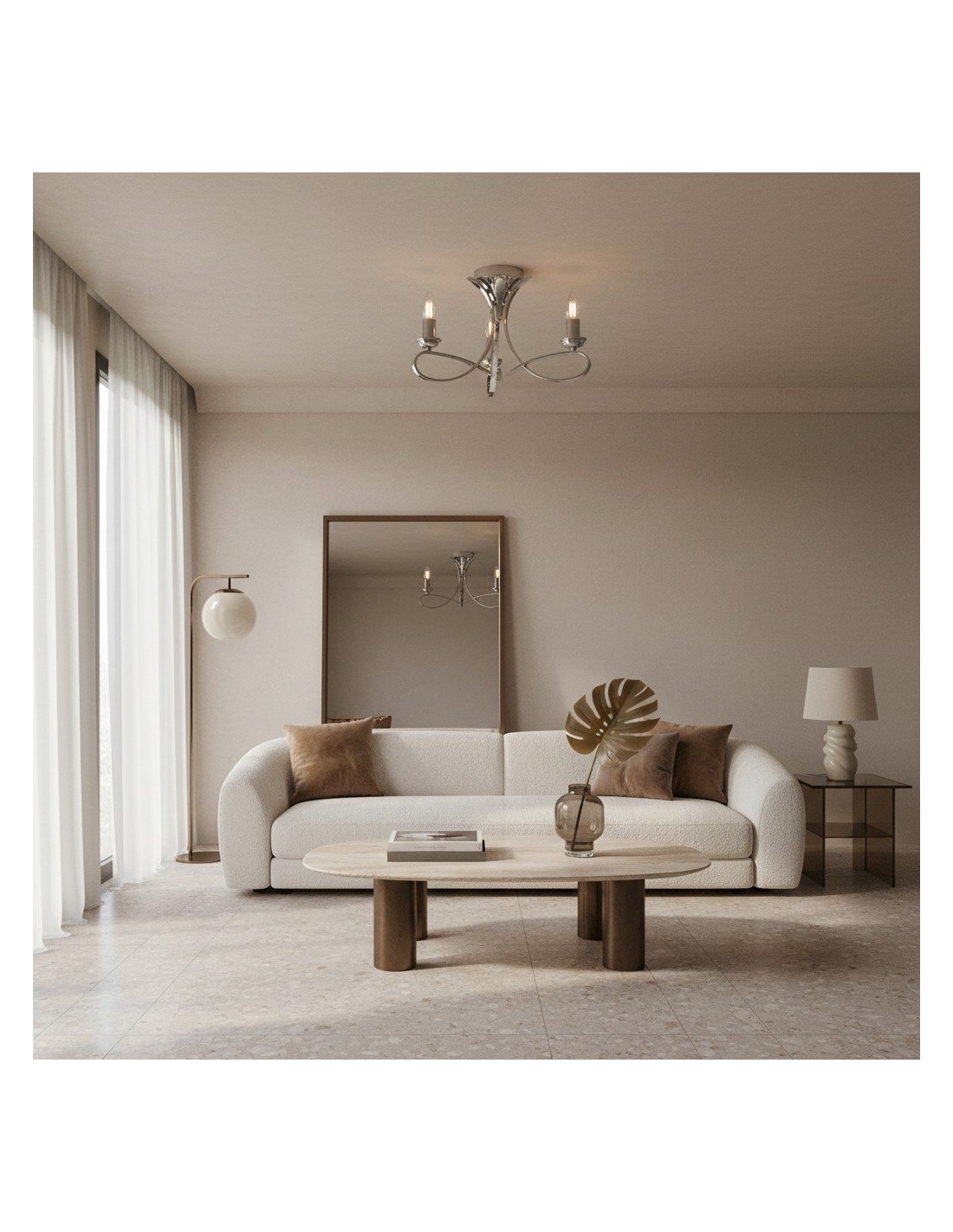 Valorizza il tuo spazio con la plafoniera semi-incassata Foline a 3 luci: un apparecchio elegante e raffinato, caratterizzato da ampi bracci curvi realizzati in acciaio con finitura nichel lucido. Grazie al montaggio a filo soffitto, la lampada mantiene un profilo discreto, pur aggiungendo una presenza decorativa e scultorea.