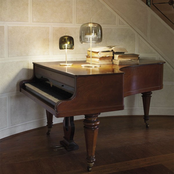 Fascino retrò. L'aspetto elegante e delicato del vetro soffiato trova una nuova dimensione in Jube. Due vetri affiancati, assemblati alla perfezione, tanto da sembrare un pezzo unico. Il risultato è una lampada sinuosa, formata da sovrapposizioni e con colori tono su tono che le conferiscono un mood prezioso e vintage. Dopo la sospensione, la collezione si arricchisce di due nuove versioni da tavolo, una nuova dimensione di sospensione e una nuova applique su vetro unico. Il paralume superiore in vetro è disponibile in quattro colori: fumé, terra bruciata, verde antico, cristallo, le finiture delle parti metalliche sono in oro satinato. Sorgente luminosa a LED.