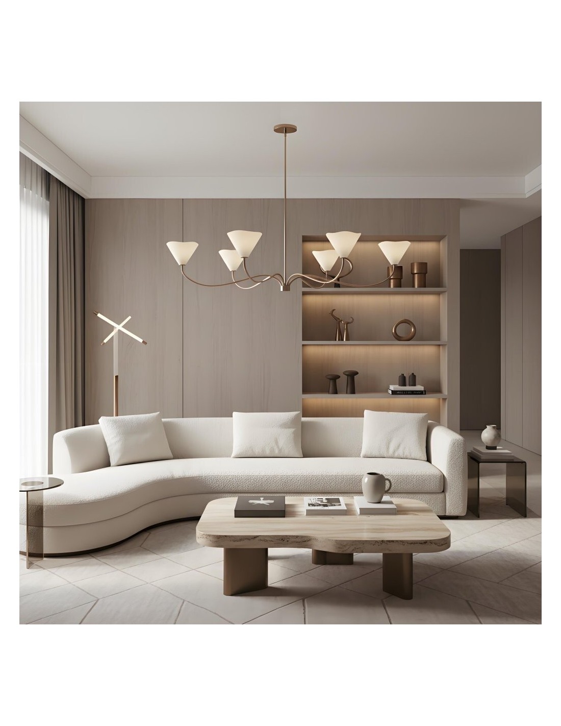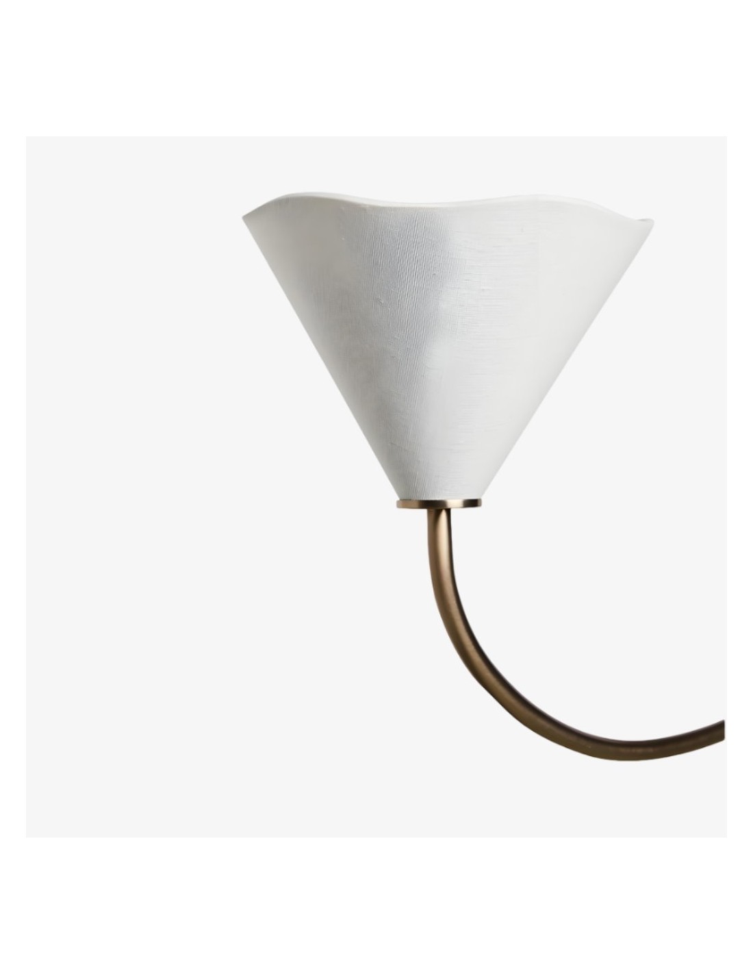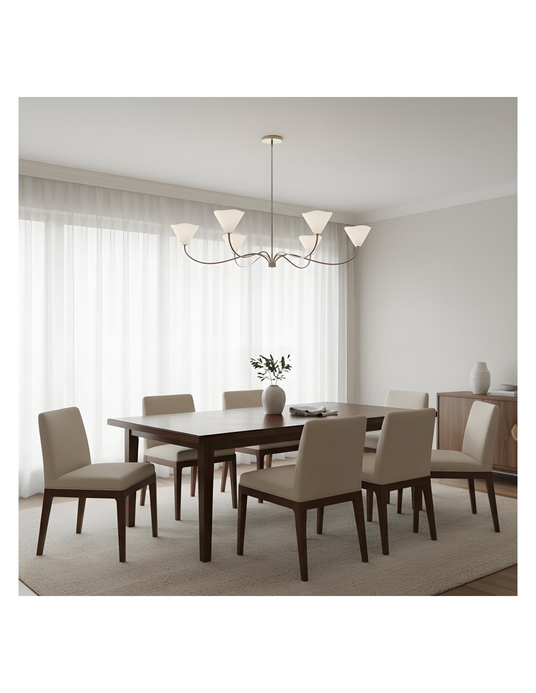 Questo lampadario Kysara presenta bracci sottili e curvi e un semplice paralume in tessuto, creando un elegante design geometrico floreale che si adatta perfettamente sia agli stili di arredamento classici che a quelli moderni. È la scelta ideale per tavoli da pranzo o ampi soggiorni.
