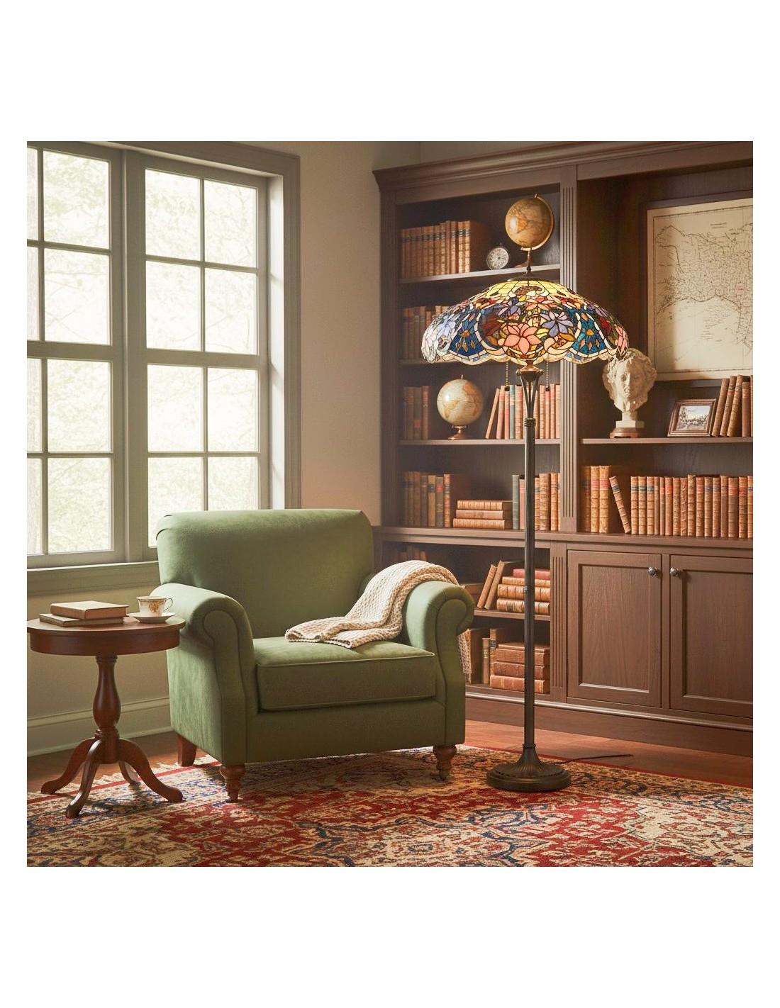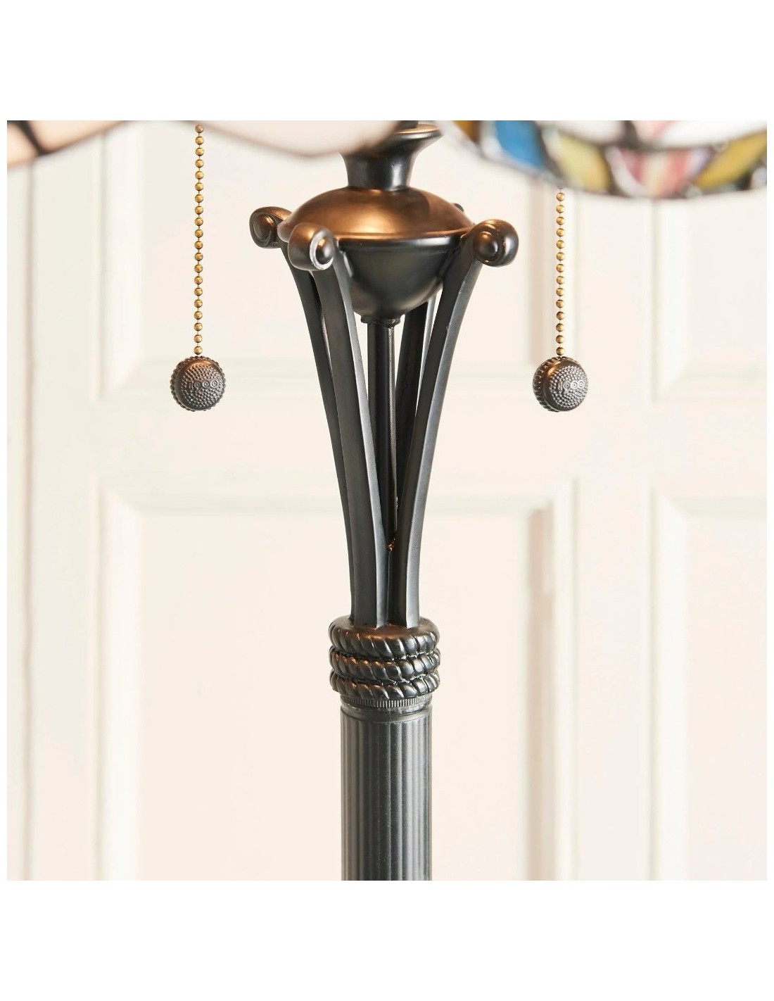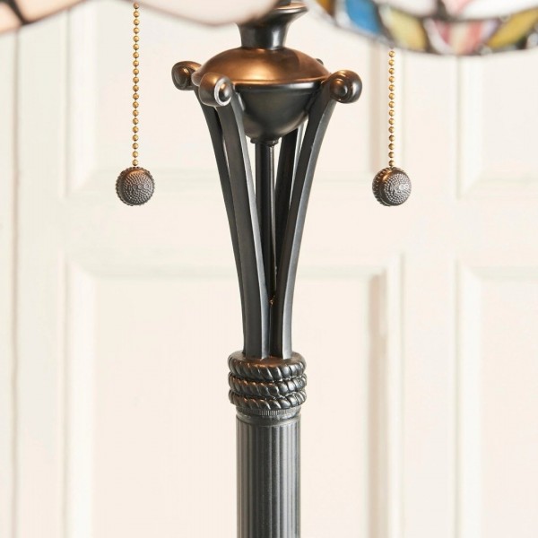 La lampada da terra Tiffany Sullivan presenta un paralume in vetro colorato lavorato a mano con un intricato motivo floreale. Irradia calore e funge da raffinata luce da lettura o da elegante elemento decorativo per il comodino o il soggiorno.