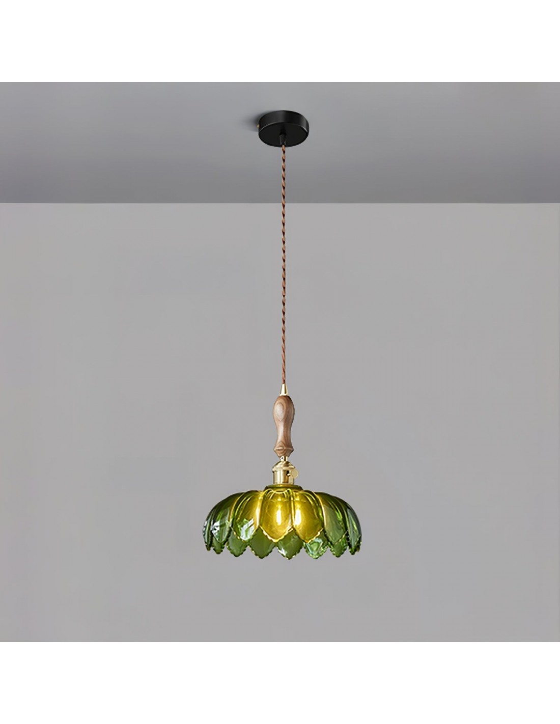 La lampada a sospensione Retro Petal Green trasuda fascino vintage con un tocco moderno. Il suo paralume in vetro verde è scolpito come delicati petali di fiori, mentre l'accento in legno aggiunge calore. Questa lampada a sospensione porta un tocco artistico in ogni stanza, perfetta per creare un'atmosfera morbida e stravagante.