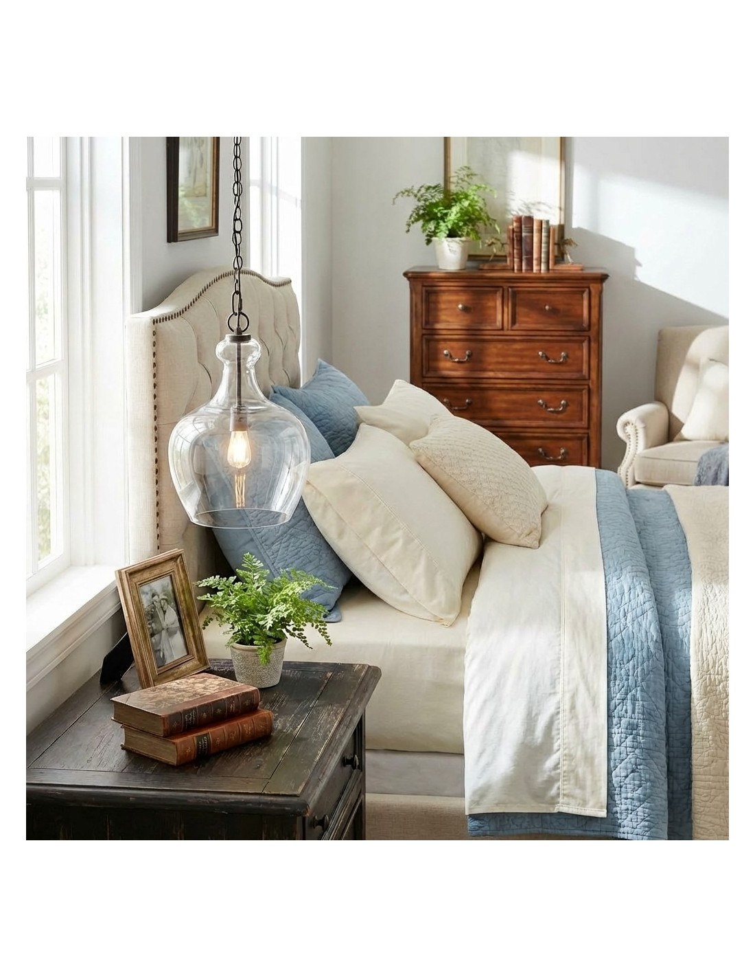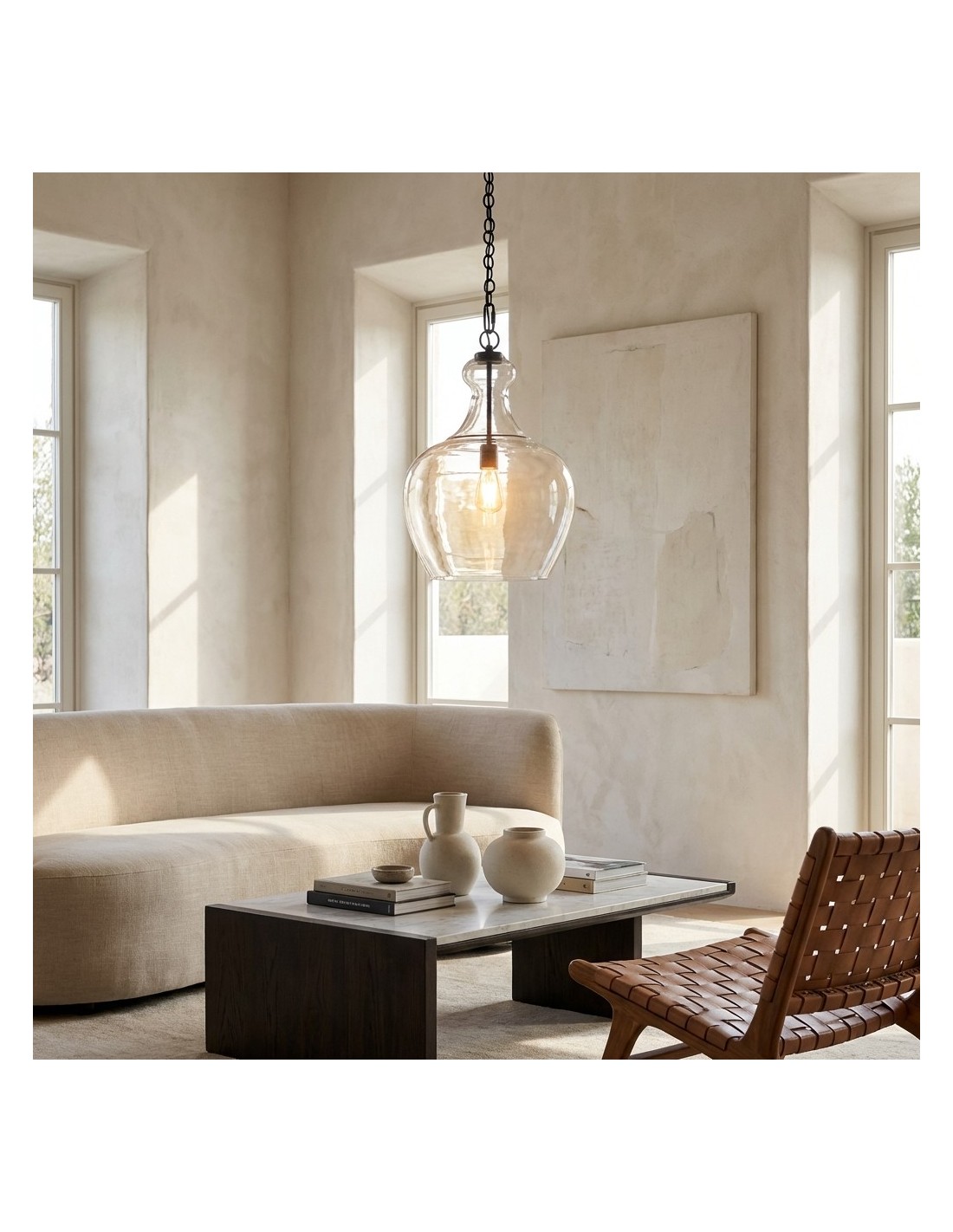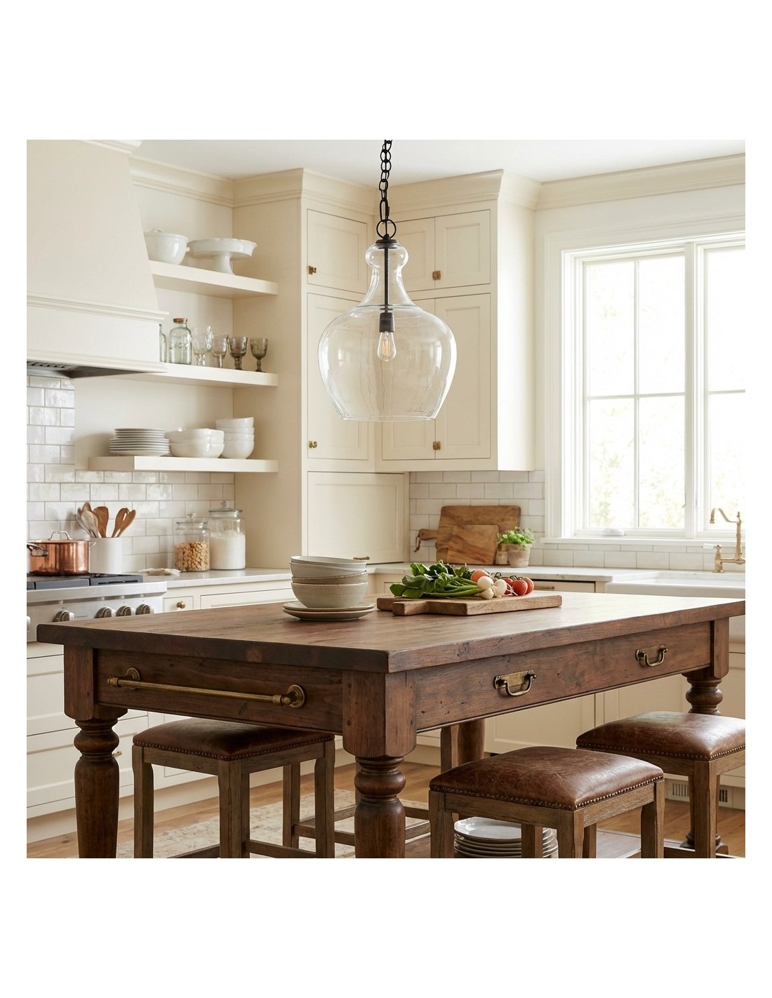 La lampada a sospensione Industrial Clear Glass combina una classica silhouette a campana con vetro trasparente soffiato a mano per un look luminoso e strutturato. Sospesa con una catena in stile vintage e realizzata in metallo resistente, dona un fascino rustico, rustico o industriale a cucine, sale da pranzo, loft e soggiorni.