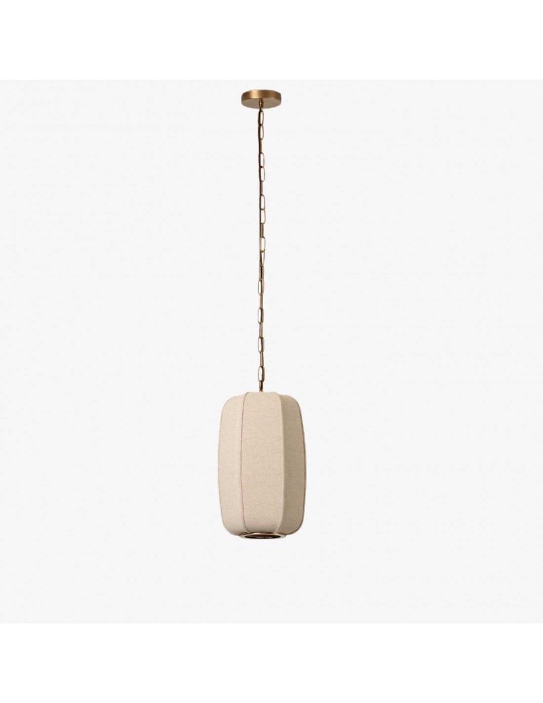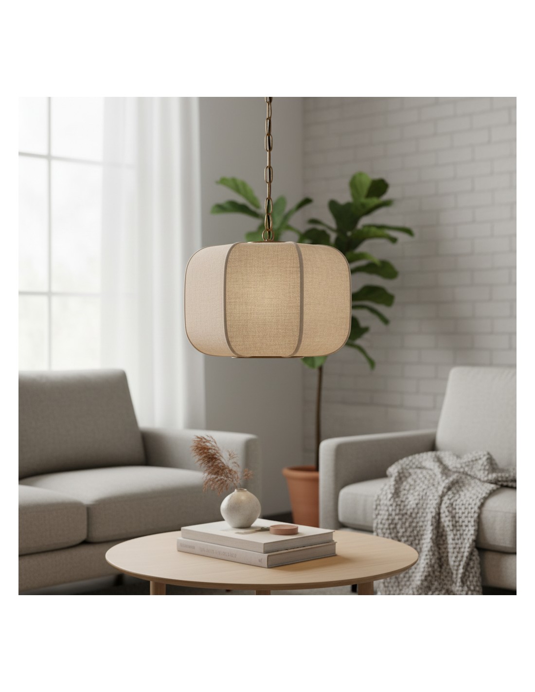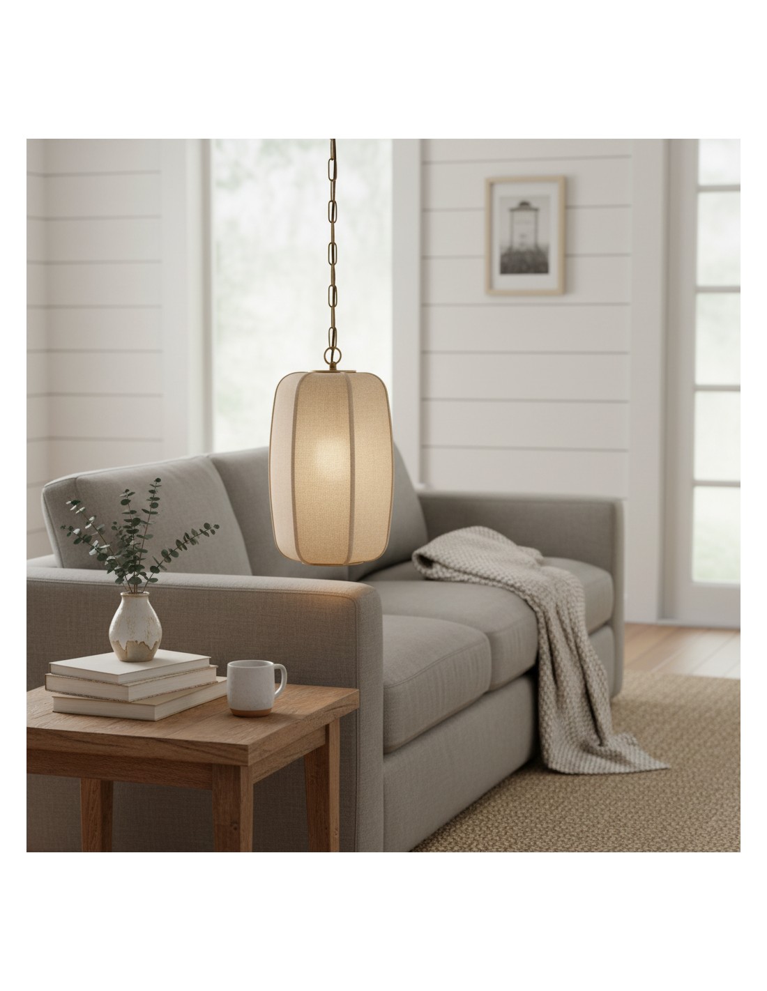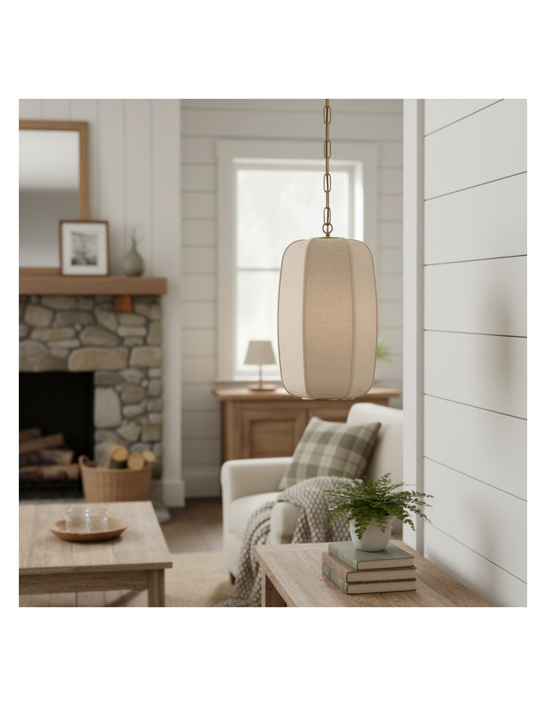La lampada a sospensione alta Loomis dona eleganza e calore a qualsiasi spazio. Caratterizzata da un paralume rivestito in lino testurizzato e da una finitura in ottone anticato, questa moderna lampada a sospensione offre un'illuminazione d'ambiente e un design sofisticato. Regolabile in altezza, è perfetta per sale da pranzo, cucine, camere da letto o ingressi, creando un tocco di stile.