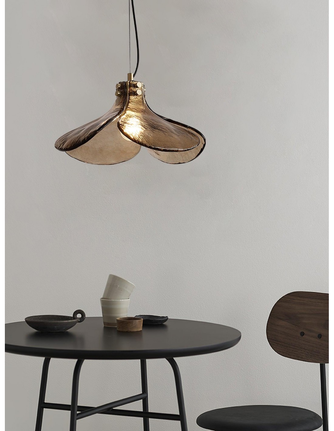 Lampada a sospensione vintage Clover del designer. Quattro foglie marroni compongono questo splendido pezzo realizzato in spesso vetro lavorato a mano.