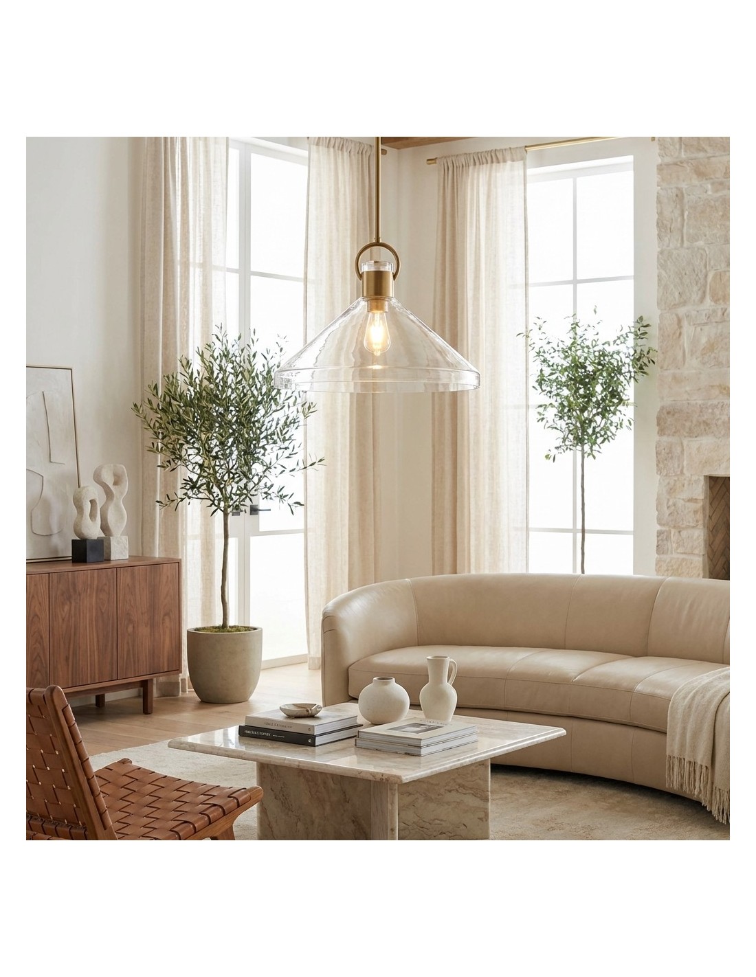 La lampada a sospensione Wide Cone in vetro trasparente presenta una sorprendente silhouette a cono largo realizzata in vetro trasparente. Abbinata a una robusta calotta in metallo, diffonde una luce brillante e uniforme, completando al contempo gli interni in stile industriale, moderno o minimalista. Perfetta per isole da cucina, tavoli da pranzo, bar o soggiorni in stile loft.