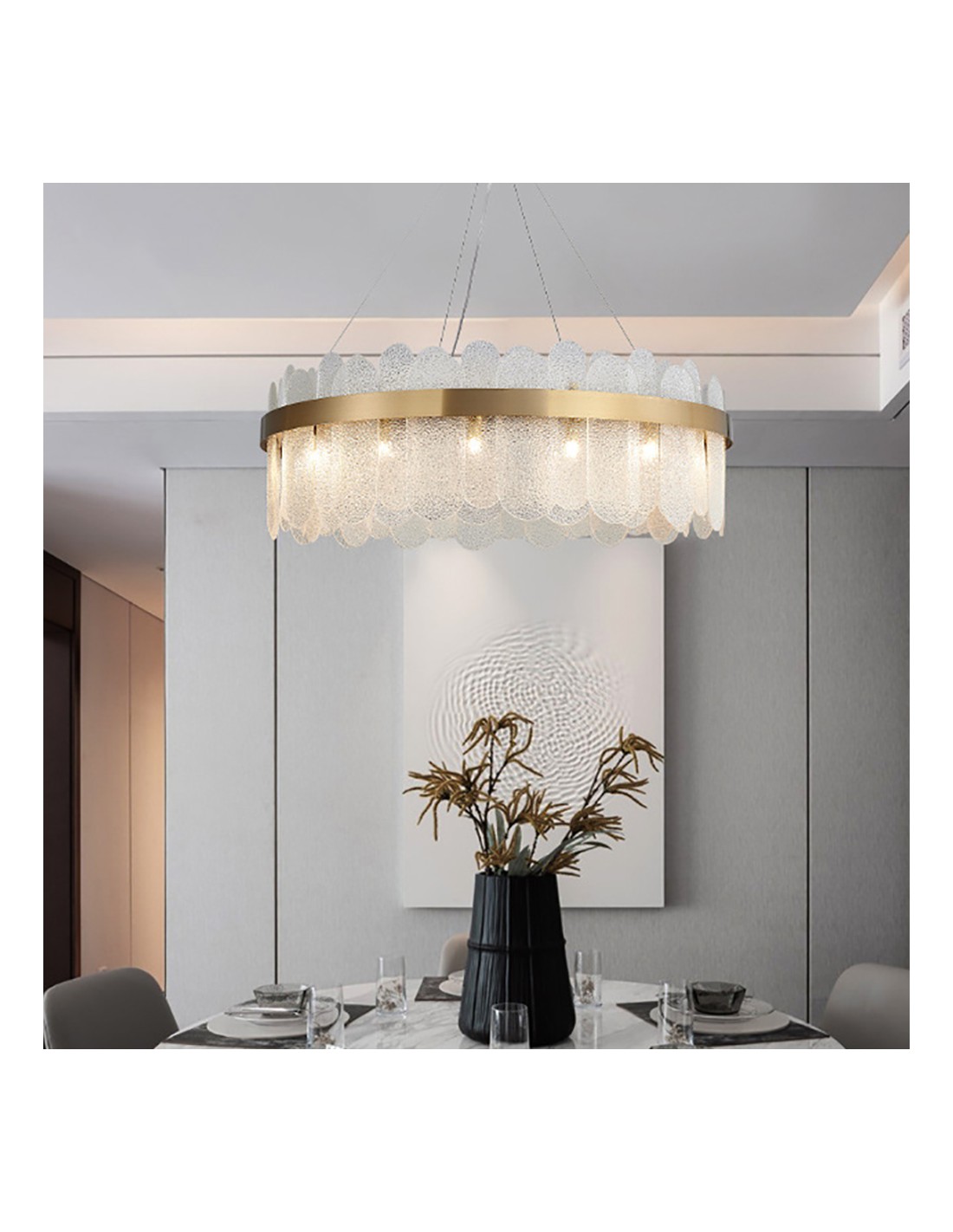 Il moderno lampadario rotondo in vetro è un meraviglioso pezzo di illuminazione. Il colore trasparente del vetro consente alla luce di brillare, creando un'atmosfera calda e invitante. Il lampadario rotondo a LED è disponibile in tre diverse dimensioni, con 6, 10 o 14 luci, rendendolo adatto a una varietà di spazi diversi. La lampada a sospensione rotonda è perfetta per l'uso in sale da pranzo, soggiorni e altre aree in cui si desidera creare un punto focale e aggiungere un tocco di glamour. Il design del lampadario è elegante e moderno, con una forma rotonda che è sia elegante che contemporanea. I paralumi in vetro sono disposti in un motivo circolare, creando uno straordinario effetto visivo che sicuramente impressionerà. Nel complesso, il moderno lampadario rotondo in vetro è un bellissimo e versatile pezzo di illuminazione che è perfetto per aggiungere un tocco di stile e raffinatezza a qualsiasi stanza.