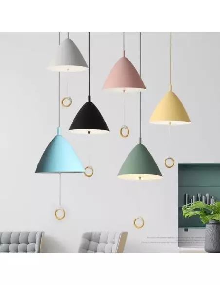 Ti offriamo 7 combinazioni di colori: Nero, Bianco, Grigio, Giallo, Blu, Verde, Rosa, 3 dimensioni del corpo: Diametro 27 cm/33 cm/40 cm. Lampade a sospensione coniche, lampadari e illuminazione elegante, aggiungono una raffinatezza aerodinamica alla tua casa o al tuo ufficio. La lampada a sospensione è un corpo in alluminio pressofuso verniciato nero opaco rivestito con una vernice trasparente soft touch che fornisce luce diffusa. La lampada ha il suo interruttore.