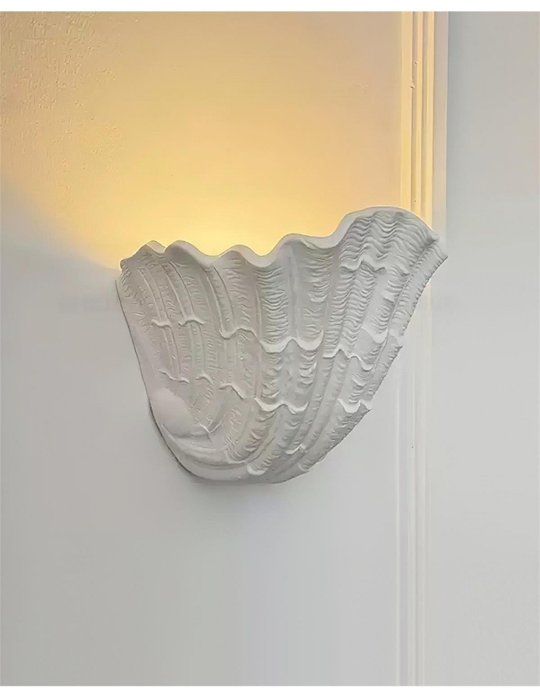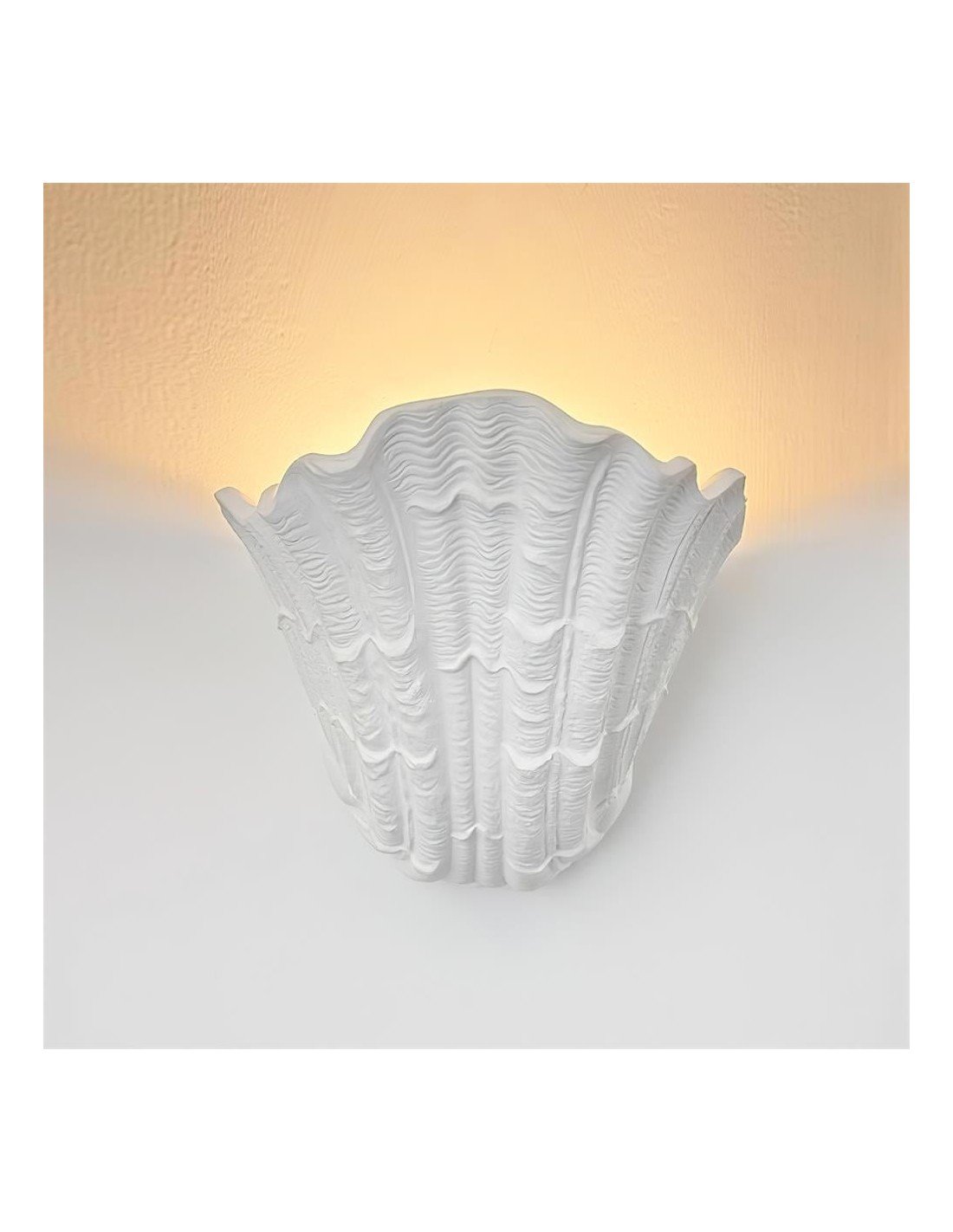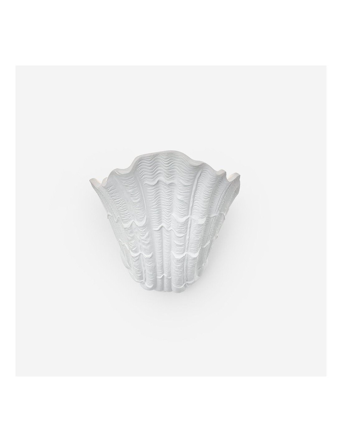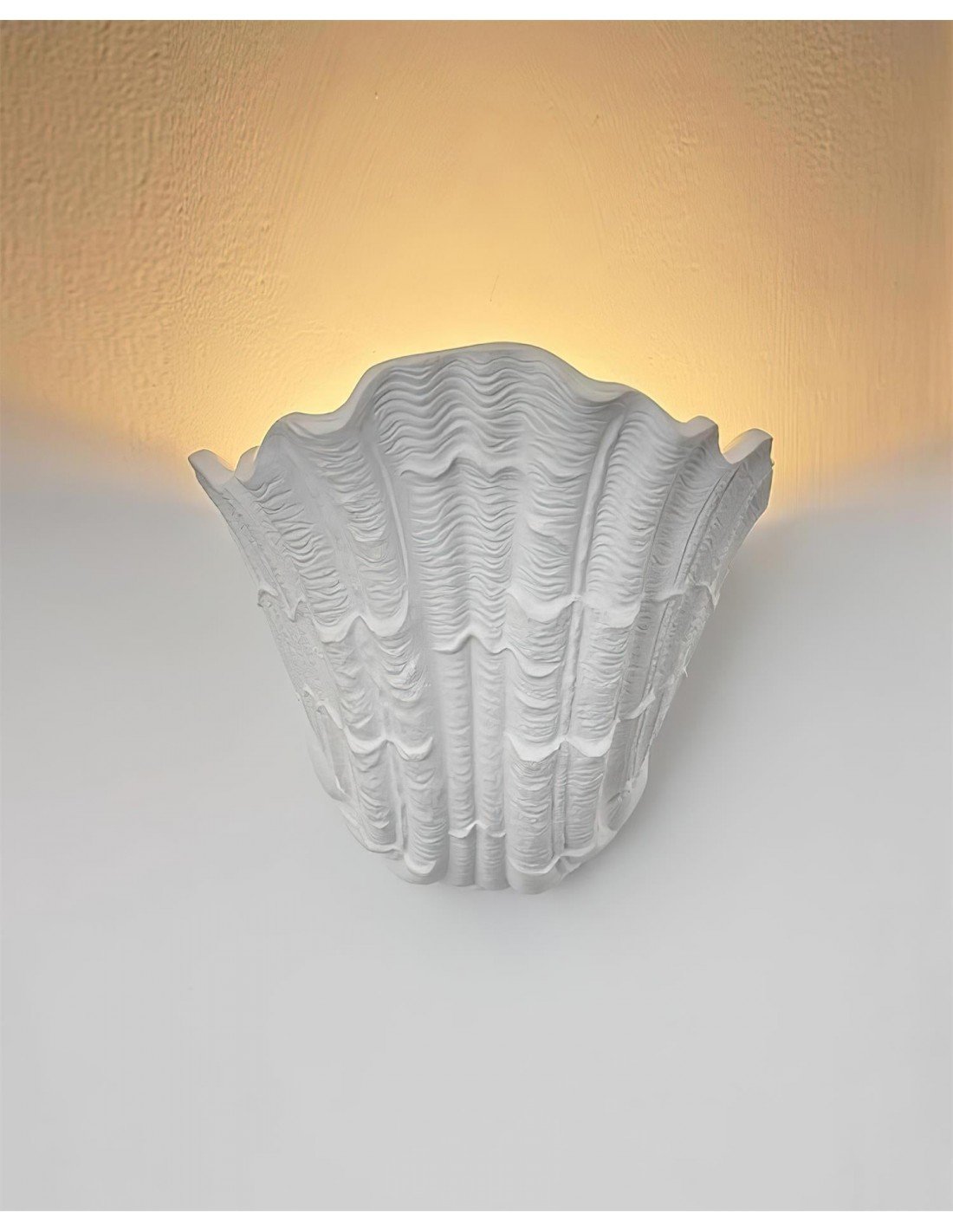 L'ispirazione per il design di questa lampada da parete in gesso Shell trae chiaramente ispirazione dalla forma naturale di una conchiglia. I bordi smerlati, le linee e le creste che ne richiamano la texture, e la forma organica a coppa, richiamano questa influenza marittima. La luce che emana dall'interno esalta ulteriormente questa immagine, suggerendo un bagliore soffuso che emana dall'interno di una conchiglia trovata sulla spiaggia. Evoca un senso di oceano, natura e bellezza organica, conferendo un tocco di estetica costiera o marina a qualsiasi spazio interno.
