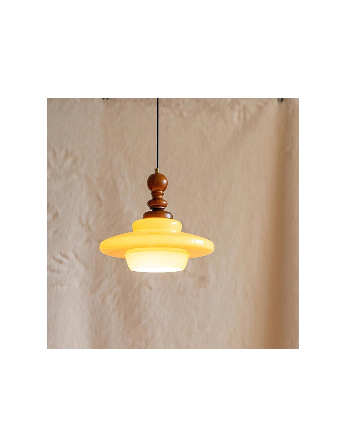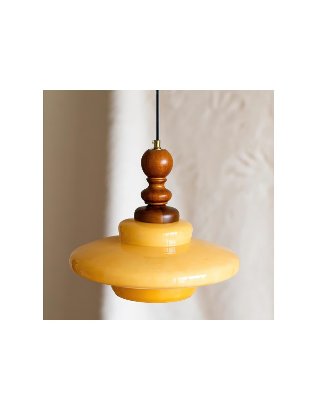 Prova il calore e la nostalgia della lampada a sospensione Medieval Cream Glass, una fusione di eleganza vintage e design moderno. Caratterizzata da un paralume in vetro giallo senape con una parte superiore in legno splendidamente lavorata, questa lampada diffonde una luce rilassante e ambientale, ideale per qualsiasi spazio abitativo.