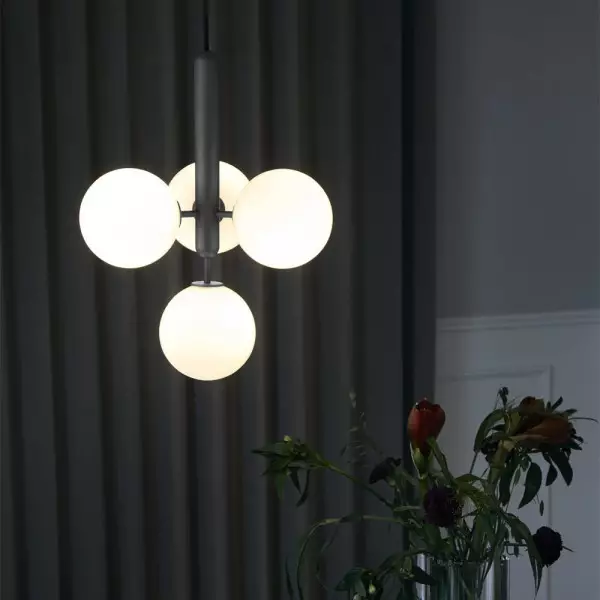 Composto da quattro sfere di vetro soffiato a bocca e da un'elegante struttura in metallo lavorato, il design della Miira 4 Pendant trasuda equilibrio e profondità. La versione in vetro ottico trasparente, con il suo esclusivo motivo in rilievo, porta una luce e un'atmosfera giocose nella stanza, mentre la versione in vetro opalino ha un intrinseco senso di calore. La Miira 4 Pendant Light è dotata di una piastra da soffitto coordinata e di un cavo in tessuto lungo 150 cm. Sono disponibili anche la Miira 1 Pendant Light e la Miira Wall Lamp. Sorgente luminosa non inclusa.