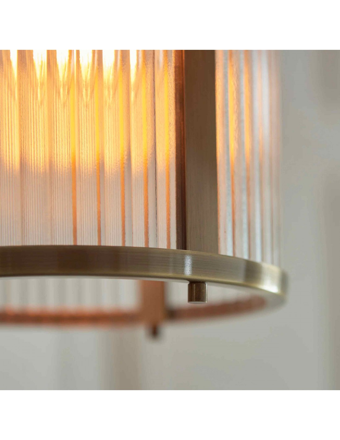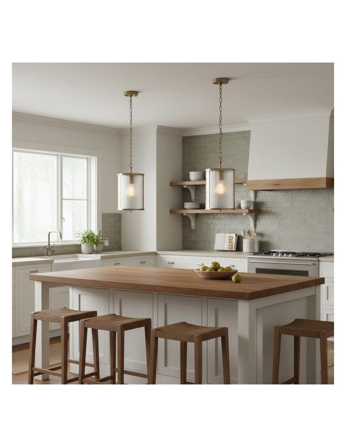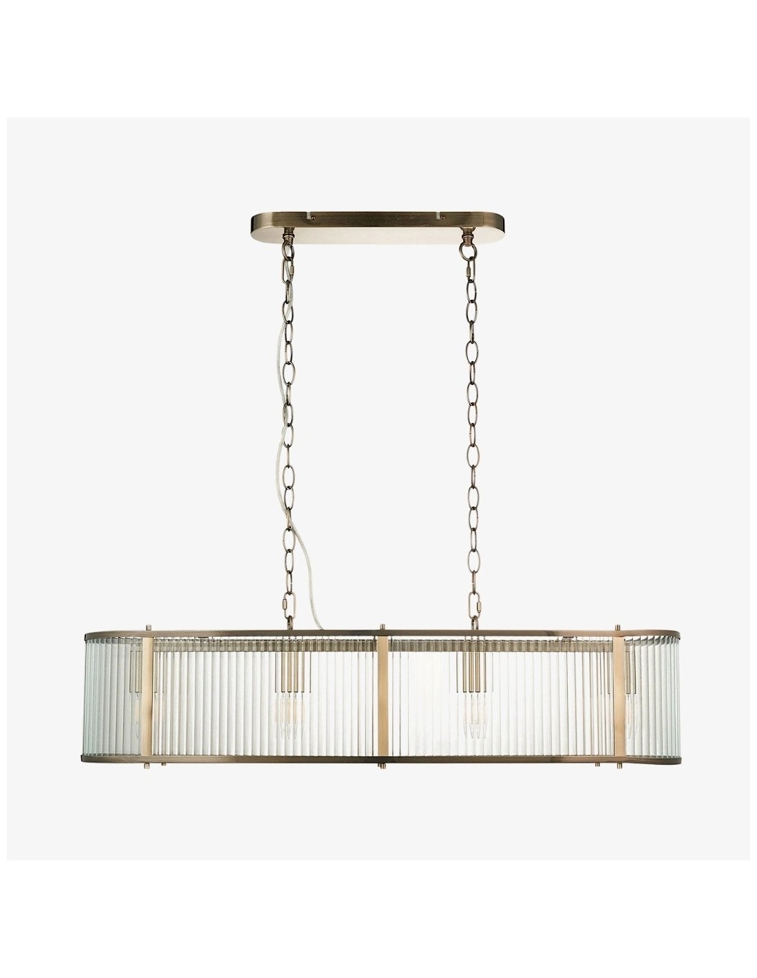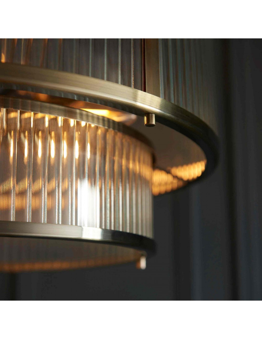 La lampada a sospensione abbina paralumi in vetro scanalato e testurizzato a un elegante rosone in metallo per creare una luce morbida e filtrata. Disponibile in configurazioni singole, a 3, 4 o 5 luci, ogni apparecchio è regolabile in altezza. Senza tempo ma contemporaneo, si adatta a isole cucina, sale da pranzo, bar e spazi dedicati all'ospitalità.